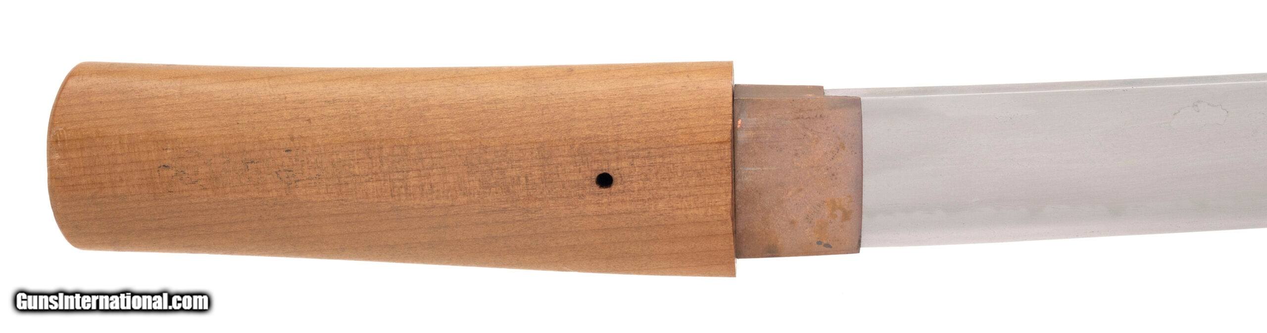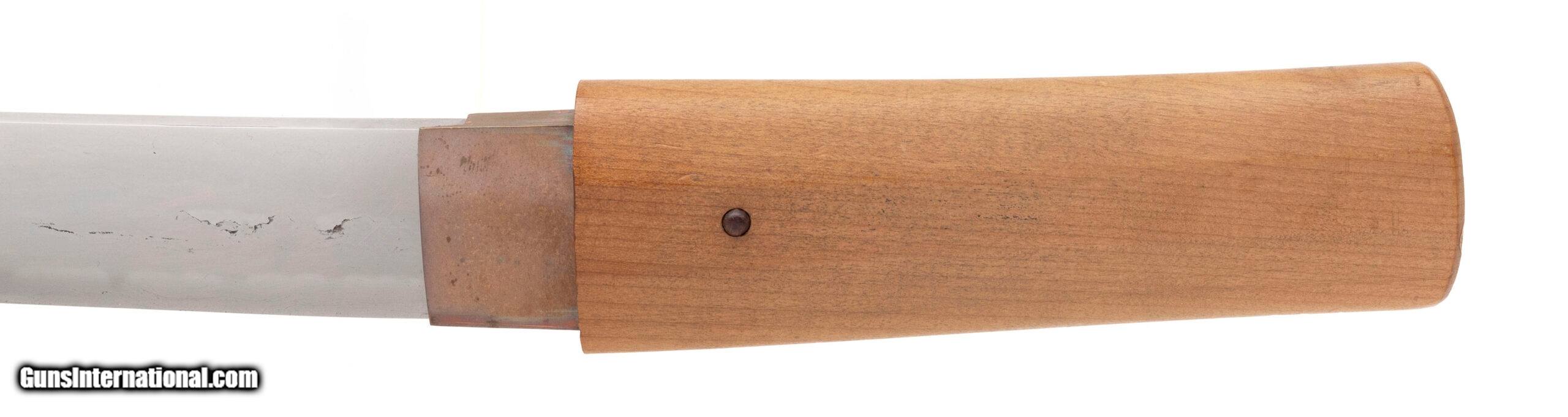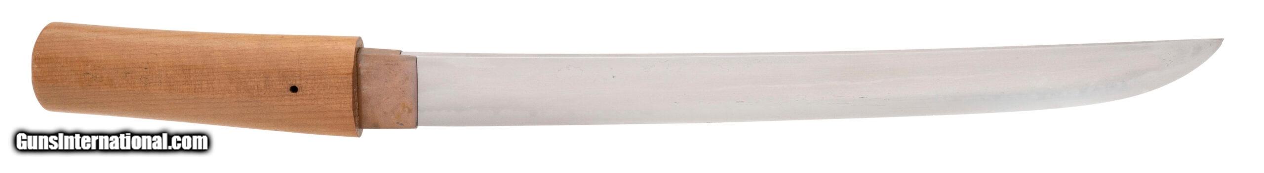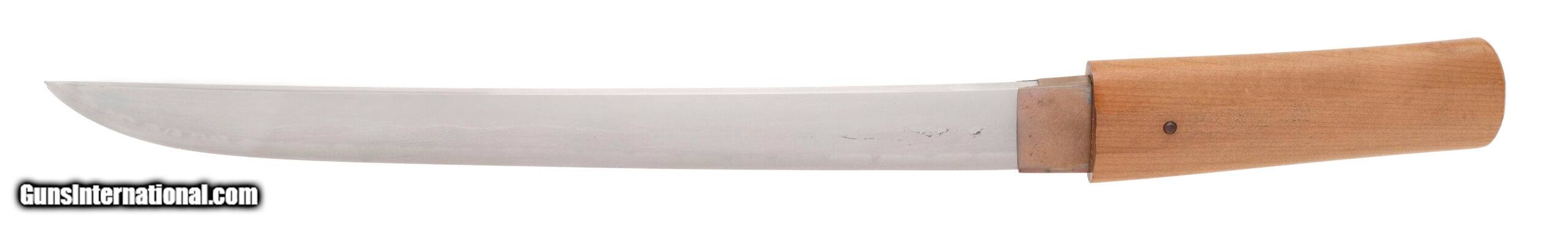 Description: "Signed ?????? (Watanabe Norichiyo saku) Nagasa: 36.4 cm (14 5/16") Nakago: one mekugi-ana, patinated, signed Sugata: straight to shallow-curved ko-wakizashi with standard kissaki Era: Edo period, Shinto era (17th–18th century) Mounts: simple copper habaki, shirasaya section This ko-wakizashi is signed by the otherwise little-recorded smith Watanabe Norichiyo, whose name does not appear in the standard modern indices, suggesting either a provincial maker or a rare signature variant. The blade has a straight to very shallow-curved form typical of mid-Shinto work, with a suguha to shallow notare hamon visible in the current hybrid polish. The nakago shows appropriate age patina and well-cut mei. Condition: The blade remains in solid polish with the hamon visible, though there are scattered kitae-ware and a small chip at the kissaki;. Price: $2,995.00 Contact Seller |