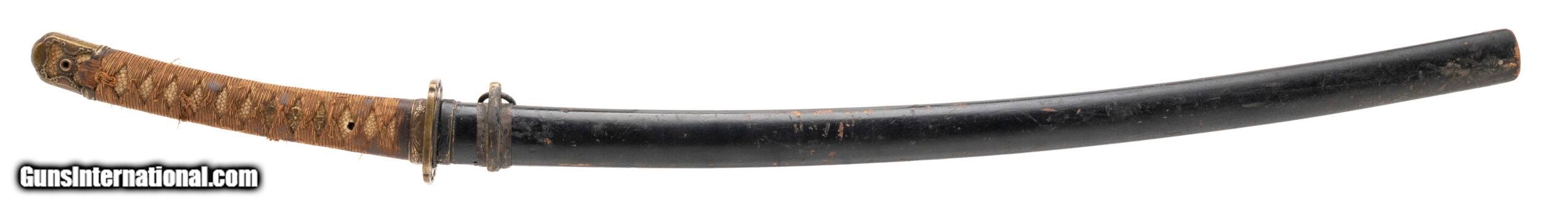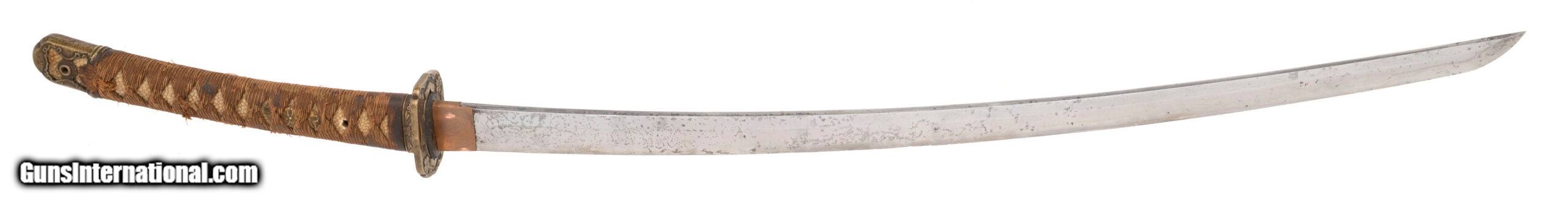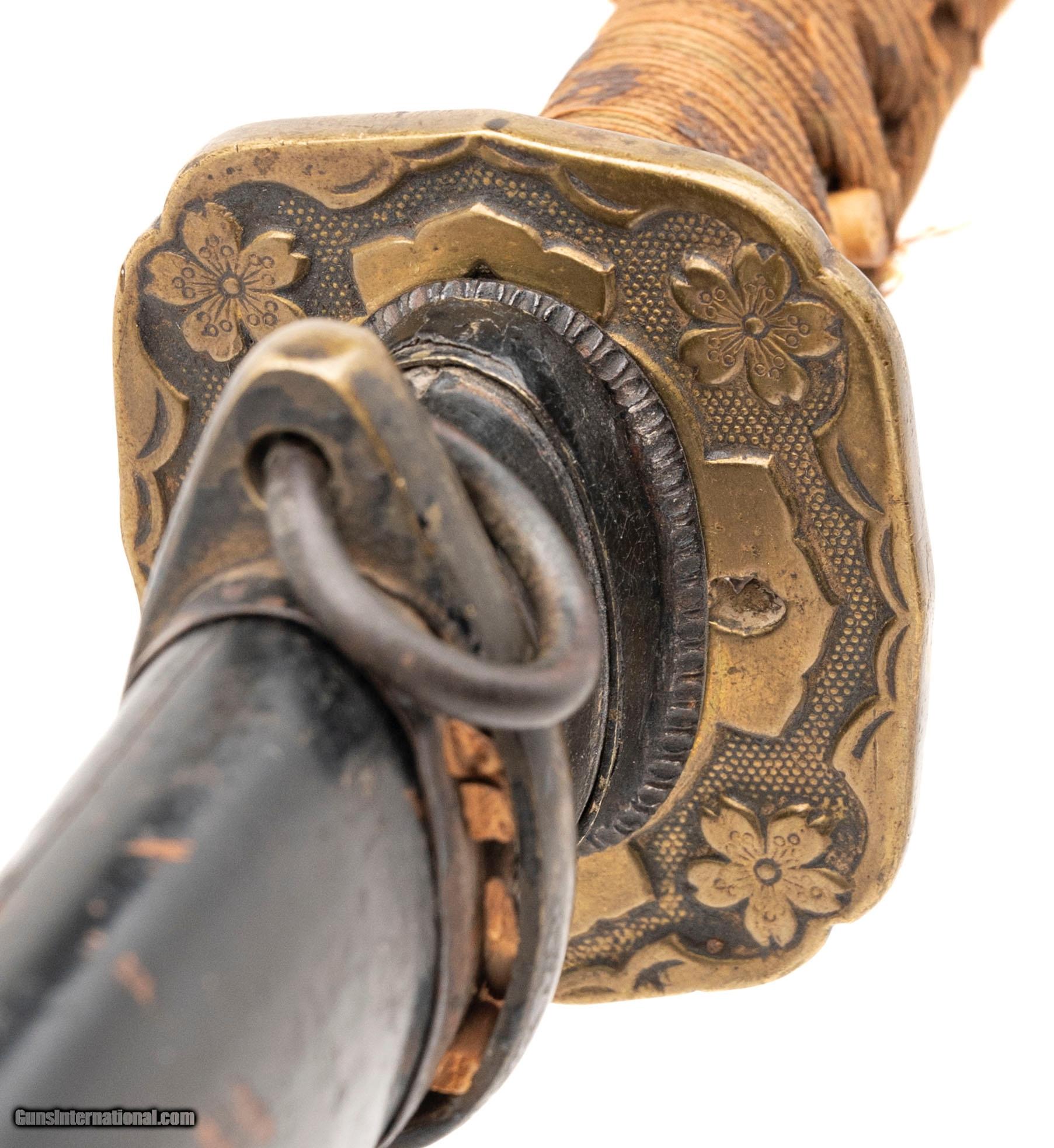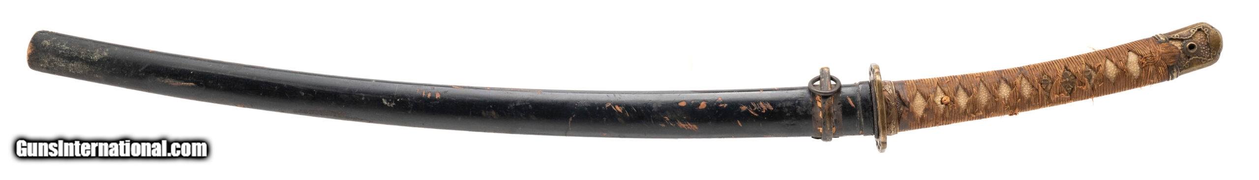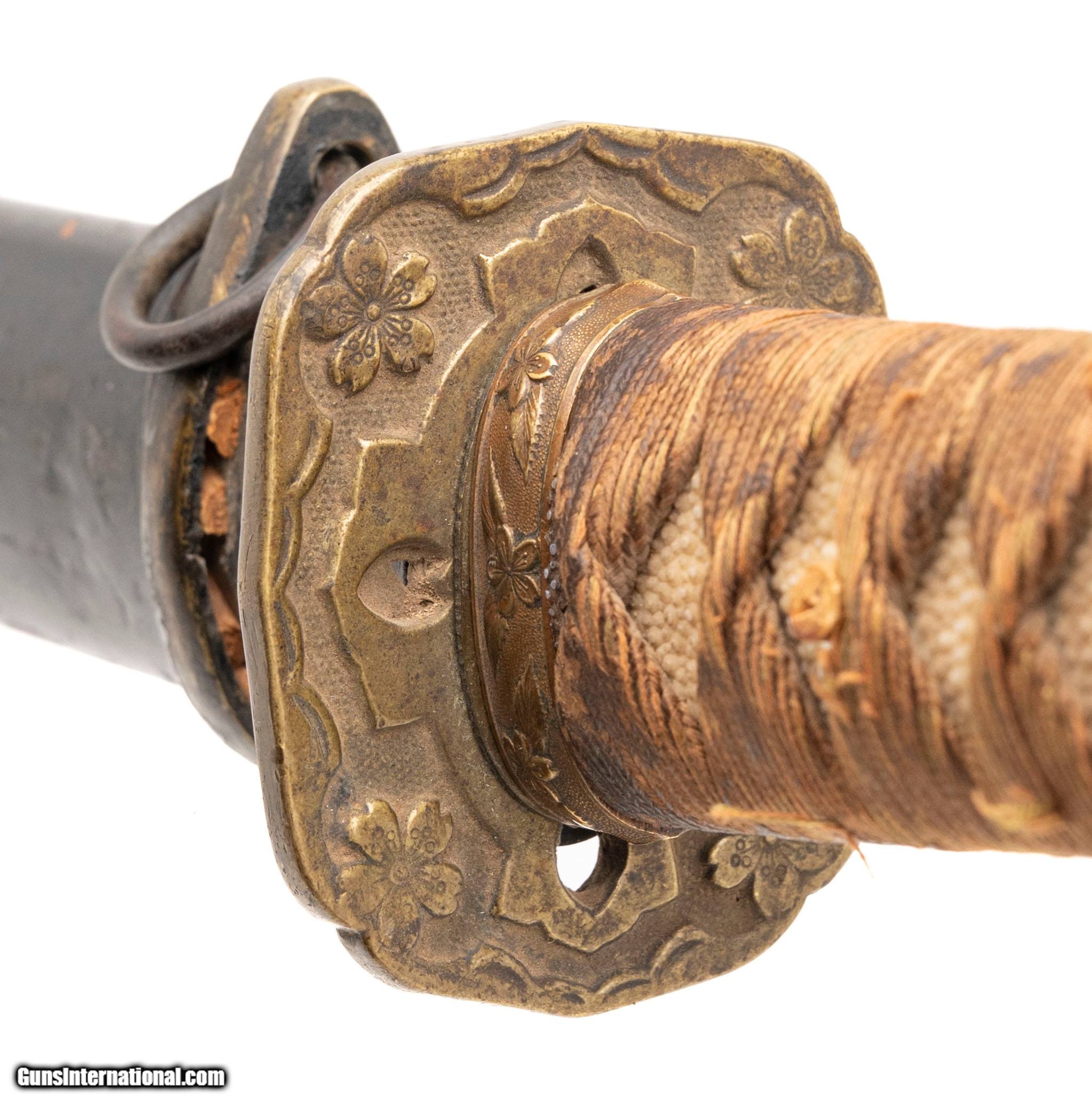 Description: "Period: Showa era, c. 1930s–1940s Signature (mei): ??? — Kaneshige saku (“made by Kaneshige") on the nakago (one mekugi-ana, sujikai yasurime). Blade (nagasa): 25.75 in. (short katana / long wakizashi range) Mounts: Mixed civilian-style koshirae; black lacquer saya with age and handling wear; copper habaki; iron/soft-metal tsuba; floral-engraved fuchi; tsuka wrapped in brown ito over same. Description: Showa-period signed blade by a smith using the name Kaneshige. The sword has healthy curvature and a medium kissaki. Surface shows scattered pitting and an older, uneven polish that makes the hamon and hada subdued in areas; temper is visible in hand under raking light. Nakago patina is correct for age and the signature cuts are consistent with Showa-era work. Condition: Good as-found overall for age. Blade with scattered pits/oxidation, scratches, and cloudy older polish; mounts worn but complete enough for display. No edge chips noted in a quick inspection; sold as is and unpolished. A professional polish would greatly improve the visibility of the hamon/hada; buyers should assume no guarantees on papering without further examination. Notes: Multiple smiths signed Kaneshige in the Showa period. This example is offered as a signed Showa-era sword; we make no representation as to specific smith school without shinsa. Traditional vs. non-traditional manufacture is undetermined from the present polish. Measurements (known): • Nagasa: 25.75" (measured to the munemachi) • Nakago: one mekugi-ana; diagonal file marks (sujikai) Included: sword, koshirae as shown. Price: $1,495.00 Contact Seller |