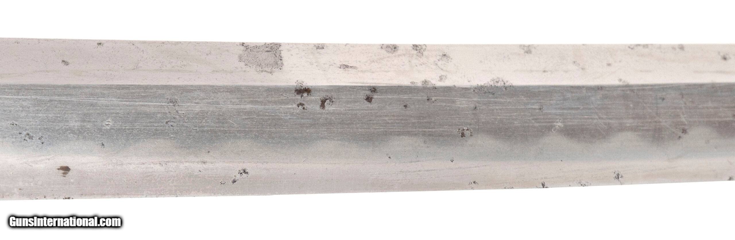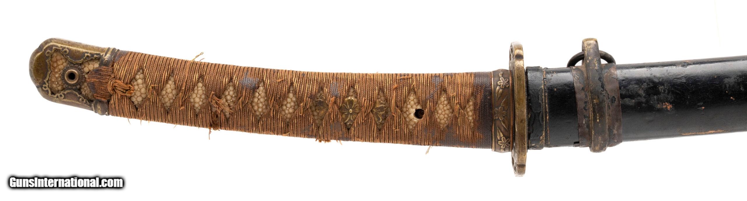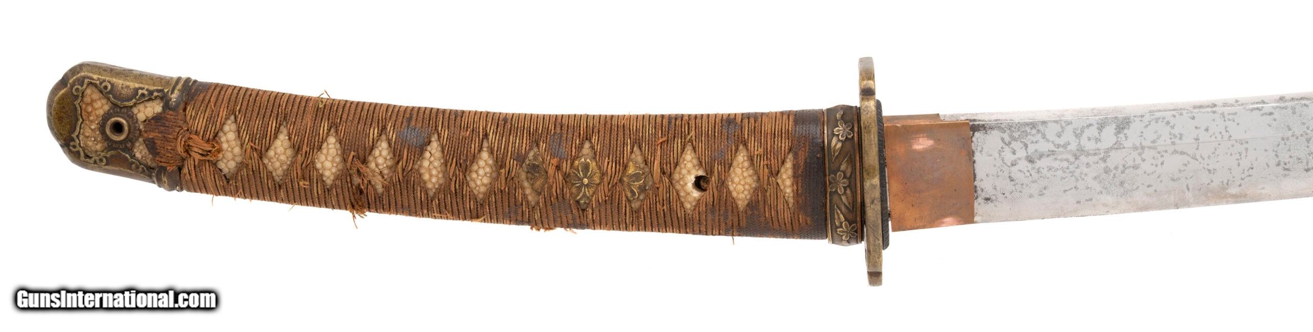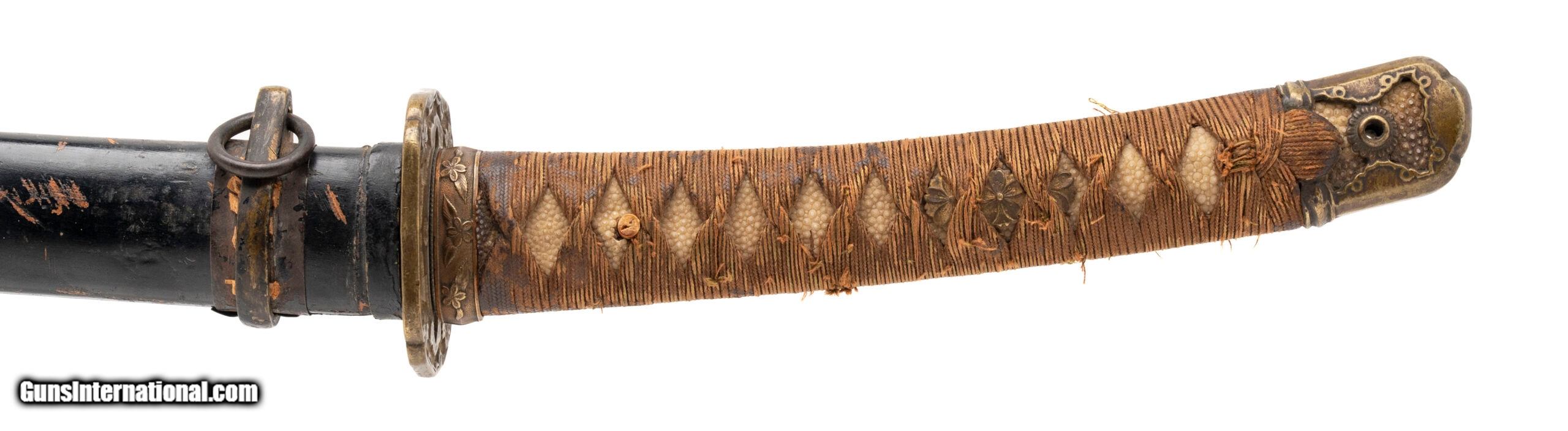 Description: "Period: Showa era, c. 1930s–1940s Signature (mei): ??? — Kaneshige saku (“made by Kaneshige") on the nakago (one mekugi-ana, sujikai yasurime). Blade (nagasa): 25.75 in. (short katana / long wakizashi range) Mounts: Mixed civilian-style koshirae; black lacquer saya with age and handling wear; copper habaki; iron/soft-metal tsuba; floral-engraved fuchi; tsuka wrapped in brown ito over same. Description: Showa-period signed blade by a smith using the name Kaneshige. The sword has healthy curvature and a medium kissaki. Surface shows scattered pitting and an older, uneven polish that makes the hamon and hada subdued in areas; temper is visible in hand under raking light. Nakago patina is correct for age and the signature cuts are consistent with Showa-era work. Condition: Good as-found overall for age. Blade with scattered pits/oxidation, scratches, and cloudy older polish; mounts worn but complete enough for display. No edge chips noted in a quick inspection; sold as is and unpolished. A professional polish would greatly improve the visibility of the hamon/hada; buyers should assume no guarantees on papering without further examination. Notes: Multiple smiths signed Kaneshige in the Showa period. This example is offered as a signed Showa-era sword; we make no representation as to specific smith school without shinsa. Traditional vs. non-traditional manufacture is undetermined from the present polish. Measurements (known): • Nagasa: 25.75" (measured to the munemachi) • Nakago: one mekugi-ana; diagonal file marks (sujikai) Included: sword, koshirae as shown. Price: $1,495.00 Contact Seller |