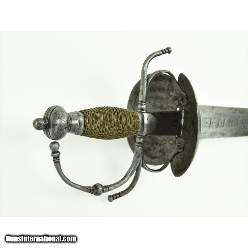 Description: "Spain or Napoli Rapier. Blade: 34.3" long, marked ENRIQUE CUEL and on the other side EN ALEMANIA. Base of blade stamped E cross H under guard marked. Brass wire grip. SOLD |