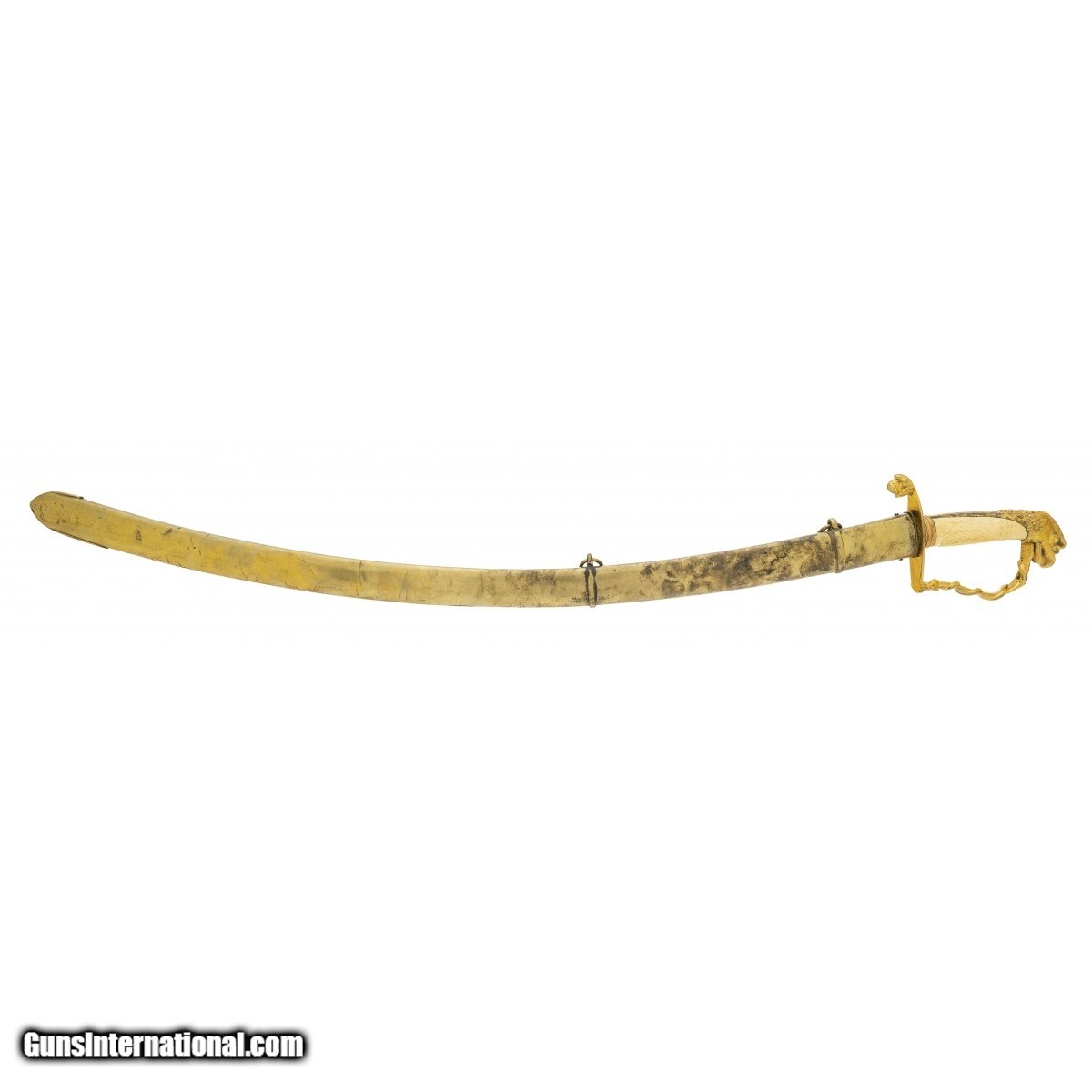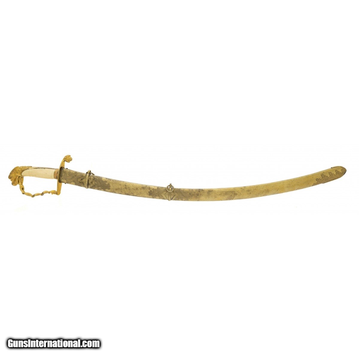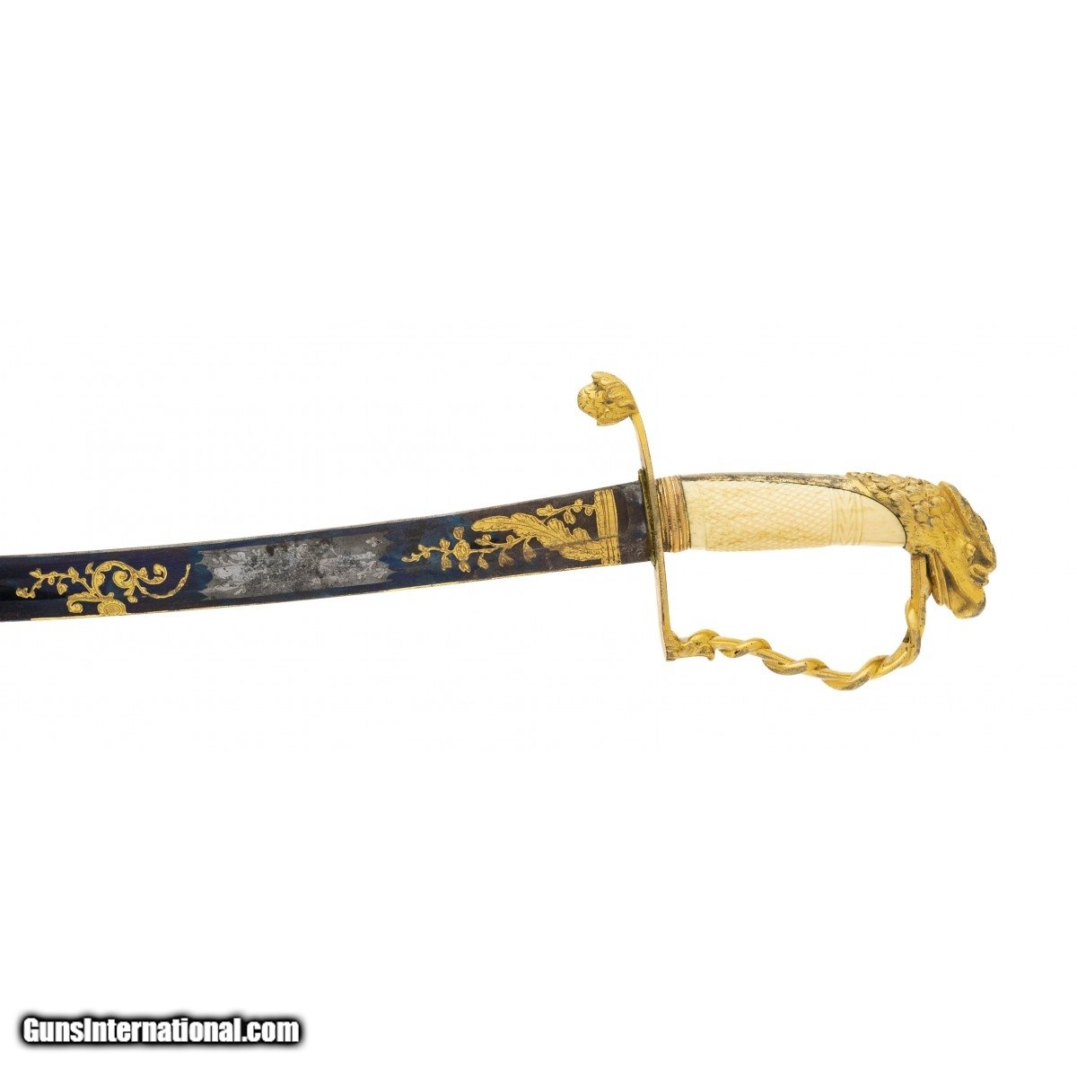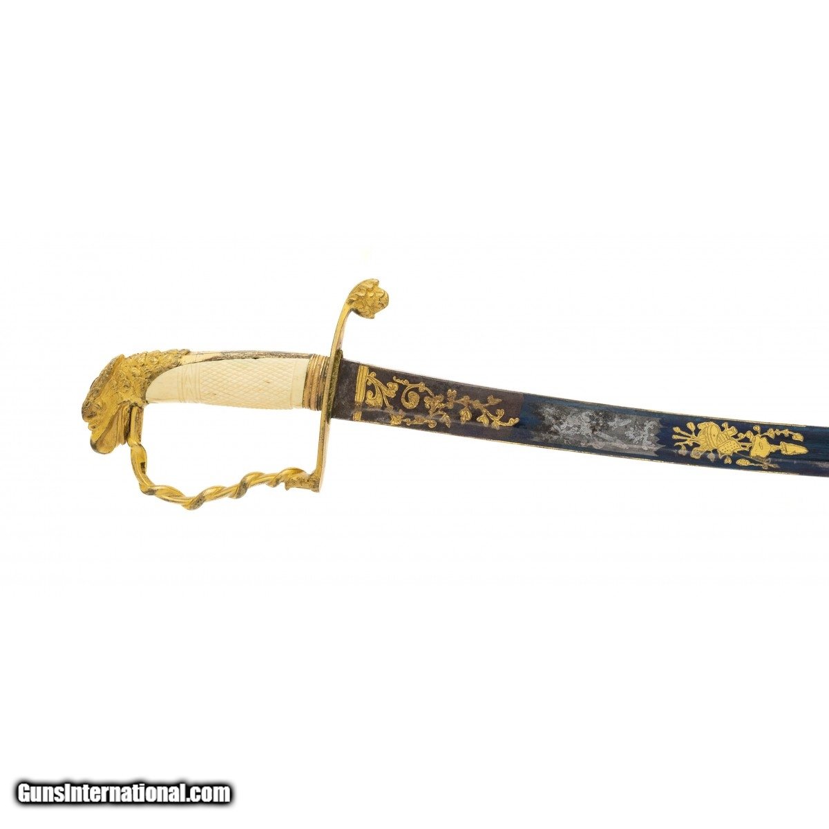 Description: " Circa 1800 to 1820. Eagle head sword with 31"" blade and 36.5"" overall length. Blade has 85% of original bluing, vibrant etching and inlay, with lite oxidation in spots and lite battle wear. Hilt has engraved ivory handle with small chip near eagle head pommel. Comes with engraved brass scabbard. SOLD |