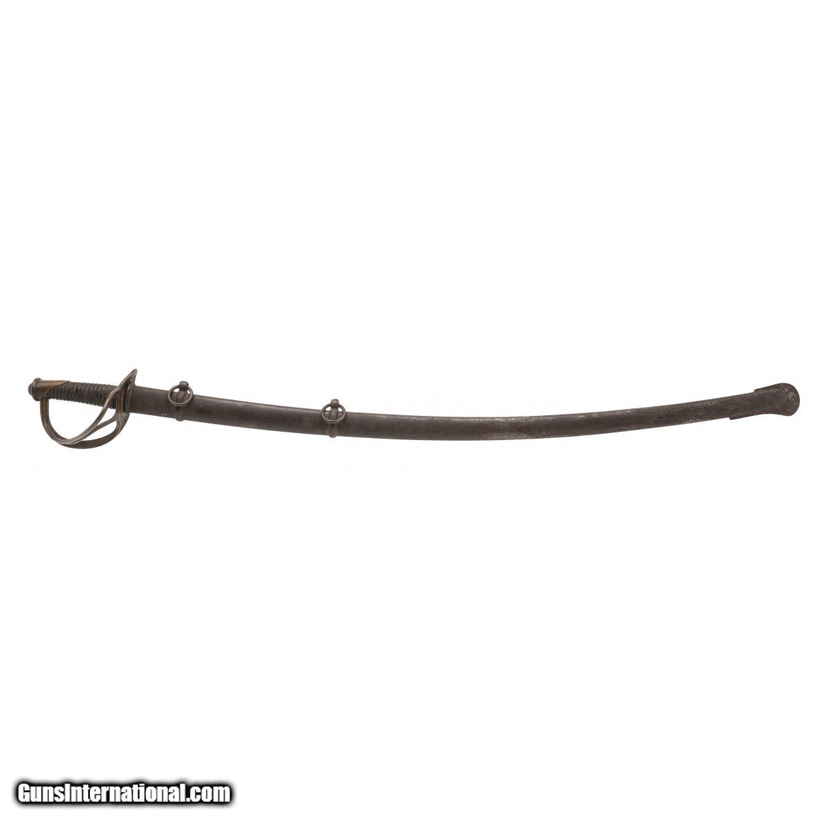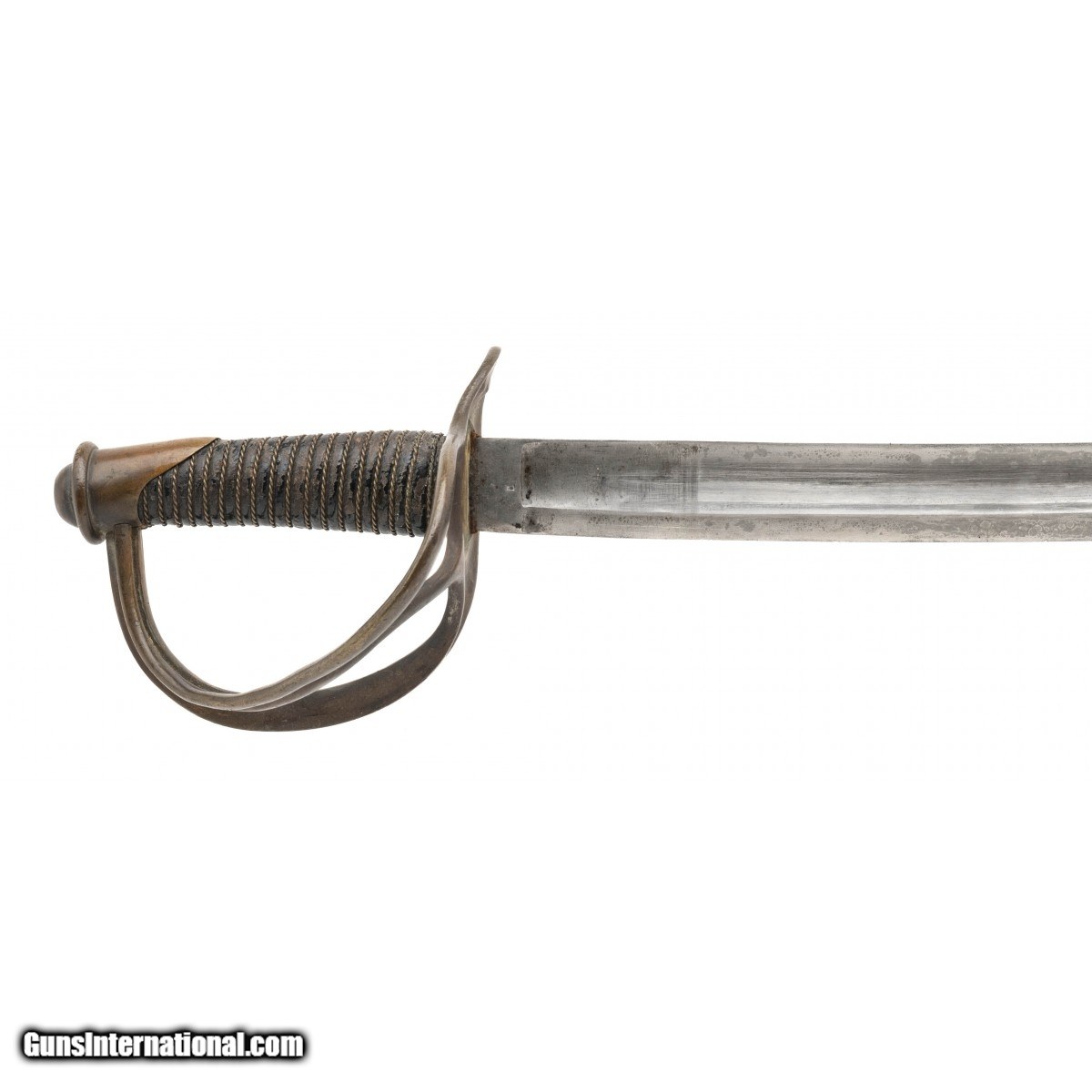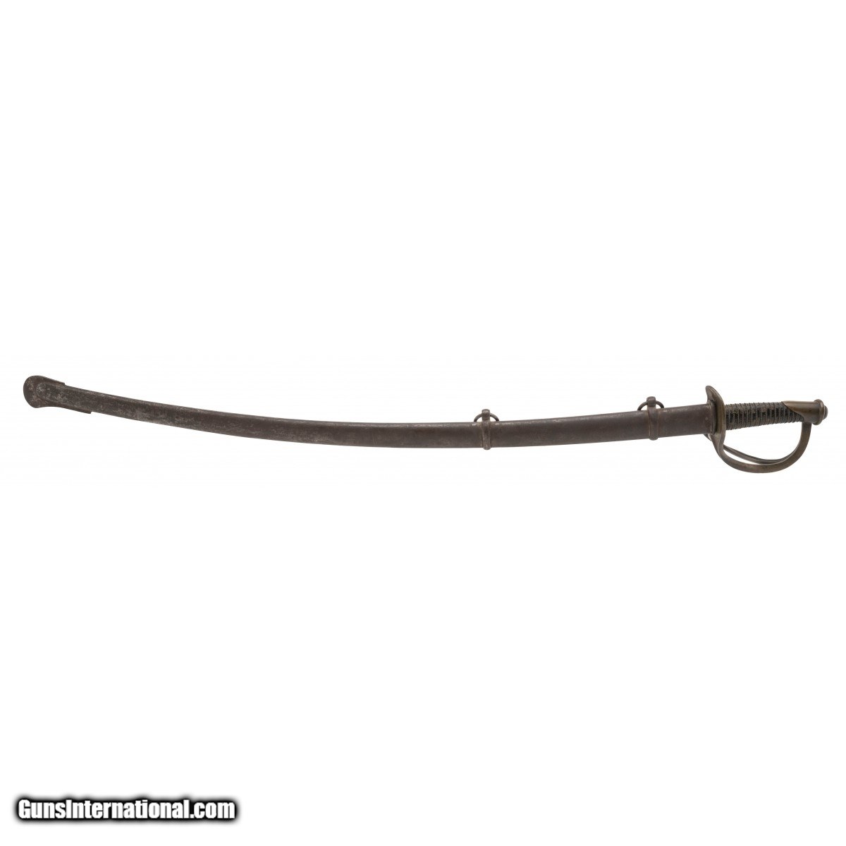 Description: " Civil War Era Model 1860 cavalry saber assembled by Horstmann in Philadelphia. 35.75"" slightly curved blade with a 25"" fuller. Blade is a light polished grey patina with discoloration visible, blades edge has nicks present. Ricasso has faint ""Horstmann"" marking. Wired leather wrapped grip is good with most leather missing. Brass handguard is a nice dull gold patina. Scabbard has a dark brown finish with surface oxidation present. Consignment SOLD |