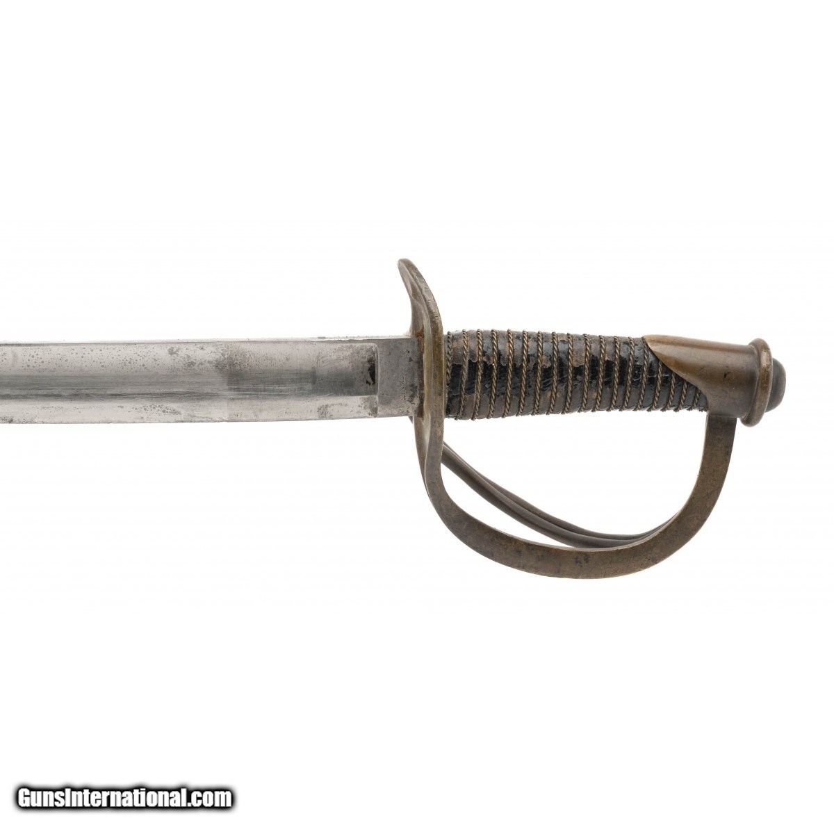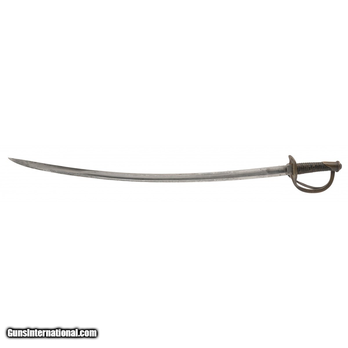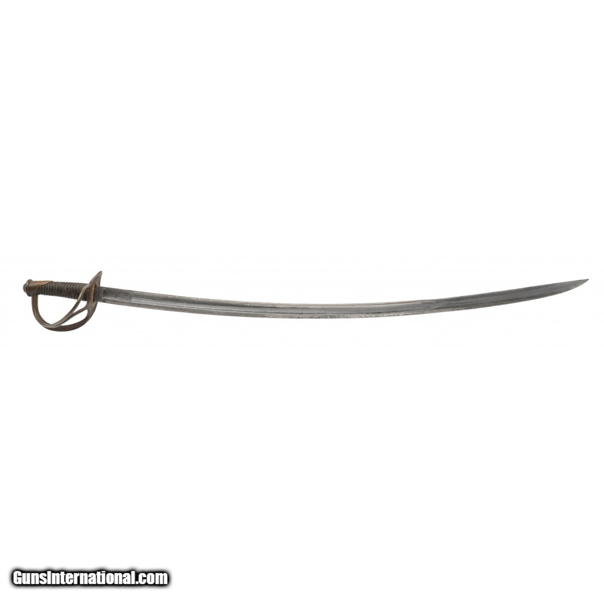 Description: " Civil War Era Model 1860 cavalry saber assembled by Horstmann in Philadelphia. 35.75"" slightly curved blade with a 25"" fuller. Blade is a light polished grey patina with discoloration visible, blades edge has nicks present. Ricasso has faint ""Horstmann"" marking. Wired leather wrapped grip is good with most leather missing. Brass handguard is a nice dull gold patina. Scabbard has a dark brown finish with surface oxidation present. Consignment SOLD |