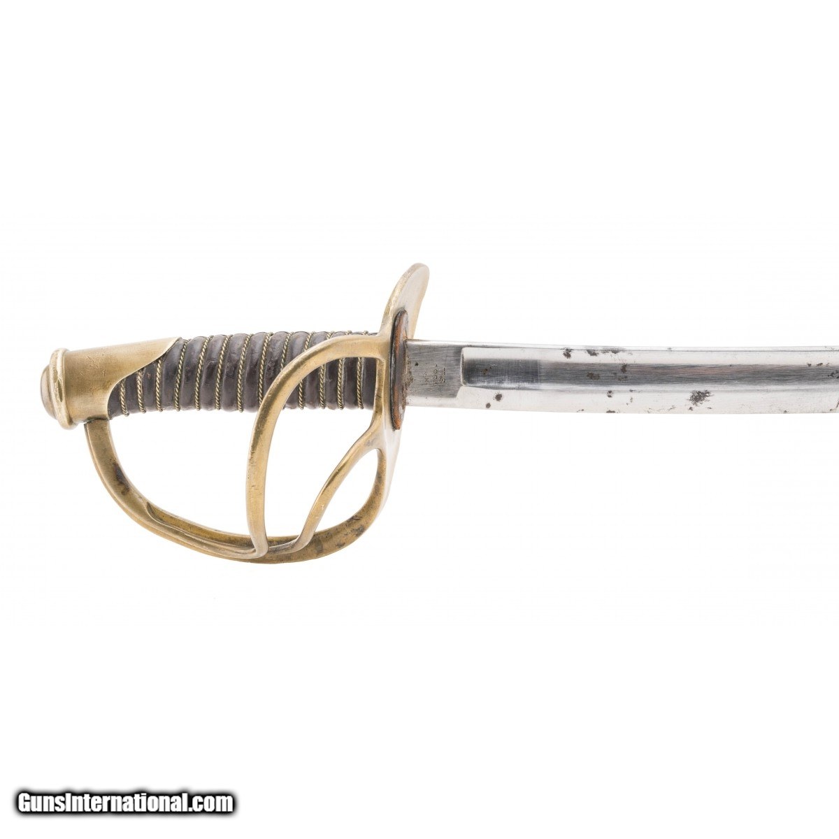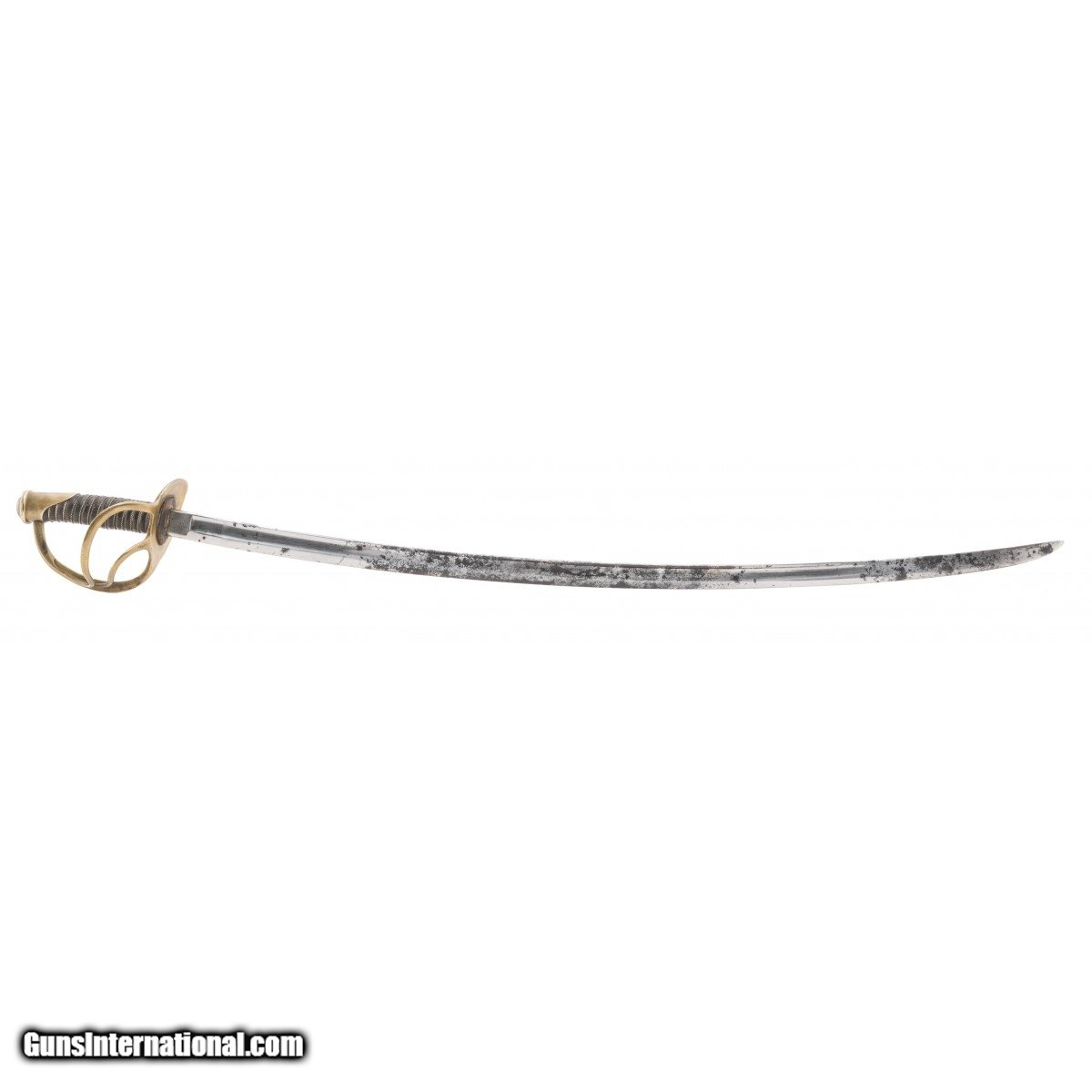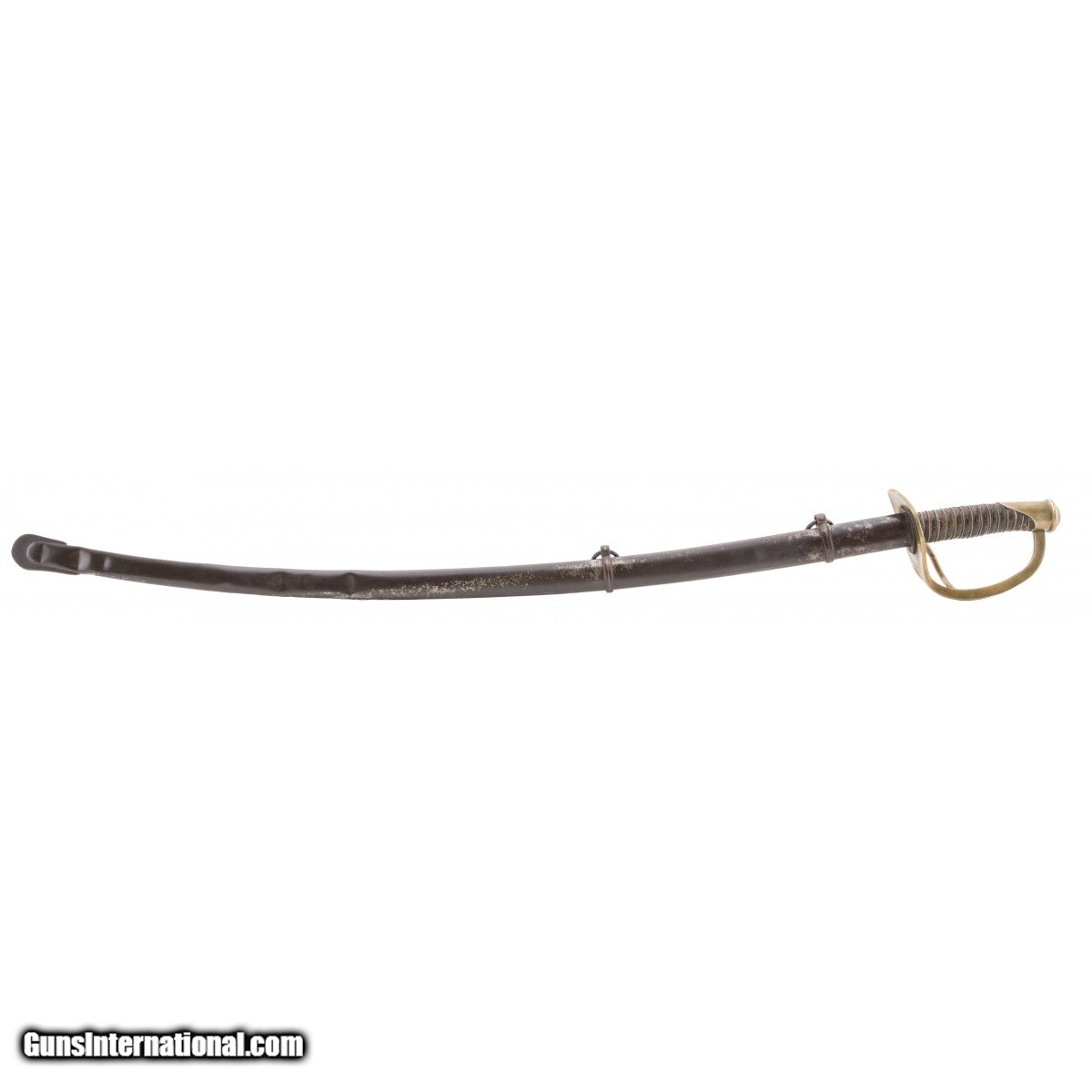 Description: " U.S. Model 1860 cavalry sword by C. Roby in overall fair condition. Ricasso is marked ""C. Roby"" over ""W. Chelmsford Mass."", opposite side is stamped ""US"" over ""1864 G.M."". The sword has been cleaned and marks aren't as crisp or deep. Blade is covered in sporadic pitting and surface oxidation. Scabbard has multiple dents noted. SOLD |