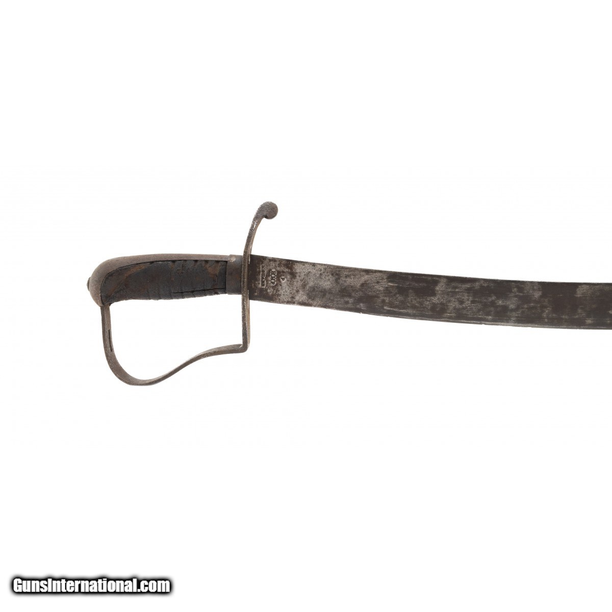 Description: "34" blade with a dark brown to almost black mottled patina. Markings are nice and sharp. Most of the leather is present. Scabbard is very good with a dark patina with pitting. SOLD |