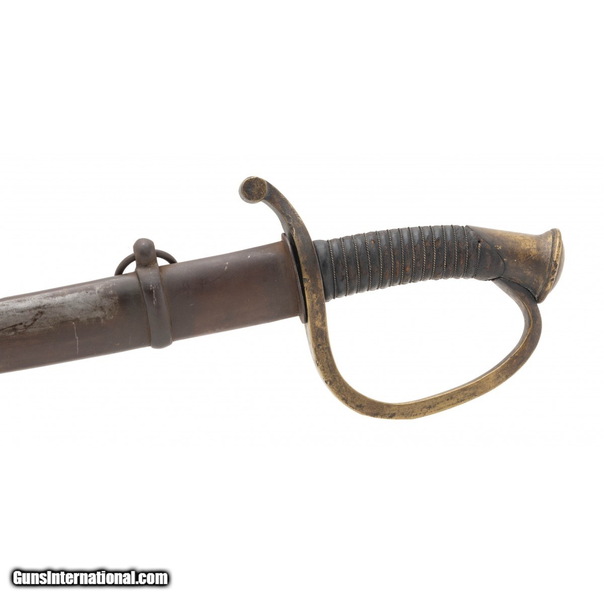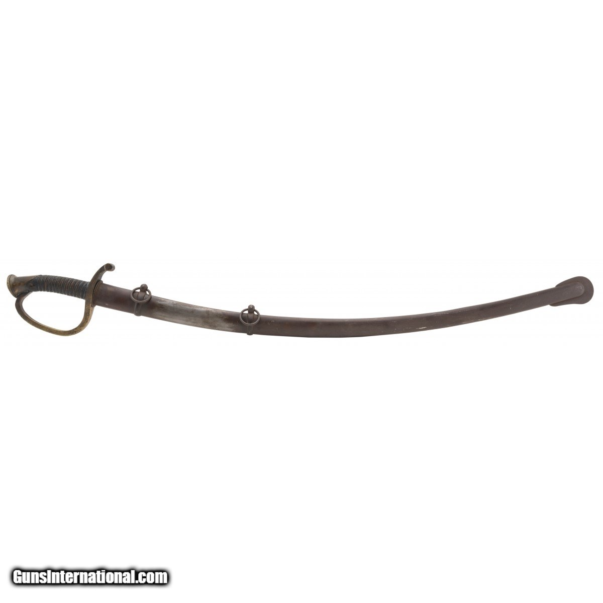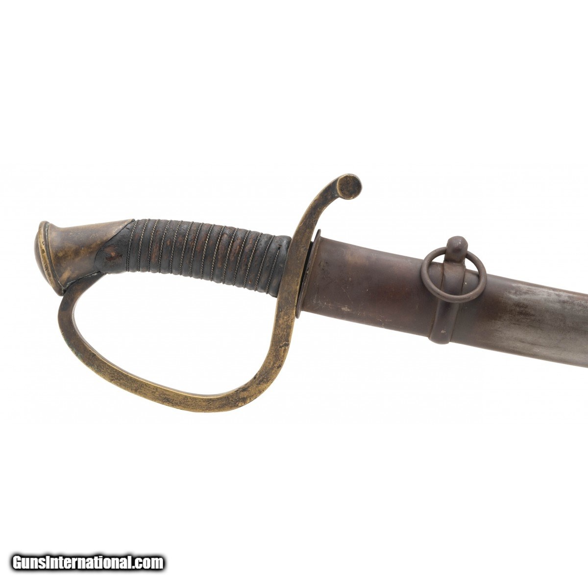 Civil War era. Scabbard is very good with a brown patina, no dents or dings. Grip is good with original leather wrap and wire. Ricasso is unmarked. Very good overall condition.