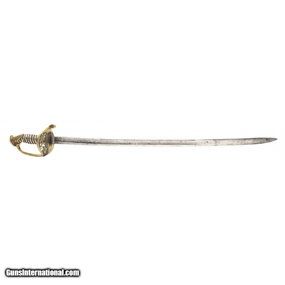 Description: "A very handsome presentation grade 1850 Staff & Field Officer’s sword and scabbard by “Emerson & Silver, Trenton N.J." and so marked on the ricasso of the blade. The other side of the ricasso has the Emerson & Silver Keystone stamp on it. The sword is very handsome with a cast silver grip with raised stars alternating with ribs. The guard is very interesting. It has the letters “U.S." normally found on Staff & Field sword baskets, but below that is an Eagle rising from flames, or a Phoenix rising from flames. The blade is very handsome, with a large Union Shield over a trophy of arms with a US flag in it. The U.S. on the other side is relatively huge, and very handsome. The blade is also etched with vines and florals. The scabbard is plain black leather with brass mounts. Dimensions: The blade is 31 inches long, and the sword overall is 39 inches long. The hilt is excellent. The upper part of the blade with the etching is very good and better. The point and area near it have the remnants of old stains, with some pitting right at the point. The scabbard shows wear, with numerous small dents on the brass mounts. There is a brown leather patch sewn into the scabbard body just above the drag. SOLD |
