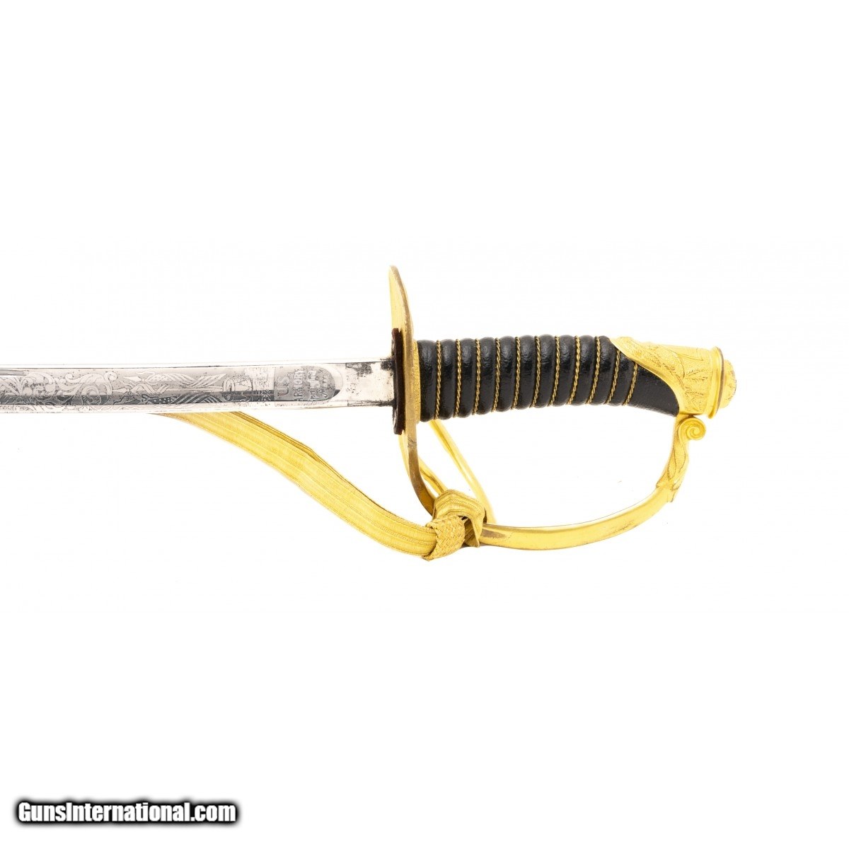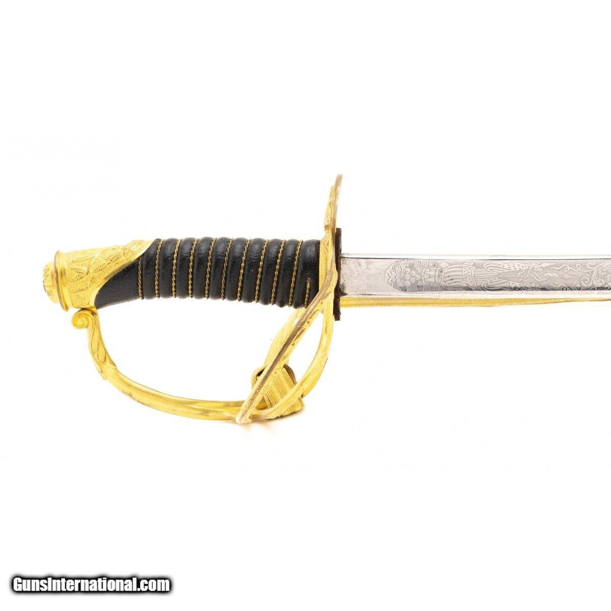 Description: "Circa post 1900. Blade is 33 ½" long. This sword is marked US Armory in Springfield, Massachusetts. This sword is in excellent condition with almost all of the nickel finish on the acid etched blade. Guard is gilded relief cast brass with a brass wire wrapped leather grip. Scabbard is also nickel plated with most of the nickel finish remain. Scabbard is gilded cast brass. Very fine Model 1872 sword. SOLD |
