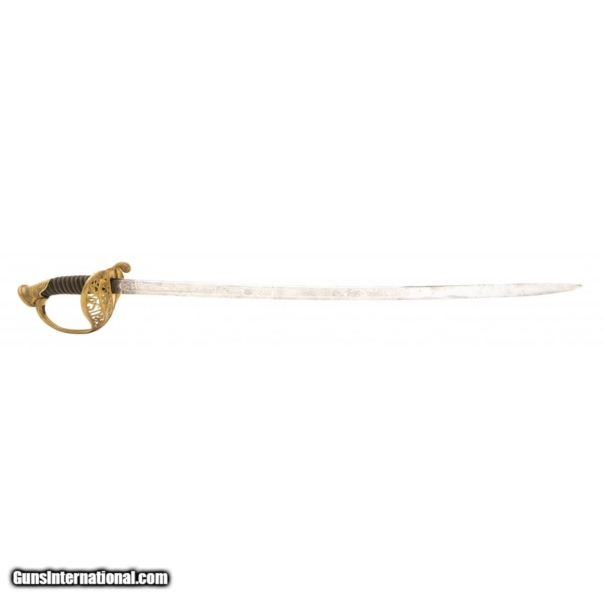 Description: "An extremely nice US 1850 Staff & field Officer’s Sword & Scabbard with extremely nice ornamentation throughout. The hilt is very fine, with more ornately cast details on the quillon in particular, and an exceptionally handsome grip with ultra-fine black leather and triple wire wrap. The blade is also very fine, with a larger than usual horizontal “US" on one side, and a very large flowing US flag on the other side. The other ornamentation is interesting as well in that the background is “purpled," i.e., textured throughout the etching, a feature seldom seen. The back of the blade is also etched with leaves, as well as “Iron Proof." The scabbard has a blued steel body with outstanding brass mounts with ornately cast bands and added engraving on each of the mounts. Dimensions: The blade is 31.5 inches long. The sword overall is 39.25 inches long. Overall excellent condition. The hilt and scabbard are beautiful. The quillon is slightly bent downward. The cutting edge of the blade near the point has been sharpened, and there is a rough spot about 8 inches from the point. There are a few tiny spots on the etching and at the ricasso. SOLD |