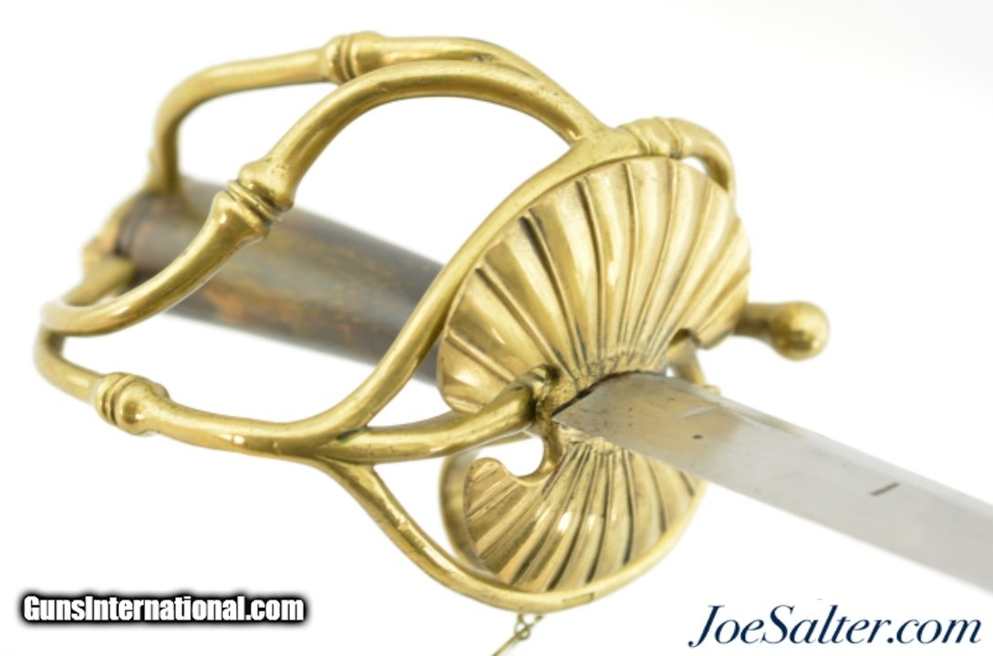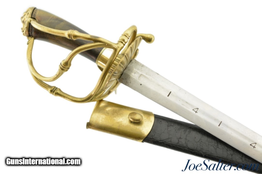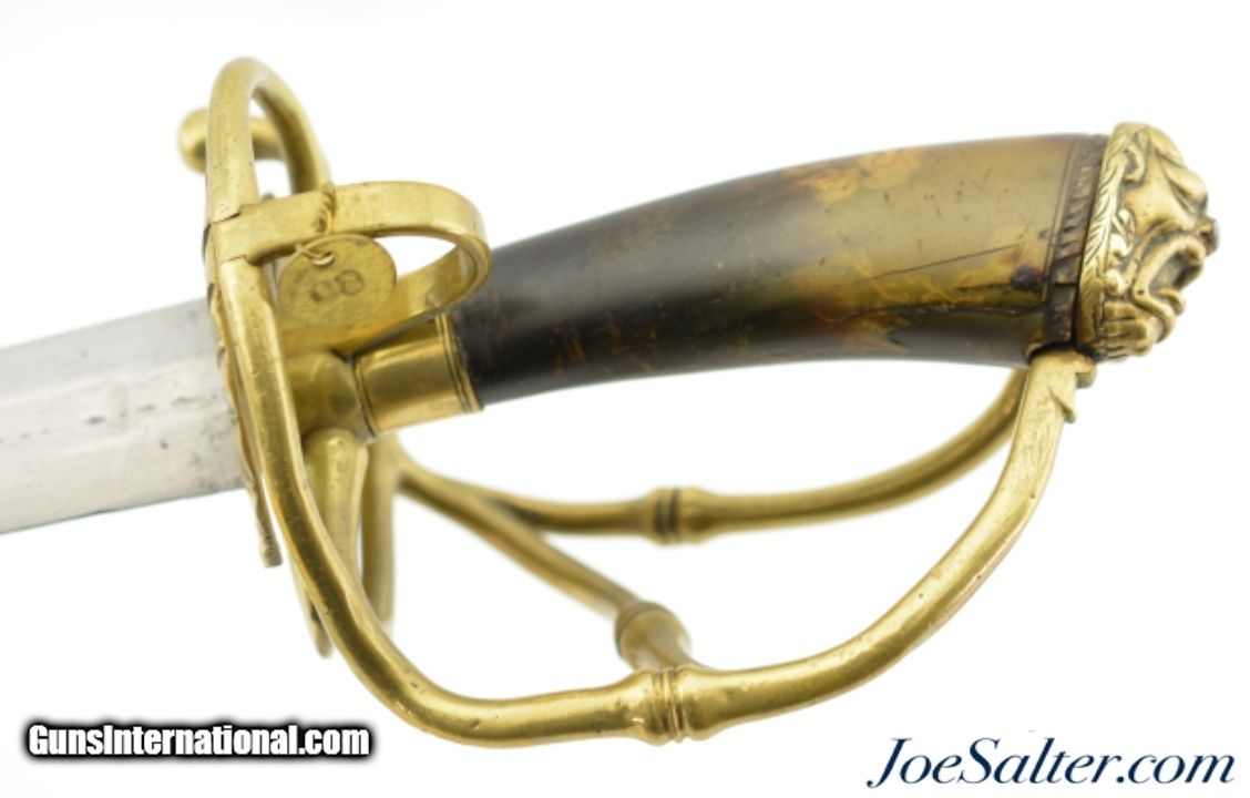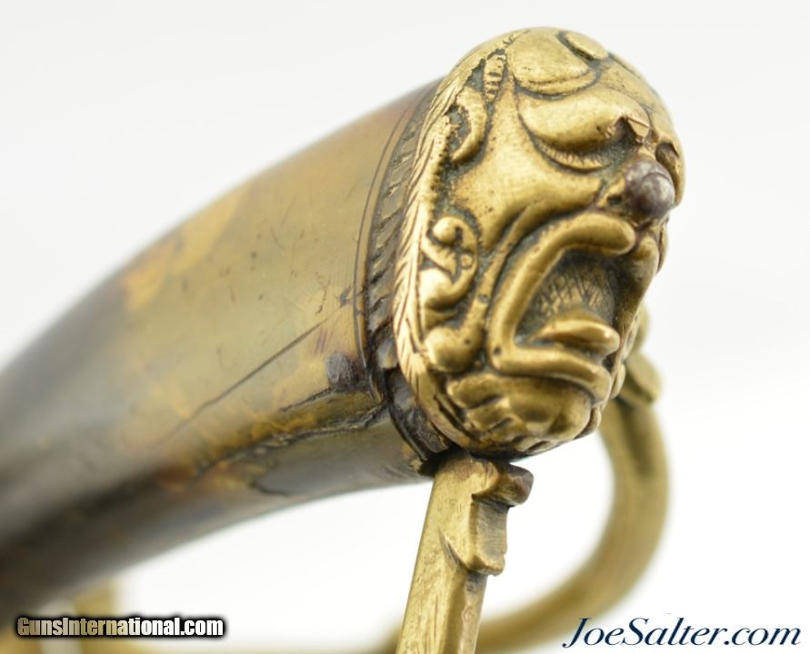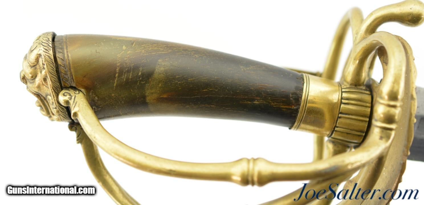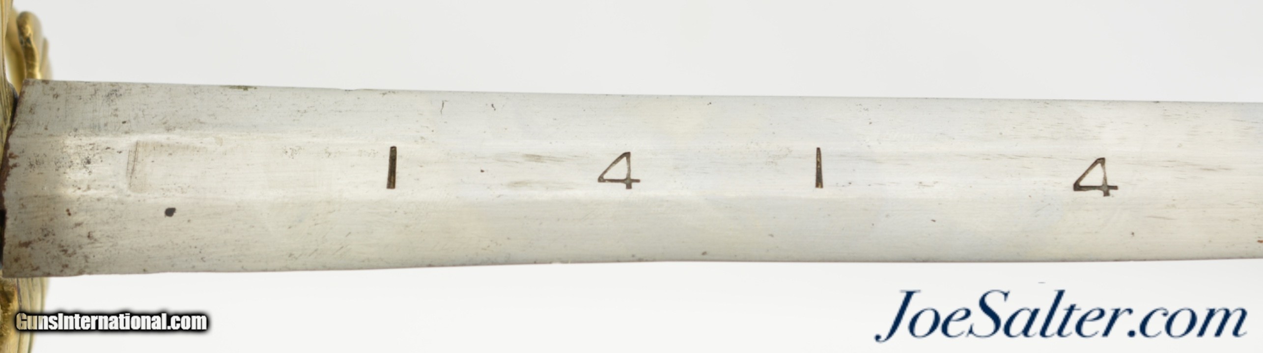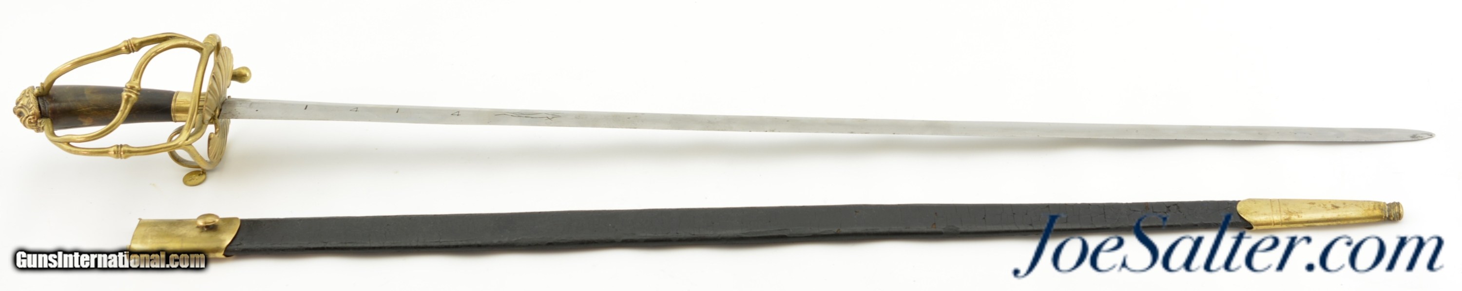 Description: This is a wonderful sword that measures 37" overall, with a 31 1/2" straight, double-edged blade having narrow central fullers. The blade has an overall bright gray patina with some spots of darker freckling along both faces. Old polishing marks can be seen in the metal, and there are some minor nicks along the edges. The forte is numbered 1414 on both faces within the short fullers, and is capped by the Passau "Running Wolf" mark, also on both sides. The number is not a date, but rather a good luck number, or possibly even a reference to Job 14:14 ("If a man die, shall he live again? All the days of my appointed time will I wait, till my change come"). The brass hilt is typical of the late 18th century, with a separate shell type counterguard, triple branch guard and knucklebow, thumb-ring, tapered horn grip, and a grotesque face pommel cap with exposed capstan rivet at the nose. The brass has an overall dull yellow-ochre patina throughout, with some minor cracks and chips of the bone where it the grip meets the pommel cap. Some simple carved decorations are present there as well. The sword is housed in a leather and brass scabbard with loose throat with frog stud and lightly polished chape. The leather is heavily crazed and flaked, but the seam is still intact on the back. An old brass collection inventory tag is attached to the guard end of the thumb-ring. This is a beautiful Revolutionary War era sword, and would make a great addition to any collection.; SOLD |
