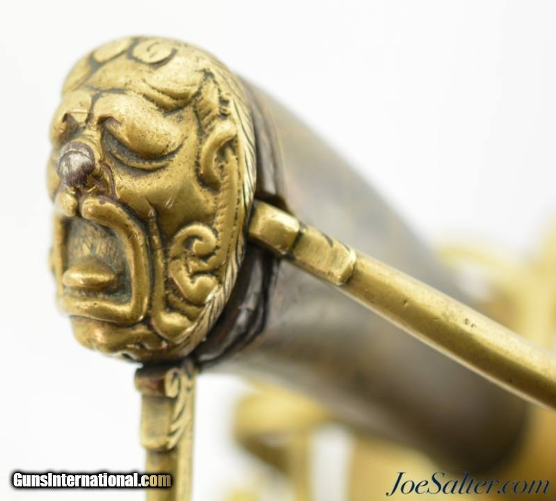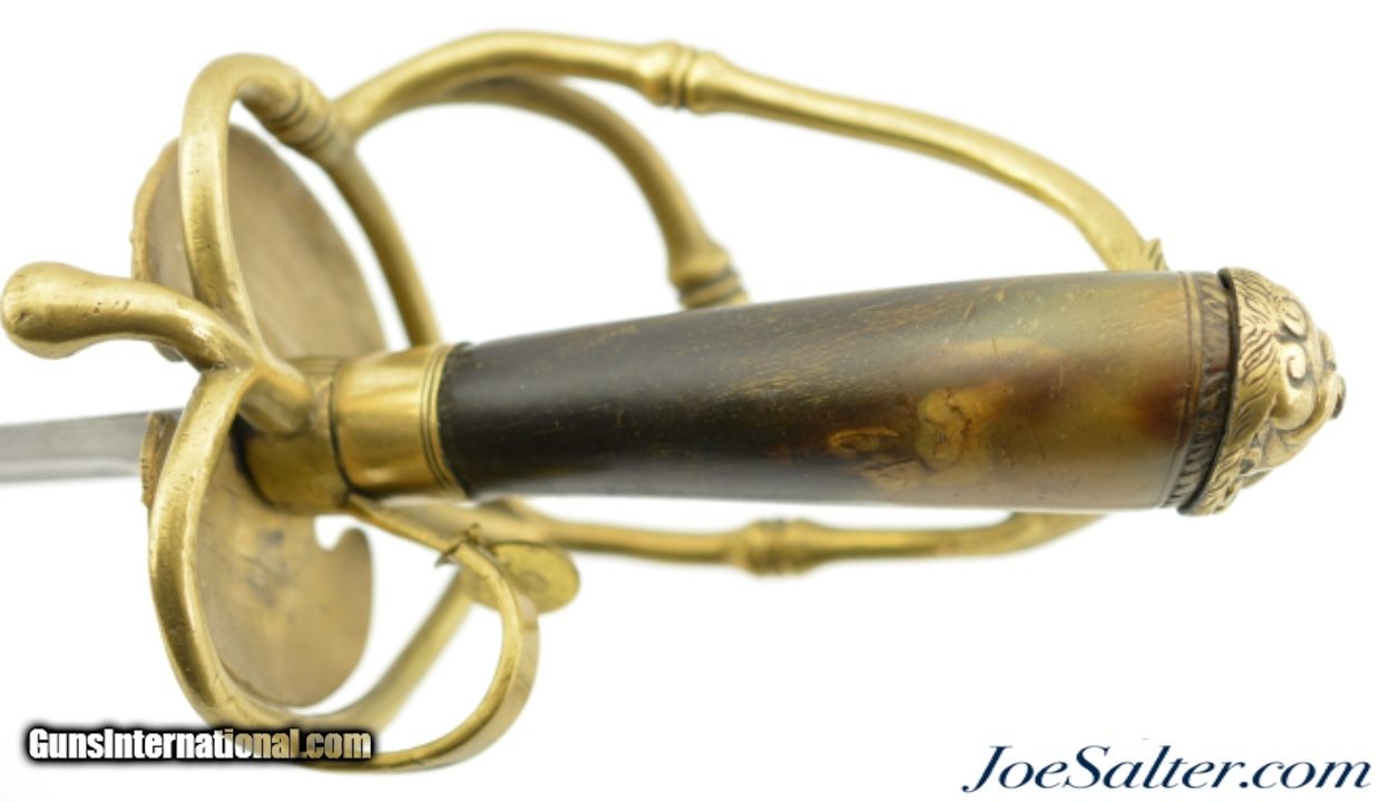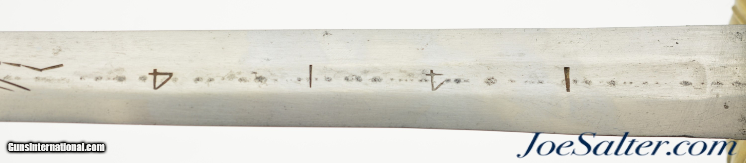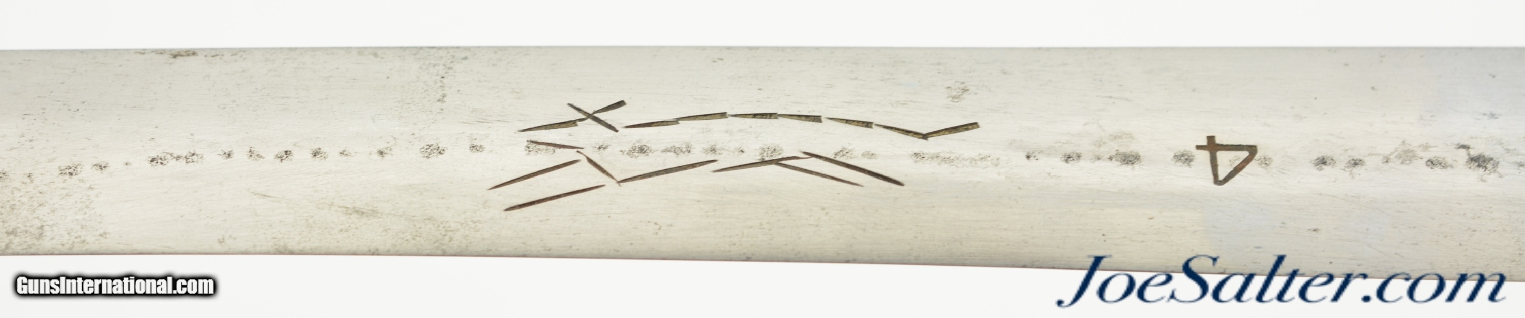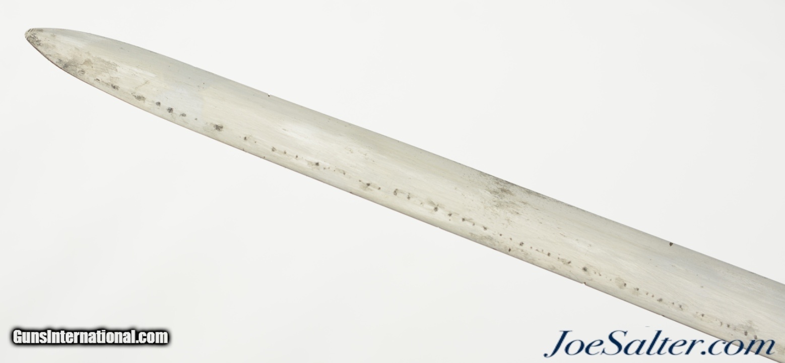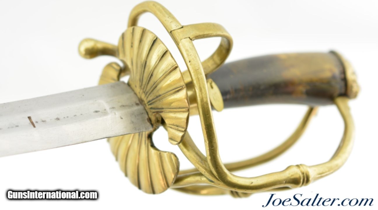 Description: This is a wonderful sword that measures 37" overall, with a 31 1/2" straight, double-edged blade having narrow central fullers. The blade has an overall bright gray patina with some spots of darker freckling along both faces. Old polishing marks can be seen in the metal, and there are some minor nicks along the edges. The forte is numbered 1414 on both faces within the short fullers, and is capped by the Passau "Running Wolf" mark, also on both sides. The number is not a date, but rather a good luck number, or possibly even a reference to Job 14:14 ("If a man die, shall he live again? All the days of my appointed time will I wait, till my change come"). The brass hilt is typical of the late 18th century, with a separate shell type counterguard, triple branch guard and knucklebow, thumb-ring, tapered horn grip, and a grotesque face pommel cap with exposed capstan rivet at the nose. The brass has an overall dull yellow-ochre patina throughout, with some minor cracks and chips of the bone where it the grip meets the pommel cap. Some simple carved decorations are present there as well. The sword is housed in a leather and brass scabbard with loose throat with frog stud and lightly polished chape. The leather is heavily crazed and flaked, but the seam is still intact on the back. An old brass collection inventory tag is attached to the guard end of the thumb-ring. This is a beautiful Revolutionary War era sword, and would make a great addition to any collection.; SOLD |