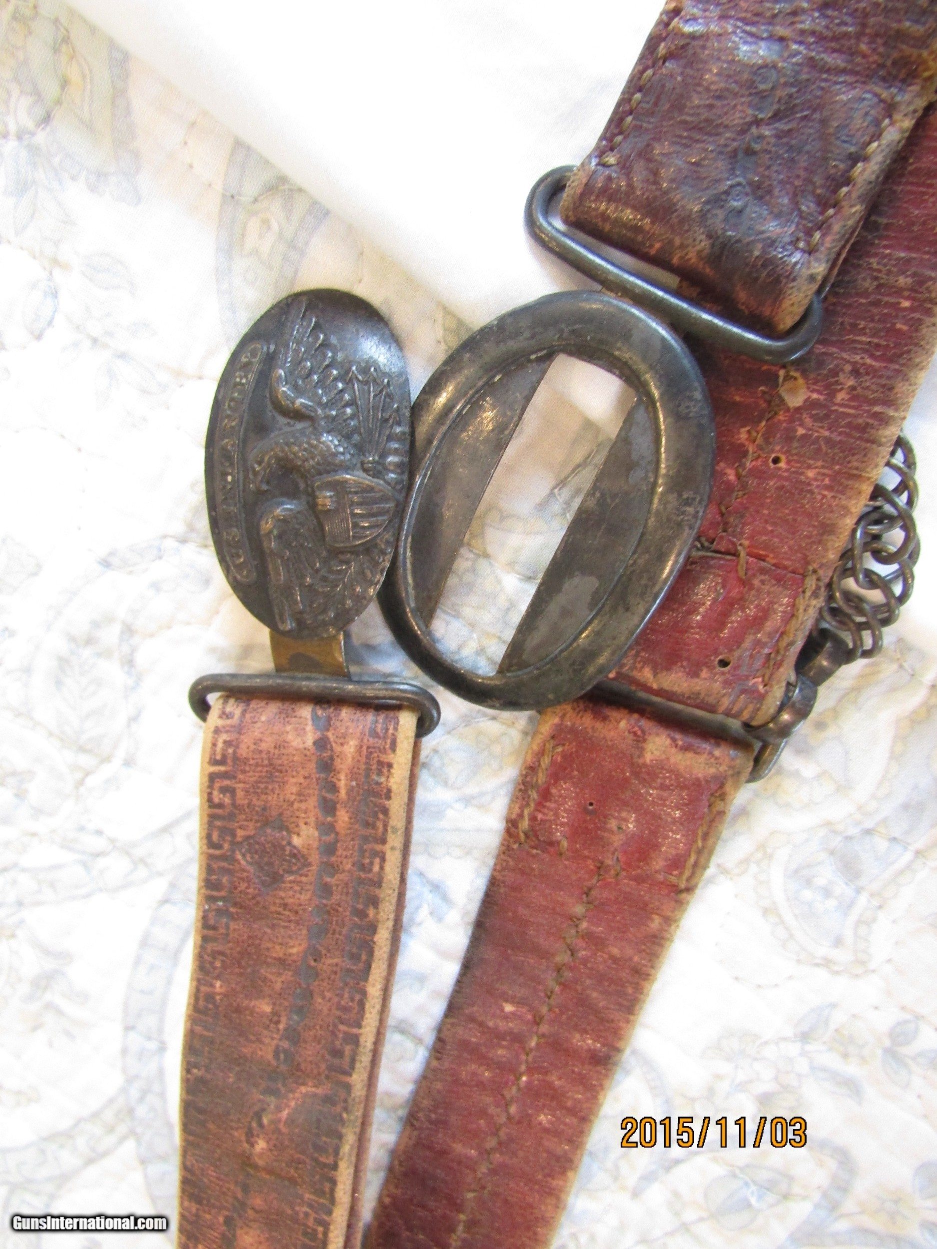 Description: This is an extermly rare early minty set of items.The belt has the old eagle looking backwards, and is a two peice that fits together perfectly, with the original chain and hook,attached to a red moraccan leather belt with ajustable slides.The sword has an old hang tag 1987,. describing it. This indian head sword is in amazing shape, with blued blade and gold gilt,perfectly strait, it has mother of peral grips ,with a beautiful large clamshell hand guard that has a gold washed scean of the indian princess holding a shield, and eagle with wings spread ,17 STARS,the thumb guard is an eagle head , and of coarse the pommel is the indian pricesses head,. The scabbard is strait as is the blade with ornate designs down the scabbard, double hangers and the stud to attach to the belt when inside. There is a markers name , but it is unreadable. This is one of the beautiful mitita groupings I've ever seen. This is in Peterson '' THE AMERICAN SWORD 1775-1945 , PAGE 76, AND AMERICAN SWORD & MARKER, MARKS PAGE 45. 859-533-5445 DAN SOLD |