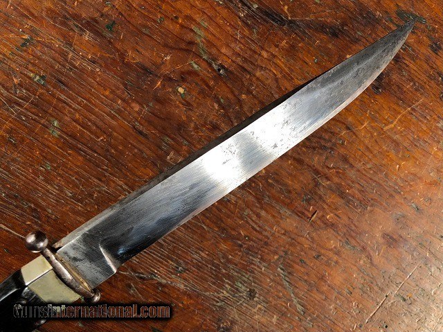 Description: Rare & Important Rodgers & Sons Marked Clip-Point Coffin Handle Bowie Knife Attributed to Peter Rose, New York, mfg. circa 1840. This is a very rare and impressive Bowie knife which I believe was made by Peter Rose of New York City for a local retailer with the pseudo name "RODGERS & SONS" added for appeal to customers seeking a quality English knife. Famed cutler Joseph Rodgers & Sons of Sheffield never marked their blades in this manner and the knife is otherwise identical to those made by Peter Rose. Pseudo markings were actually quite common at the time and were used to make the item appear more desirable. A typical example of this is the use of "LONDON" marked on guns and knives that weren't actually made in London. While American made Bowies are most prized by collectors today in the 1840's a fine English knife would have had greater appeal. The knife measures 14 3/4" long overall and features a substantial 10 3/16" long clip-point blade which measures approximately 7/32" thick across the spine. The clip point is more subtle than later Bowies and is reminiscent of the earliest straight-back knives made during the late 1820's. The last 4 1/2" of the blade is broadly swedged with a false edge sharpened near the tip. Nice full edge with no chips and sharp point. There are several spots of smooth pinprick pitting or blood staining scattered throughout with evidence of light cleaning and some original factory luster still visible near the base of the blade on the right side. Ebony handle shows pleasing wear with 70% original varnish remaining and one tight 1" check on each side. Nickel silver pins, escutcheon, and clamshell pommel with iron ball guard. The original sheath is missing. This is an important knife which may unlock a whole new chapter in American Bowie knife history. Rare & Important Rodgers & Sons Marked Clip-Point Coffin Handle Bowie Knife Attributed to Peter Rose, New York, mfg. circa 1840. This is a very rare and impressive Bowie knife which I believe was made by Peter Rose of New York City for a local retailer with the pseudo name "RODGERS & SONS" added for appeal to customers seeking a quality English knife. Famed cutler Joseph Rodgers & Sons of Sheffield never marked their blades in this manner and the knife is otherwise identical to those made by Peter Rose. Pseudo markings were actually quite common at the time and were used to make the item appear more desirable. A typical example of this is the use of "LONDON" marked on guns and knives that weren't actually made in London. While American made Bowies are most prized by collectors today in the 1840's a fine English knife would have had greater appeal. The knife measures 14 3/4" long overall and features a substantial 10 3/16" long clip-point blade which measures approximately 7/32" thick across the spine. The clip point is more subtle than later Bowies and is reminiscent of the earliest straight-back knives made during the late 1820's. The last 4 1/2" of the blade is broadly swedged with a false edge sharpened near the tip. Nice full edge with no chips and sharp point. There are several spots of smooth pinprick pitting or blood staining scattered throughout with evidence of light cleaning and some original factory luster still visible near the base of the blade on the right side. Ebony handle shows pleasing wear with 70% original varnish remaining and one tight 1" check on each side. Nickel silver pins, escutcheon, and clamshell pommel with iron ball guard. The original sheath is missing. This is an important knife which may unlock a whole new chapter in American Bowie knife history. Note a pic of a battlfield dug Rose knife. SOLD |