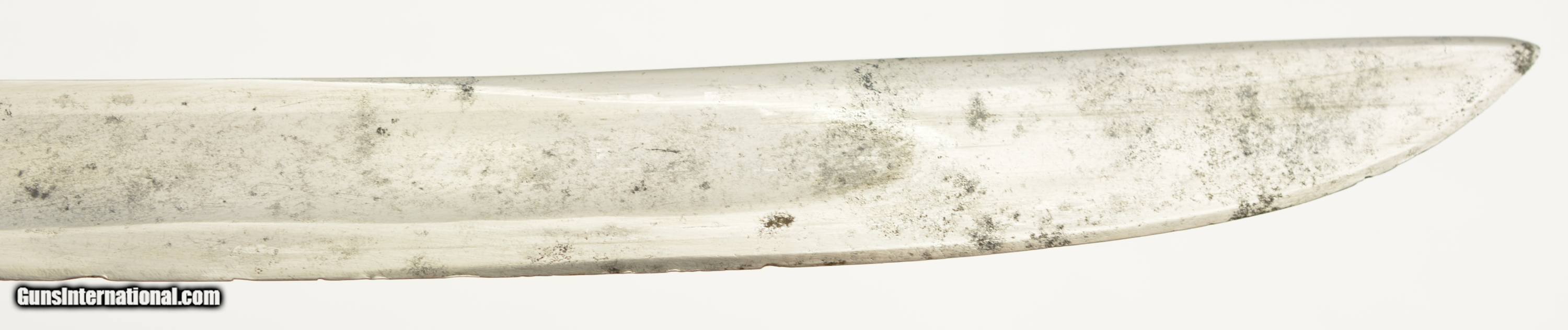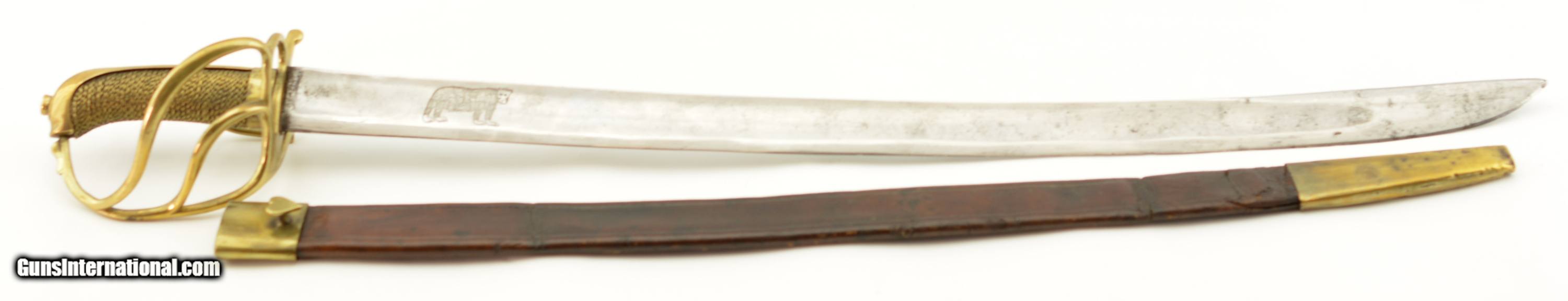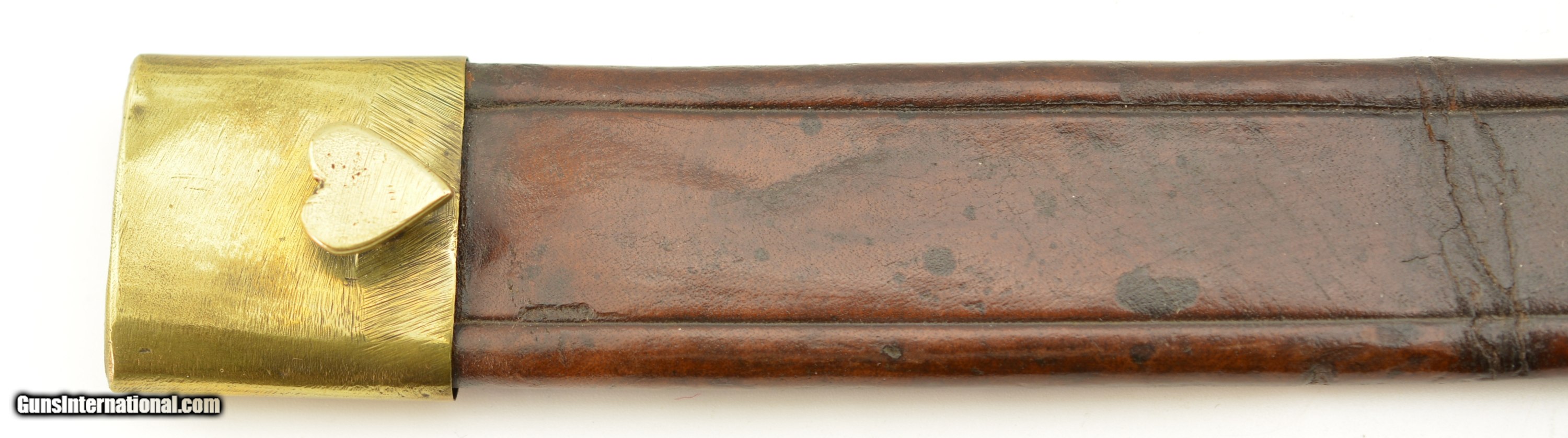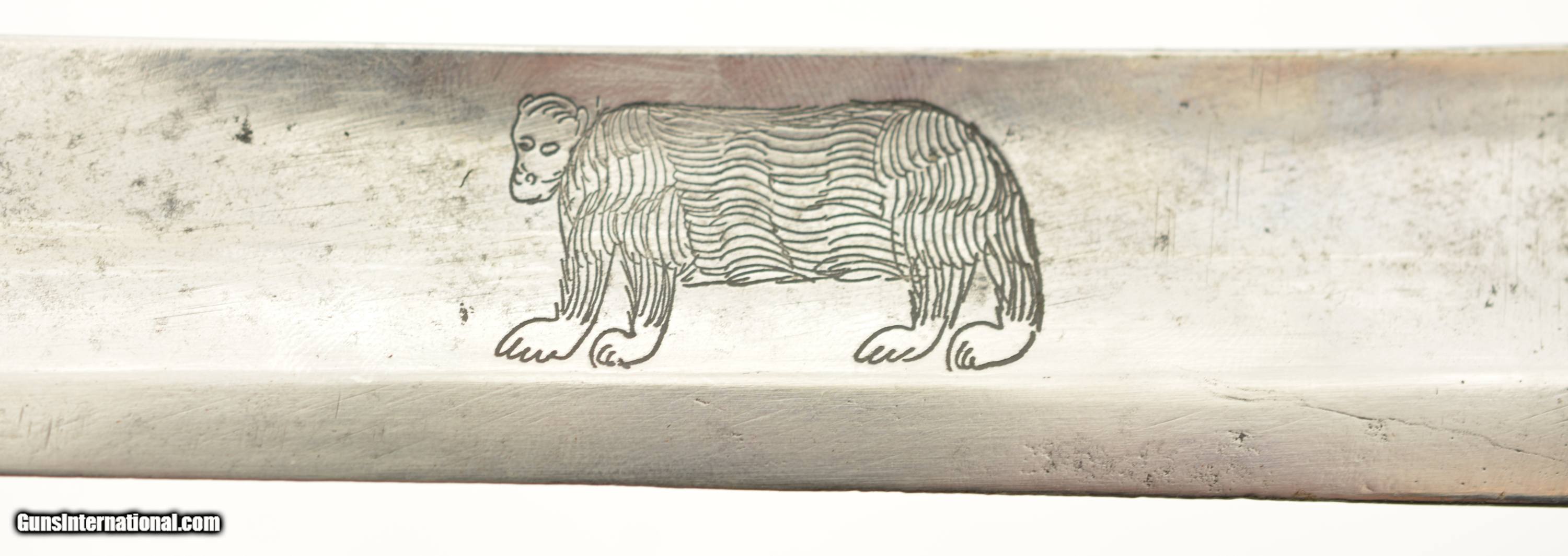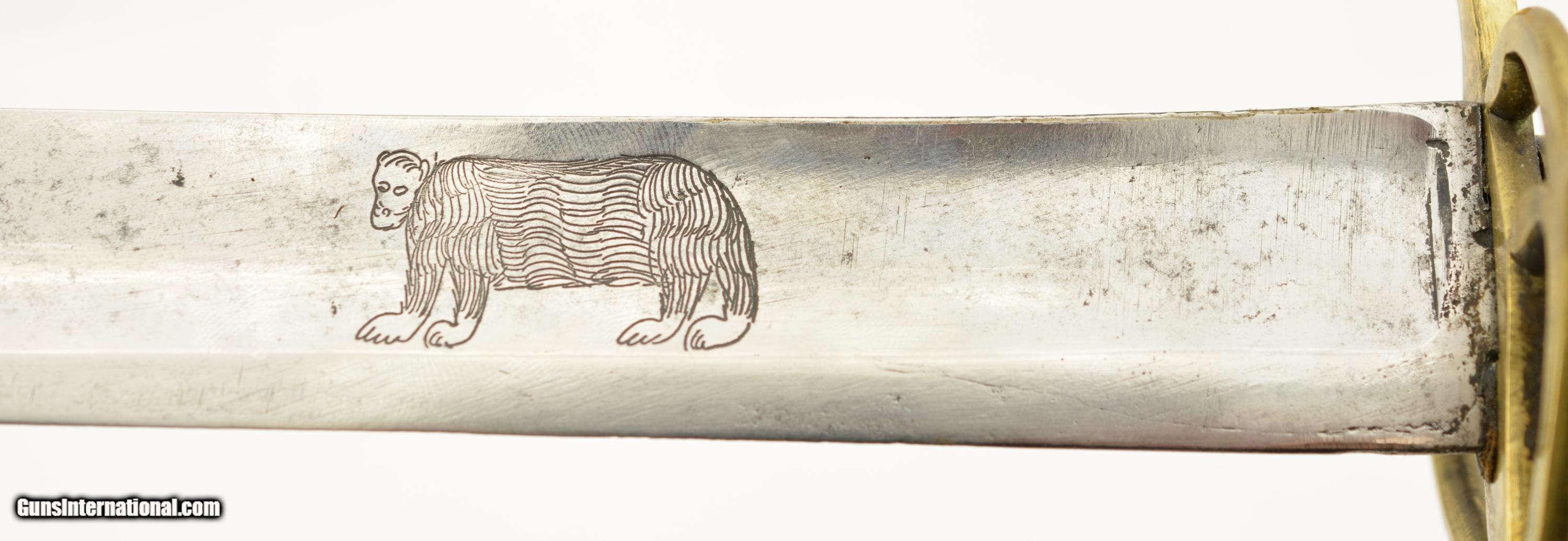 Description: This is a handsome sword that measures 30 1/2" overall, with a 25 1/2" curved, single-edged blade having wide single fullers. The steel has been cleaned to bright, but has begun to reacquire a dull gray patina, and has old sharpening marks along the edge. A large bear, heraldic emblem of the Swiss canton of Bern, is present on either side of the forte, and the back edge is engraved with the maker’s name: "Rodolphe Daniel Kirschbaum Fabricant a Solingen." The fairly bright brass hilt has a complicated guard with single forward-swept quillon, thumb loop, heart-shaped counterguard, and double-branched knucklebow. The grip has tightly wound, braided wire, and terminates in a vaguely bear’s head-shaped pommel with exposed capstan rivet. The brown leather scabbard has several creases along its length, with heavy flaking and some breaks in the leather just above the brass chape. The throat has a heart-shaped frog stud, and the brass has been cleaned at some point. The blunt-tipped chape has an identical patina, with numerous small peen marks at the tip. This is a wonderful 18th century military sword, seldom-seen in the US, and would make a splendid addition to any collection. SOLD Manufacturer: Kirschbaum Model: Sword |