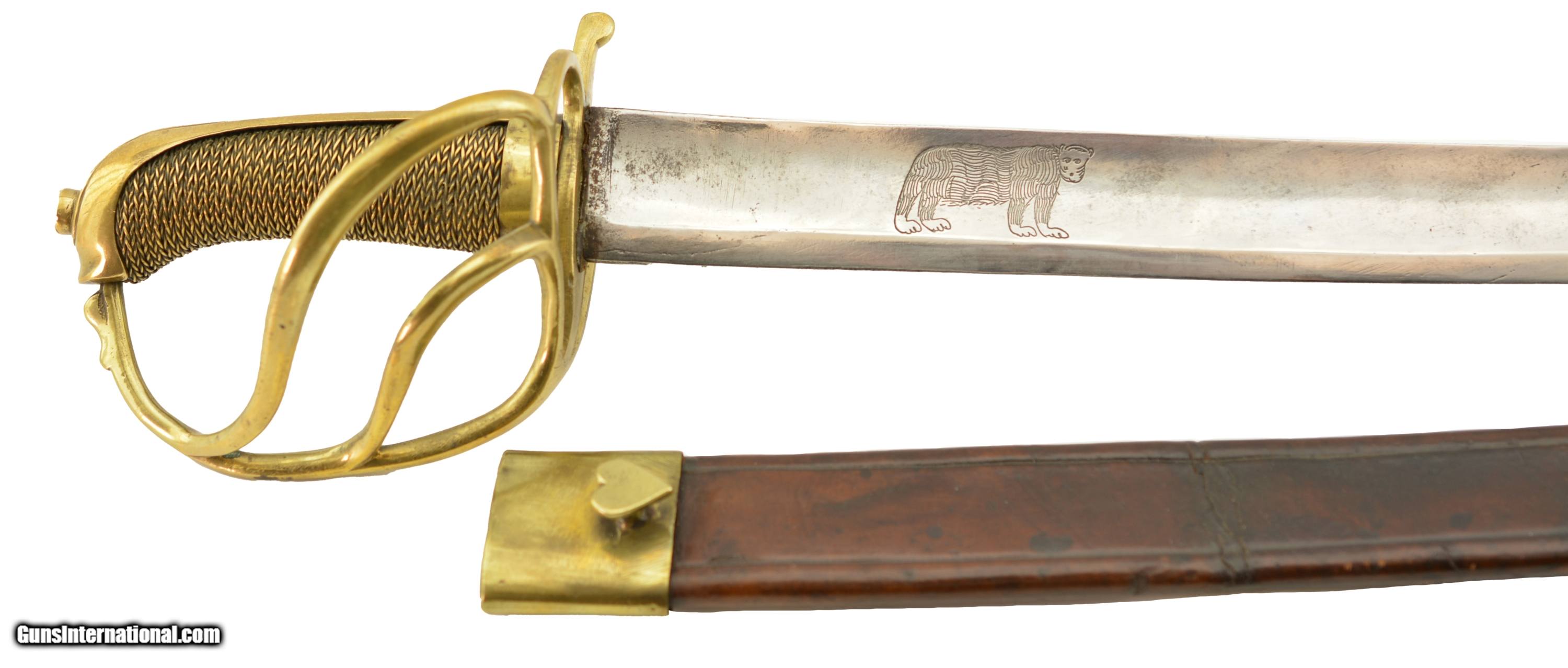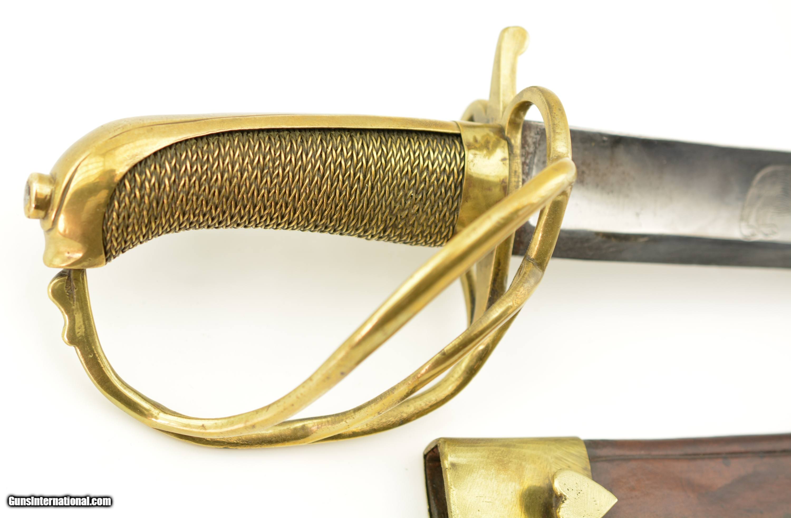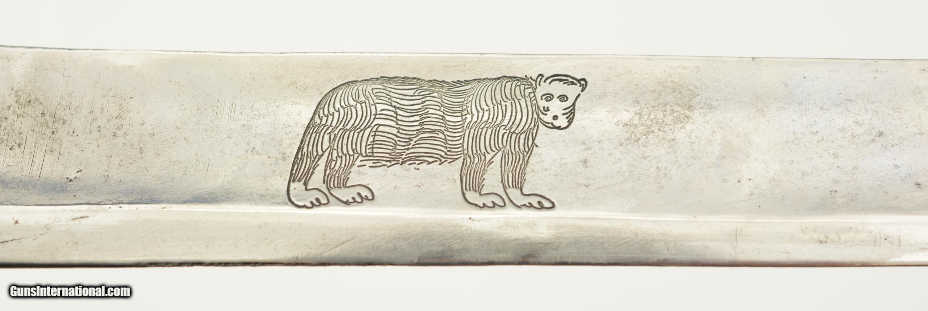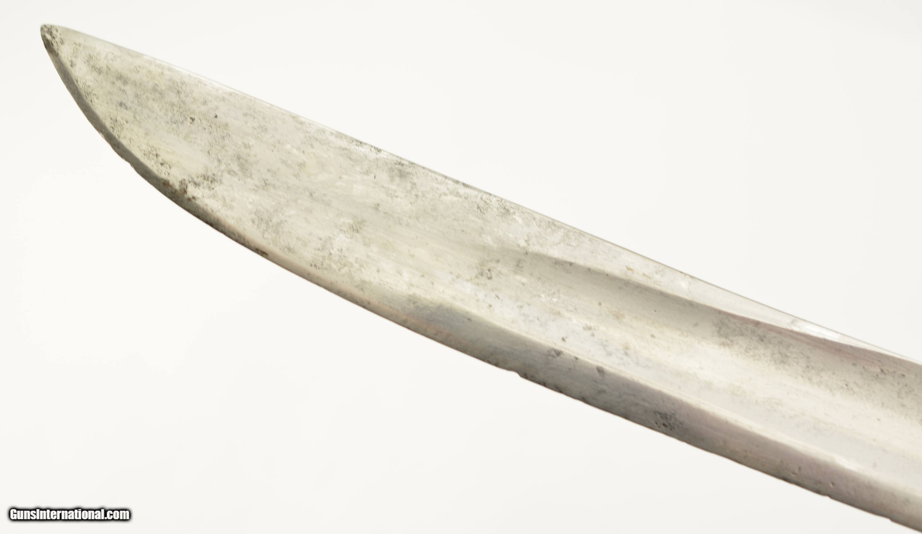 Description: This is a handsome sword that measures 30 1/2" overall, with a 25 1/2" curved, single-edged blade having wide single fullers. The steel has been cleaned to bright, but has begun to reacquire a dull gray patina, and has old sharpening marks along the edge. A large bear, heraldic emblem of the Swiss canton of Bern, is present on either side of the forte, and the back edge is engraved with the maker’s name: "Rodolphe Daniel Kirschbaum Fabricant a Solingen." The fairly bright brass hilt has a complicated guard with single forward-swept quillon, thumb loop, heart-shaped counterguard, and double-branched knucklebow. The grip has tightly wound, braided wire, and terminates in a vaguely bear’s head-shaped pommel with exposed capstan rivet. The brown leather scabbard has several creases along its length, with heavy flaking and some breaks in the leather just above the brass chape. The throat has a heart-shaped frog stud, and the brass has been cleaned at some point. The blunt-tipped chape has an identical patina, with numerous small peen marks at the tip. This is a wonderful 18th century military sword, seldom-seen in the US, and would make a splendid addition to any collection. SOLD Manufacturer: Kirschbaum Model: Sword |