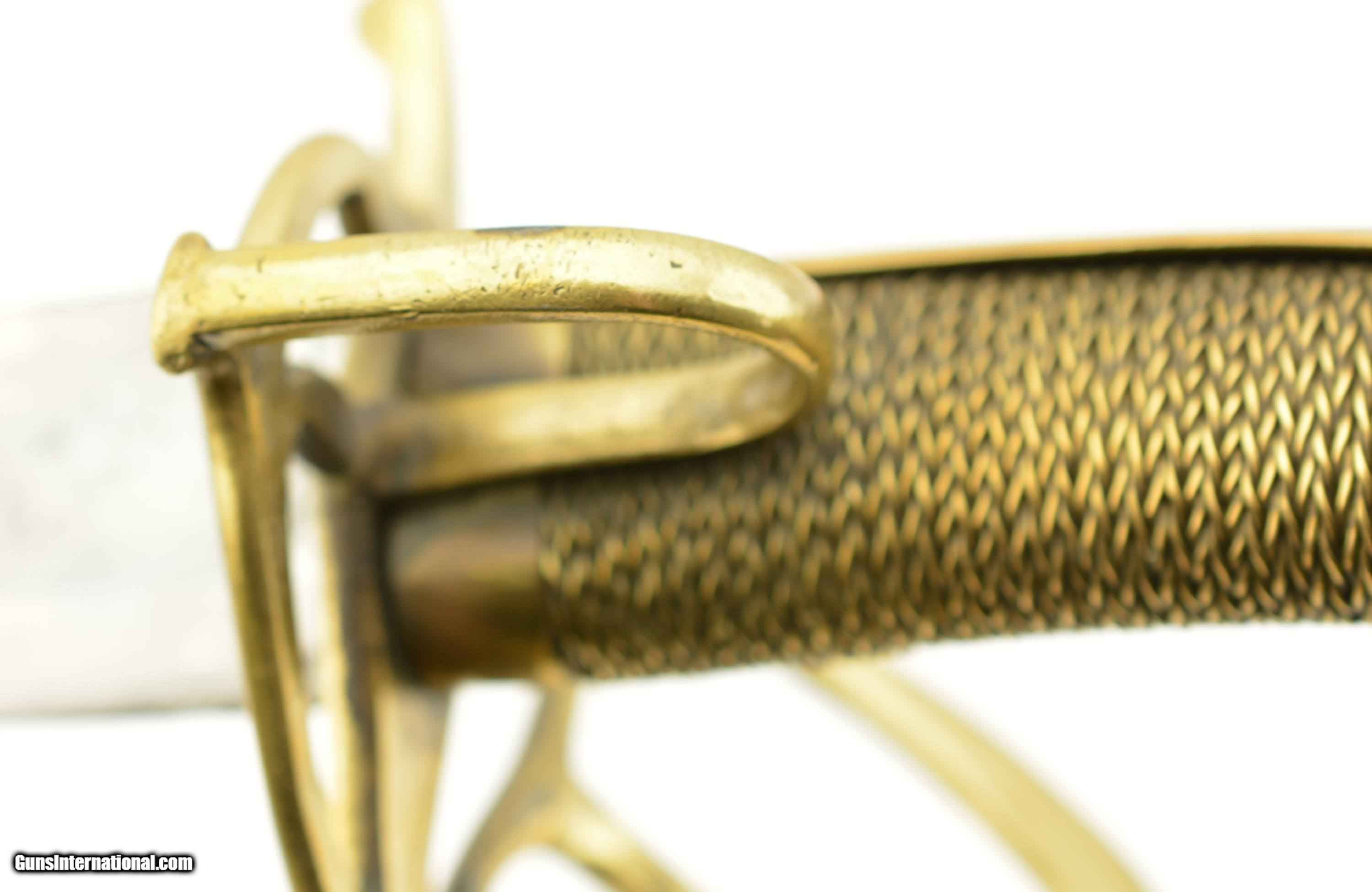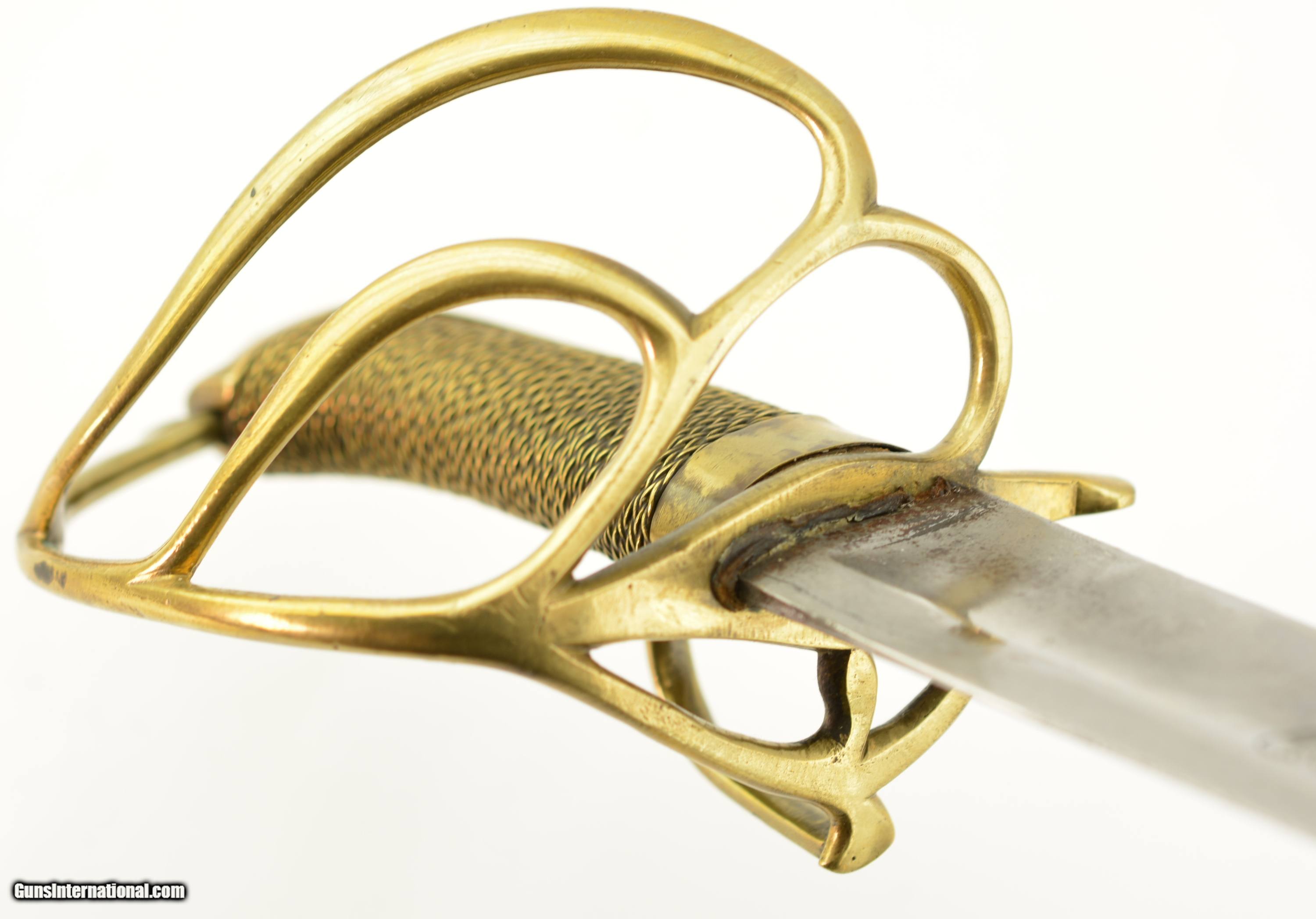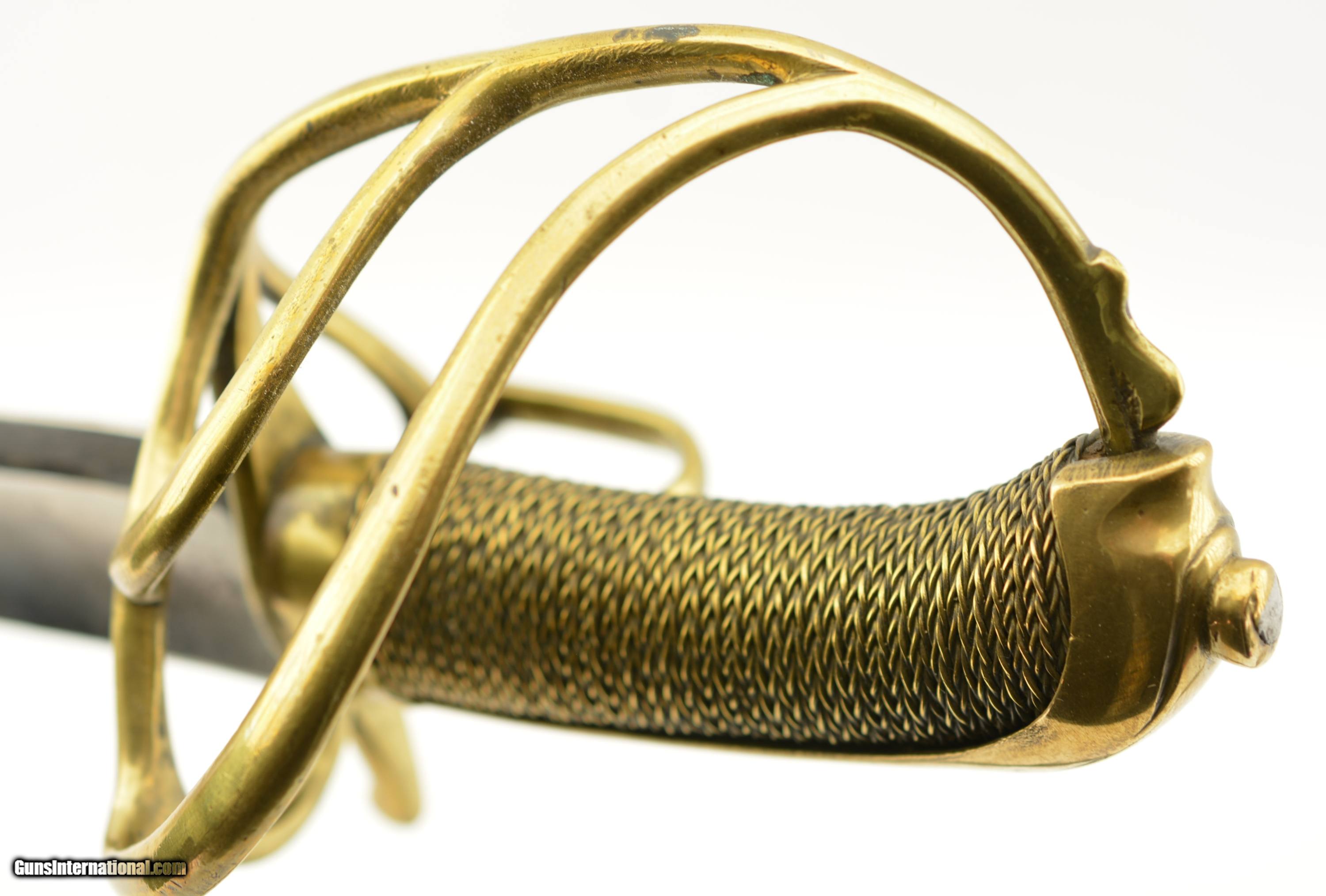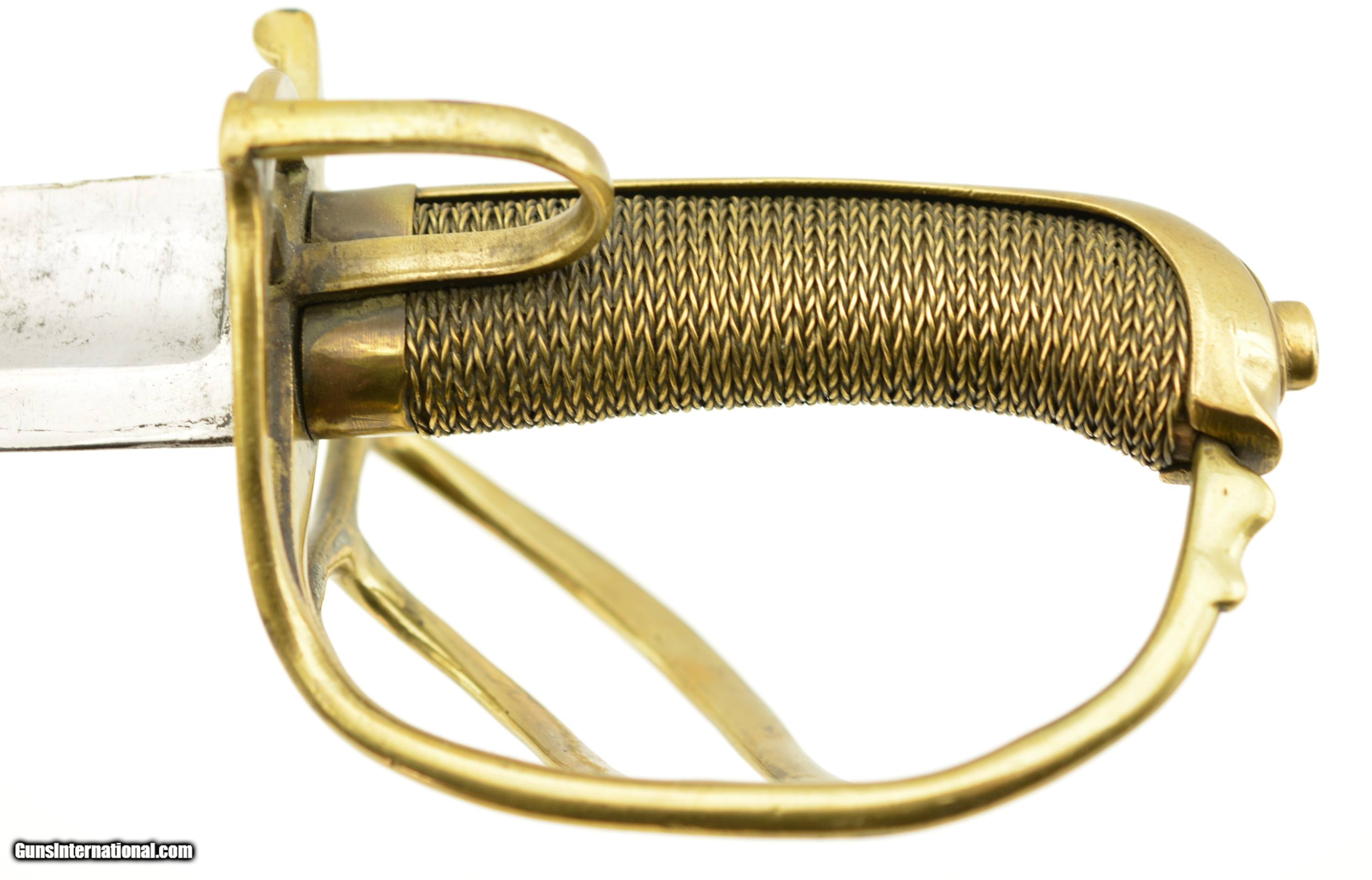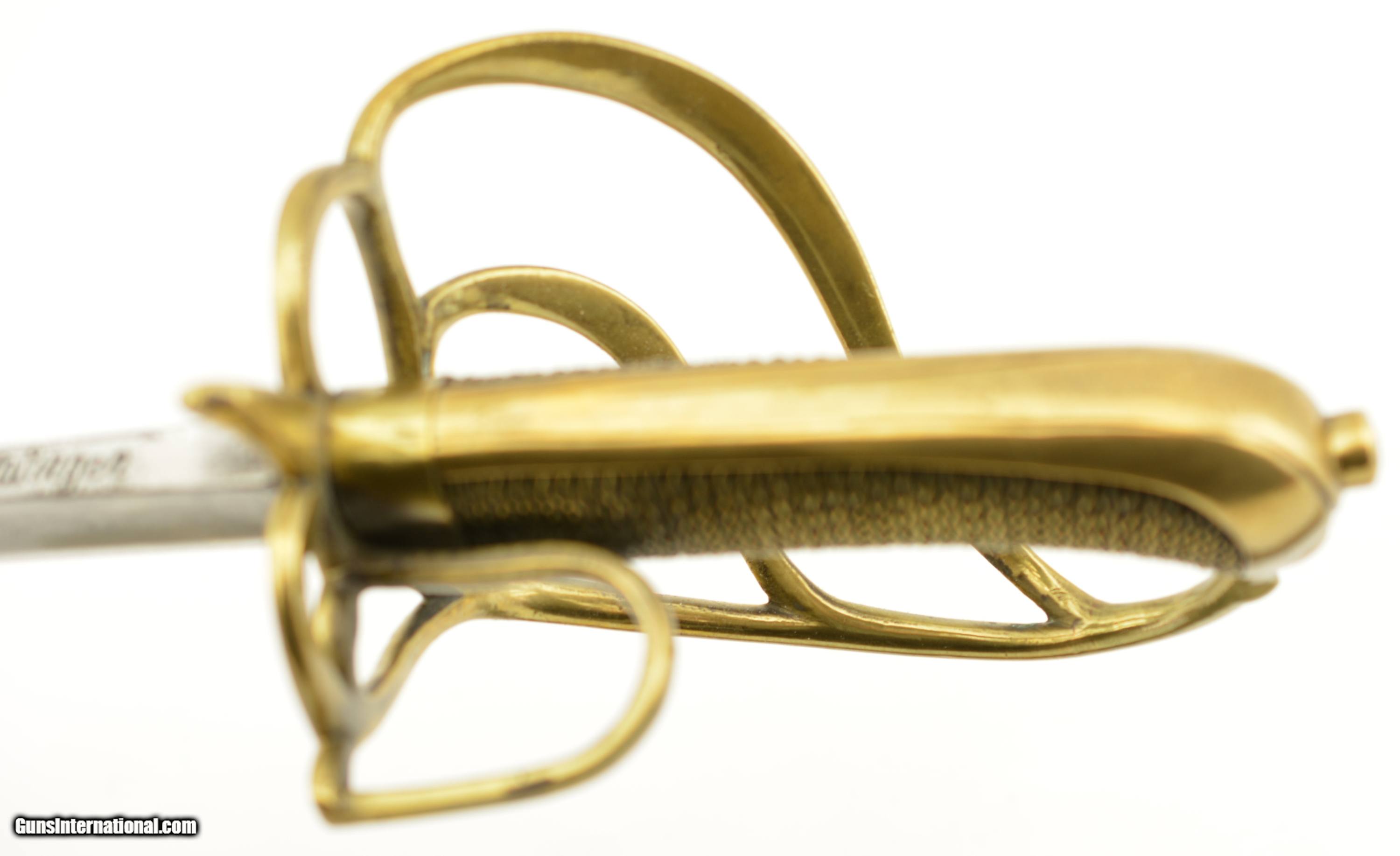 Description: This is a handsome sword that measures 30 1/2" overall, with a 25 1/2" curved, single-edged blade having wide single fullers. The steel has been cleaned to bright, but has begun to reacquire a dull gray patina, and has old sharpening marks along the edge. A large bear, heraldic emblem of the Swiss canton of Bern, is present on either side of the forte, and the back edge is engraved with the maker’s name: "Rodolphe Daniel Kirschbaum Fabricant a Solingen." The fairly bright brass hilt has a complicated guard with single forward-swept quillon, thumb loop, heart-shaped counterguard, and double-branched knucklebow. The grip has tightly wound, braided wire, and terminates in a vaguely bear’s head-shaped pommel with exposed capstan rivet. The brown leather scabbard has several creases along its length, with heavy flaking and some breaks in the leather just above the brass chape. The throat has a heart-shaped frog stud, and the brass has been cleaned at some point. The blunt-tipped chape has an identical patina, with numerous small peen marks at the tip. This is a wonderful 18th century military sword, seldom-seen in the US, and would make a splendid addition to any collection. SOLD Manufacturer: Kirschbaum Model: Sword |
