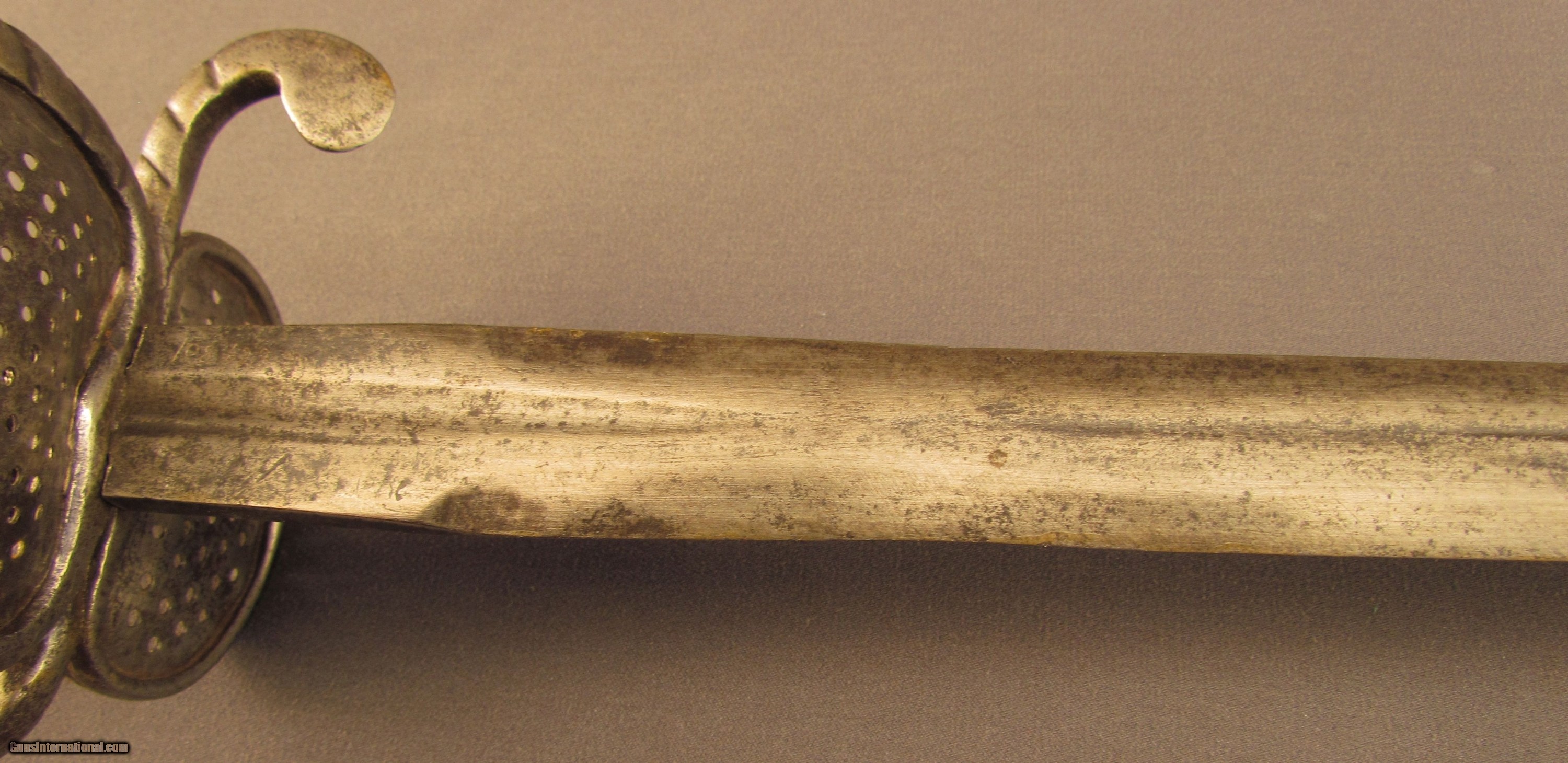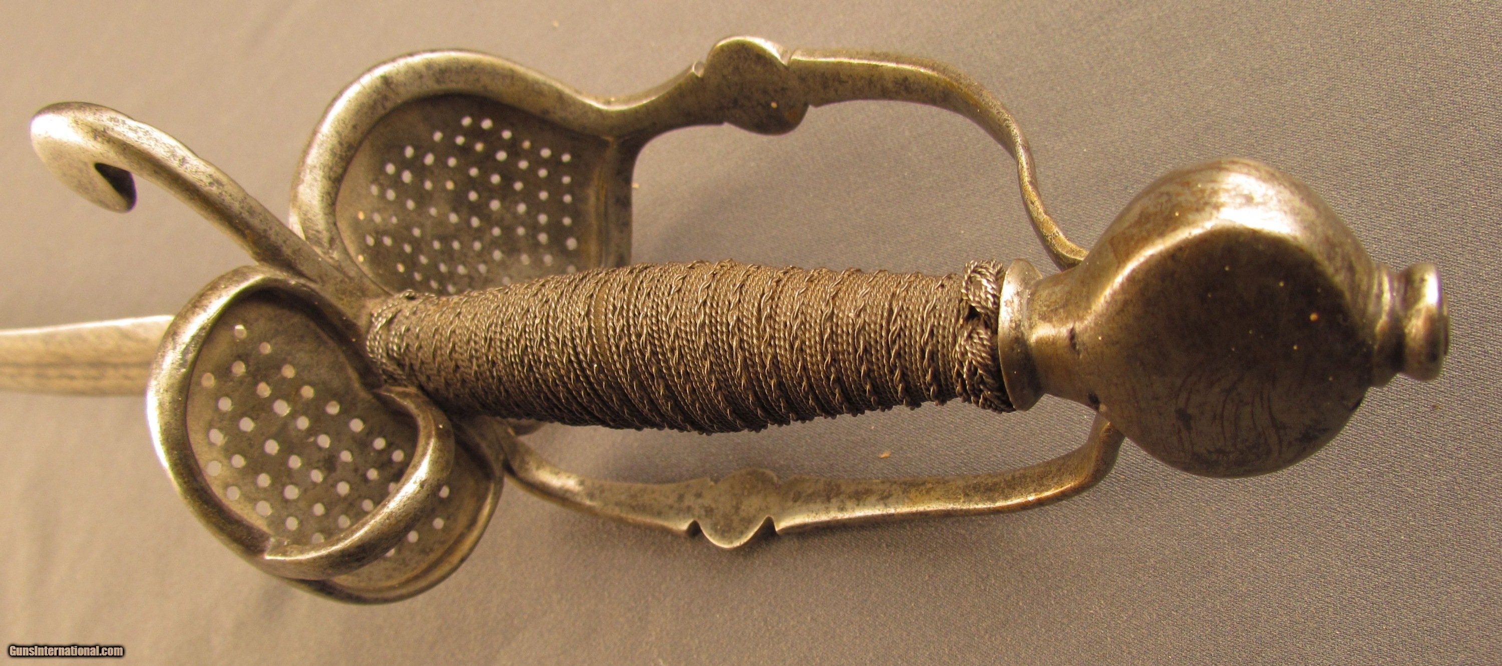 Description: This is a long horseman's sword built in the style favored by the Low Countries during the mid-18th century. It measures 43 1/8" overall with a 36 1/2" straight, double-edged blade having very shallow central fullers. The iron has an overall mottled gray-black patina throughout with distinct layering now visible along the blade and traces of the central fullers still barely visible at the forte and along the tapered ricasso. Additionally, there is a very small and faint collection or inventory number added to the ricasso obverse. The iron hilt has a single forward swept quillon, perforated iron counterguard with thumb loop, knucklebow, and second branch at 90 degrees secured at the pommel by a more modern slot-head screw (originally there would have been a rivet). The tapered grip has a slightly loose, but intact, braided wire wrap and ends in an urn-shaped pommel with exposed capstan rivet. Swords similar to this pattern were used in North America during both the French and Indian War, as well as the Revolutionary War. This is a particularly nice example and is in very good plus condition. {Ref. “Swords & Blades of the American Revolution" by George C. Neumann; 1973} SOLD Manufacturer: European Model: Sword |