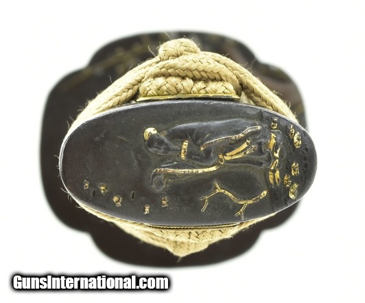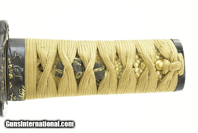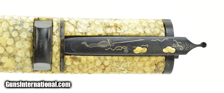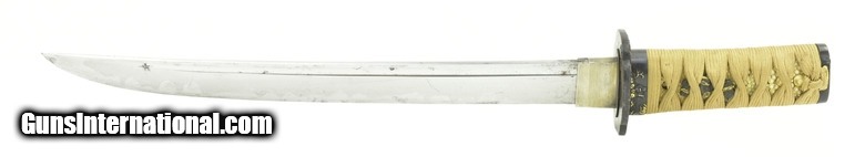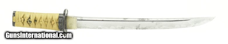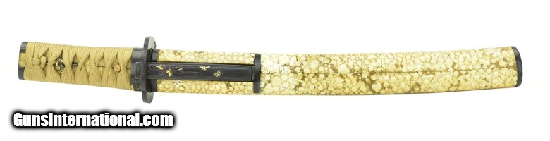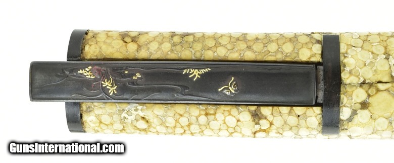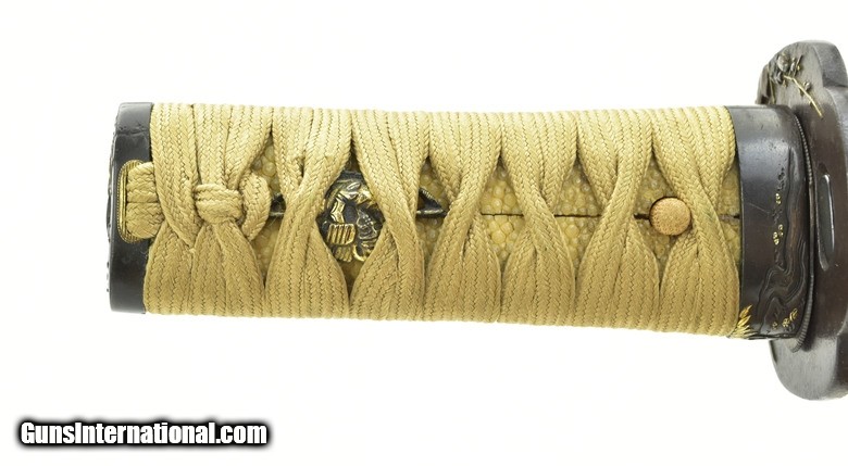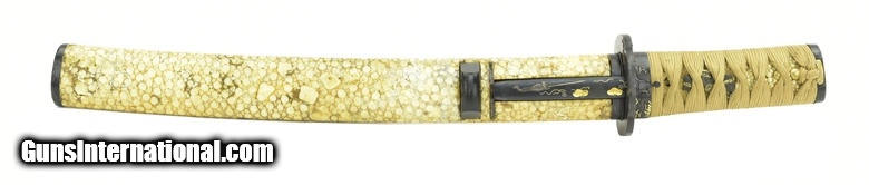 Description: A Japanese Tanto in mounts This blade is 11¾” (29.6 cm) in length. It is ubu with two holes and unsigned. It featured a single groove on each side. The hamon is gonome midare. The fuchi, kashira and menuki are shakuio ground with figures. The iron tsuba has a floral motif. The kodzuka and kogia are shakudo and unsigned. The saya has been ground shark shin finish. SOLD |