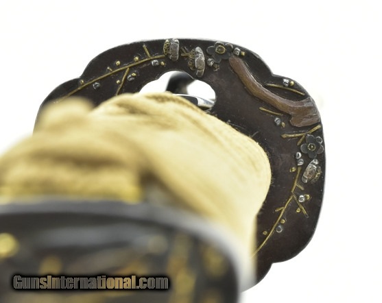 A Japanese Tanto in mounts This blade is 11¾” (29.6 cm) in length. It is ubu with two holes and unsigned. It featured a single groove on each side. The hamon is gonome midare. The fuchi, kashira and menuki are shakuio ground with figures. The iron tsuba has a floral motif. The kodzuka and kogia are shakudo and unsigned. The saya has been ground shark shin finish.