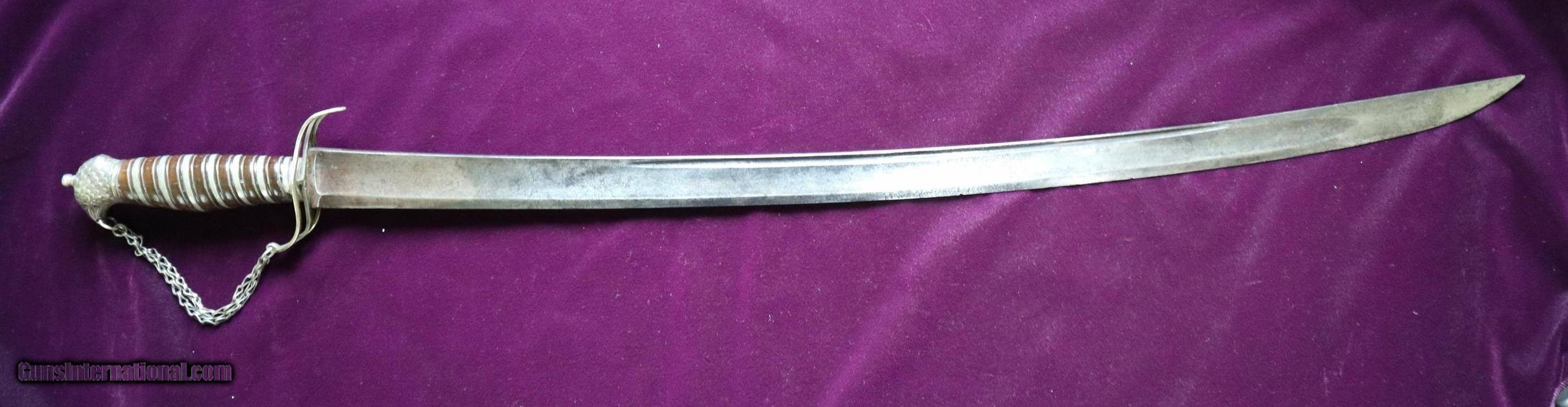 Description: PRESERVING HISTORY, REVOLUTIONARY WAR HIGH GRADE BALTIMORE SILVER HILT EAGLE HEAD SWORD OWNED BY BILL GUTHMAN C 1780-85 . MEASURES 33 INCHES OVERALL WITH A 27 INCH BLADE. PURCHASED FOR $9000 IN 2006.THIS SWORD WAS MADE DURING THE REVOLUTION OR SHORTLY AFTER. GUTHMAN MENTIONED AS CA 1785 SIMILAR EXAMPLES WERE MADE AS EARLY AS 1780. WHEN YOU BUY THE BEST YOU WILL NEVER HAVE TO MAKE EXCUSES LATER. SOLD |