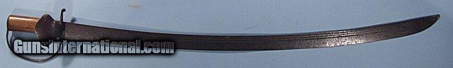 Description: AMERICAN REVOLUTIONARY WAR "CLAMSHELL GUARD" HORSEMAN'S SABER, CIRCA 1775-6. 36" overall with 31" blade with three narrow fullers associated with New Hampshire origin swords. Walnut grip. Distinct "clamshell" iron guard. Beautiful deep old patina on metal. 100% original. A typical and popular form of American hilt usually found as a short sword or "cuttoe" and scarce in a large horseman's saber. We know of one other almost identical in size. Excellent provenance. SOLD |