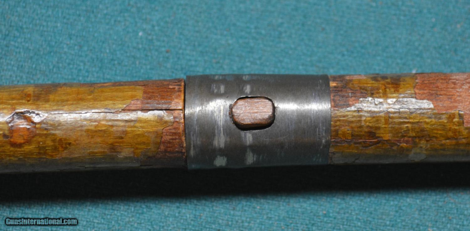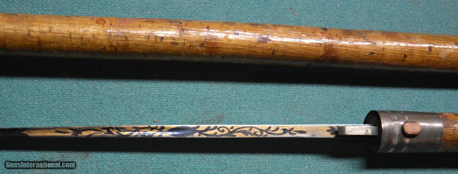 Description: SOLD Antique cane sword/dagger with what appears to be birch with it's bark. 35 1/2" overall with a 12 3/4" blade of stiletto form. Some wear to hand grip area and near the iron tip. Approximately 75 to 80% of the bark which is covered by a clear lacquer remains intact. The button to release the blade from the body of the cane protrudes from a pewter ferrule (it looks to be pewter and a magnet is attracted to one part of the ferrule....therefore it could be a sheet of iron with a tin plating giving the apperance of pewter). Blade has 99% of it's fire blue with gold wash in and around the engraved decoration. This type of decoration was prevalent in the 1790 to 1820 period.....after 1820, the most common decoration was a polished/etched floral design without the gold wash or fire blue. The cane is of light weight thus making it fashionable for both ladies or gentleman as was practiced during this period. A very fine and rare item fit for an advanced collection or museum. Sold as an antique for display only. Please see all photographs and ask any questions prior to buying as return only if not as described and must be in the same condition as sent. SOLD |