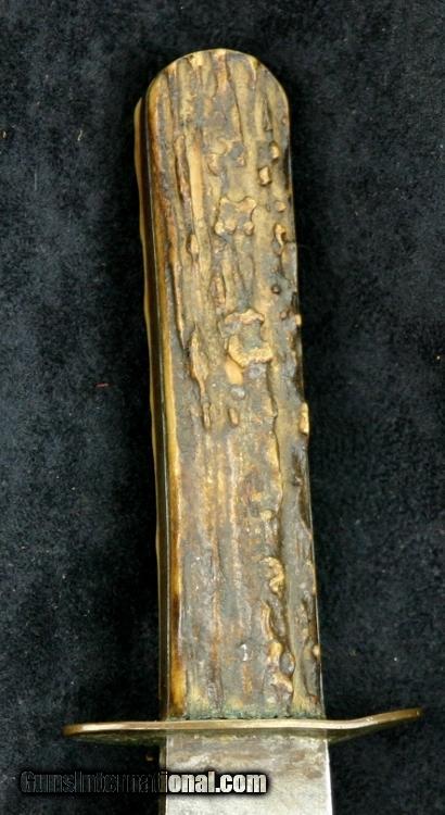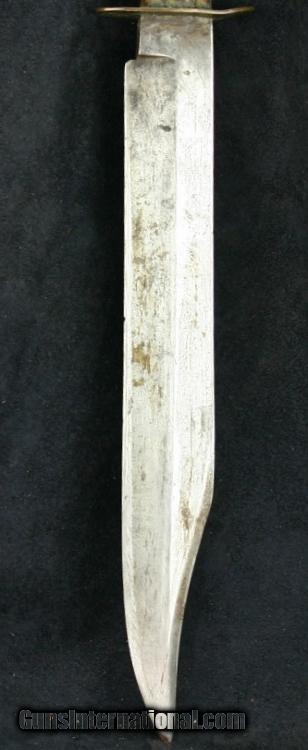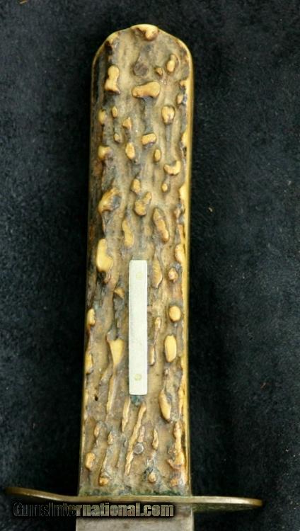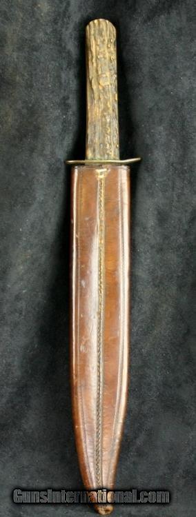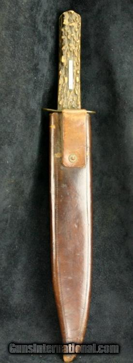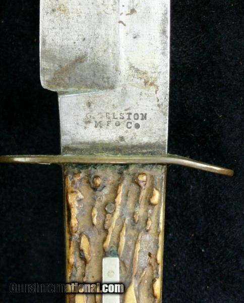 Description: 14 1/2 inches overall, 10 inch clip point blade, excellent stag grips, marked "G. Gelston /Mfg Co, no country of origin so American made, 10 inch leather scabbard, belt loop replaced. SOLD |