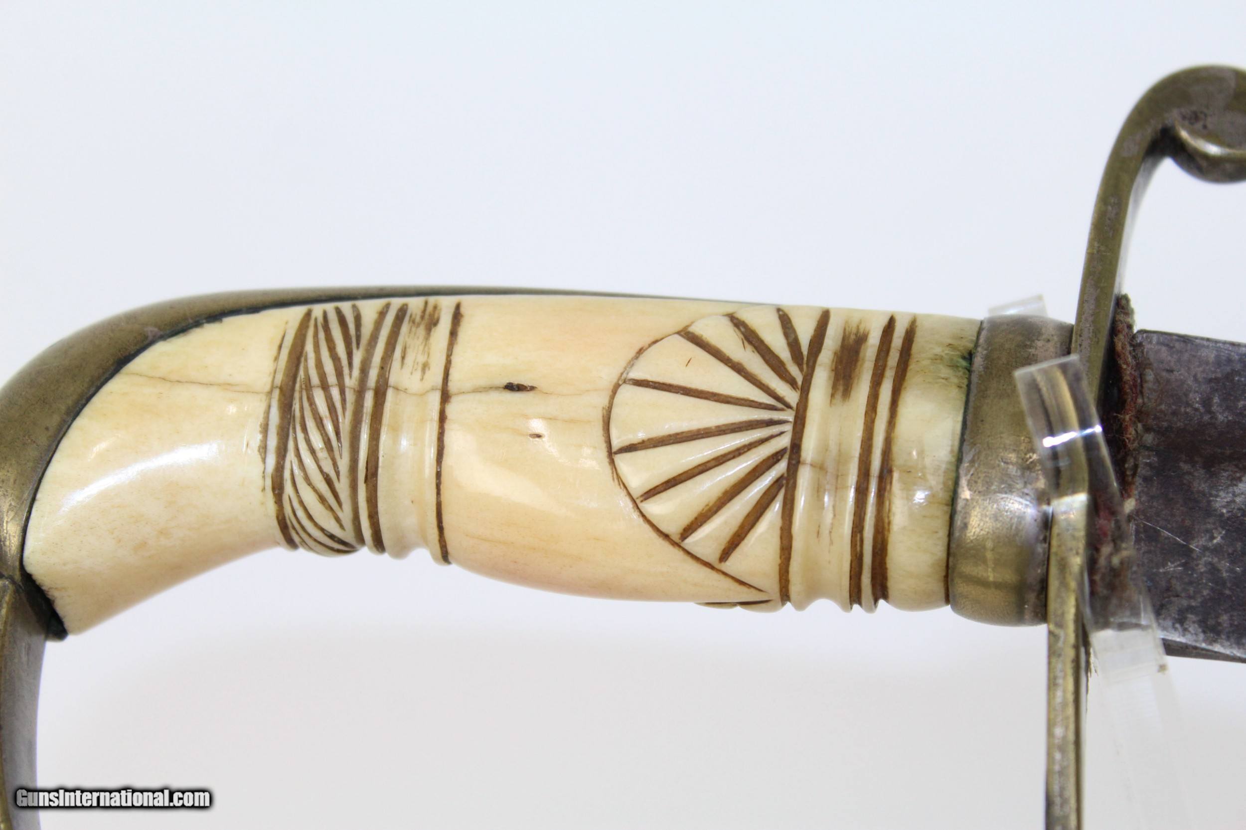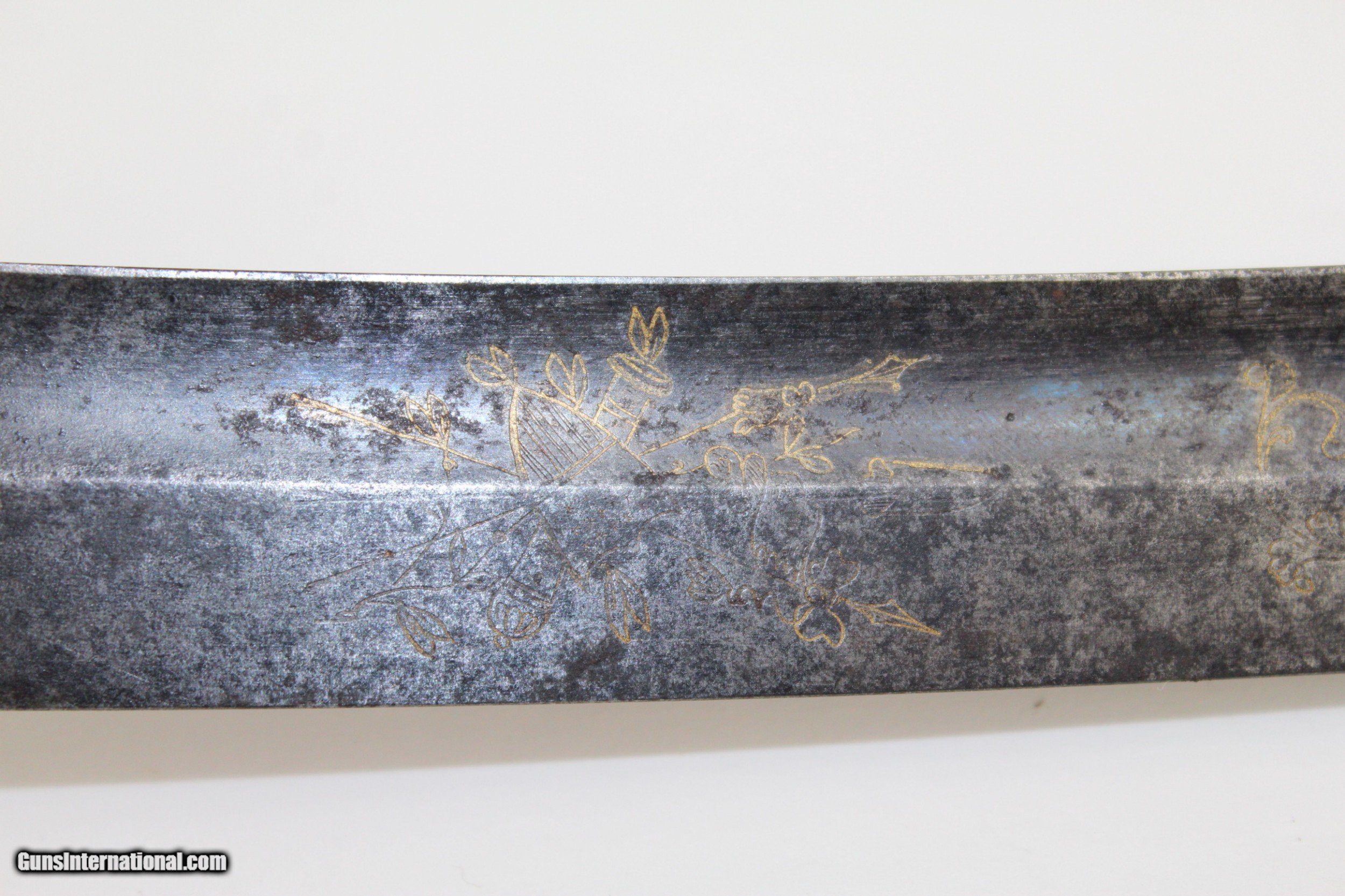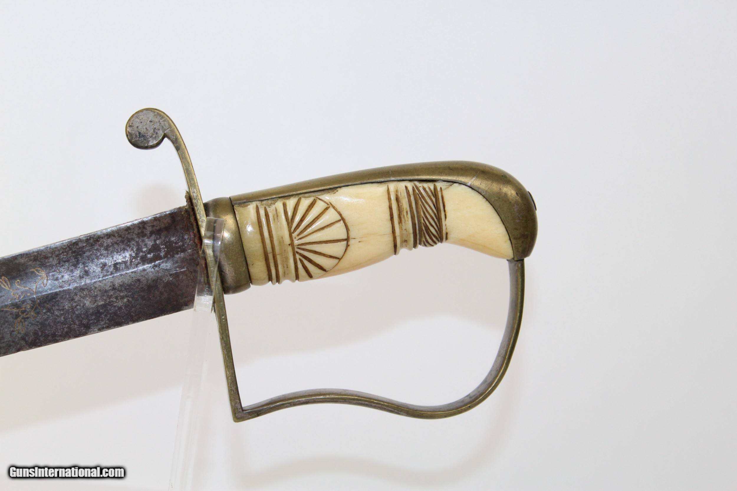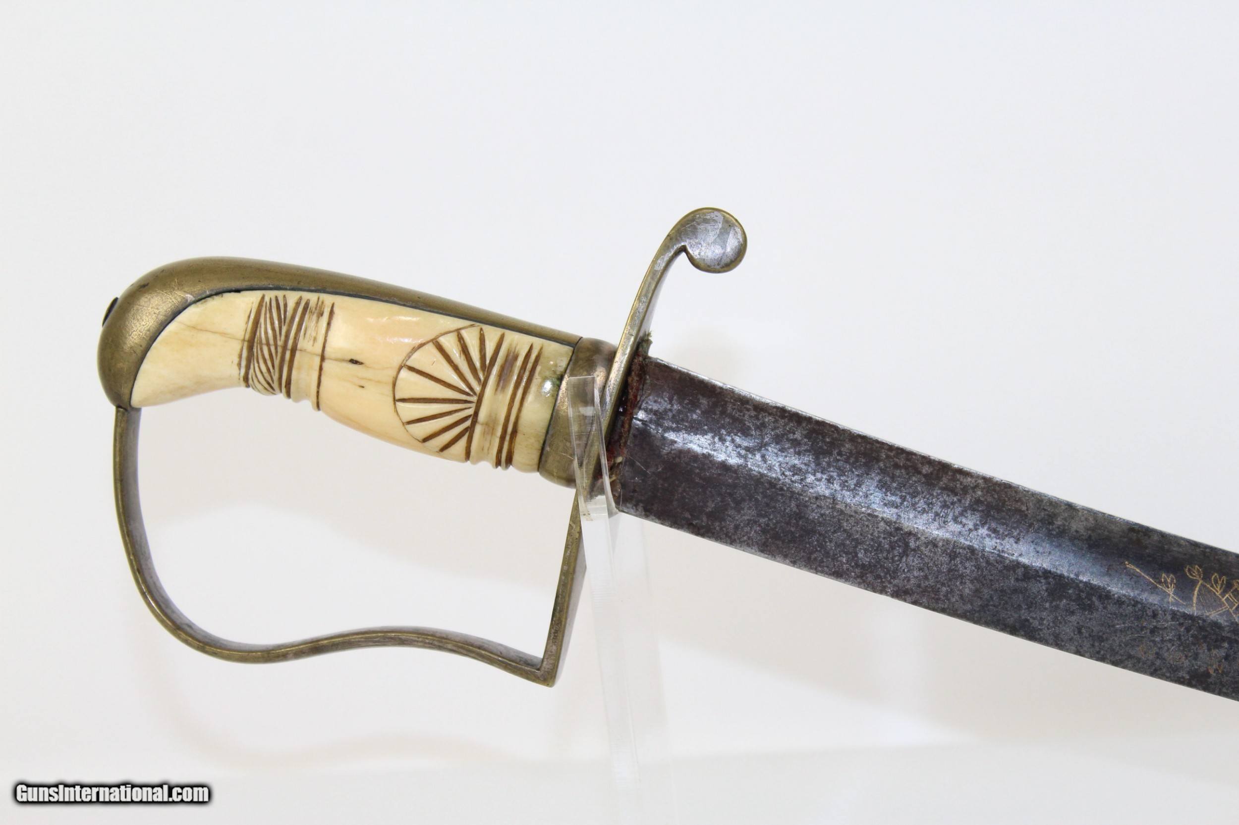 Description: c.1820s Antique American ARTILLERY Saber by WOLFE Featuring an Etched Blade and Bone Grip Here we present an Antique American Artillery Saber, made circa the 1820s. This beautiful saber would have been privately purchased by an officer from C & J.D. Wolfe in New York City. This sword features a sweeping blade engraved and washed in gold and finished in nitre blue. The bone handle is carved in an aesthetically pleasing way that would have provided some measure of traction. The spine is marked “Sold by C&J.D. Wolfe New York”. The overall condition is very good. The etched blade is 30 inches in length. Much of the gold and nitre blue has worn away with time and use. The grip is in very good shape and smooth. Here is a very beautifully-appointed US officer’s sword for your collection! Own the original! This is a legitimate antique and not a reproduction. Overall condition as seen in photos. Very Fast. Very Safe. FREE SHIPPING WORLDWIDE. Delivered directly to your door by express mail! Guaranteed AUTHENTIC & Includes CERTIFICATE OF AUTHENTICITY. ancestryguns $1200 #7137.3 SOLD |