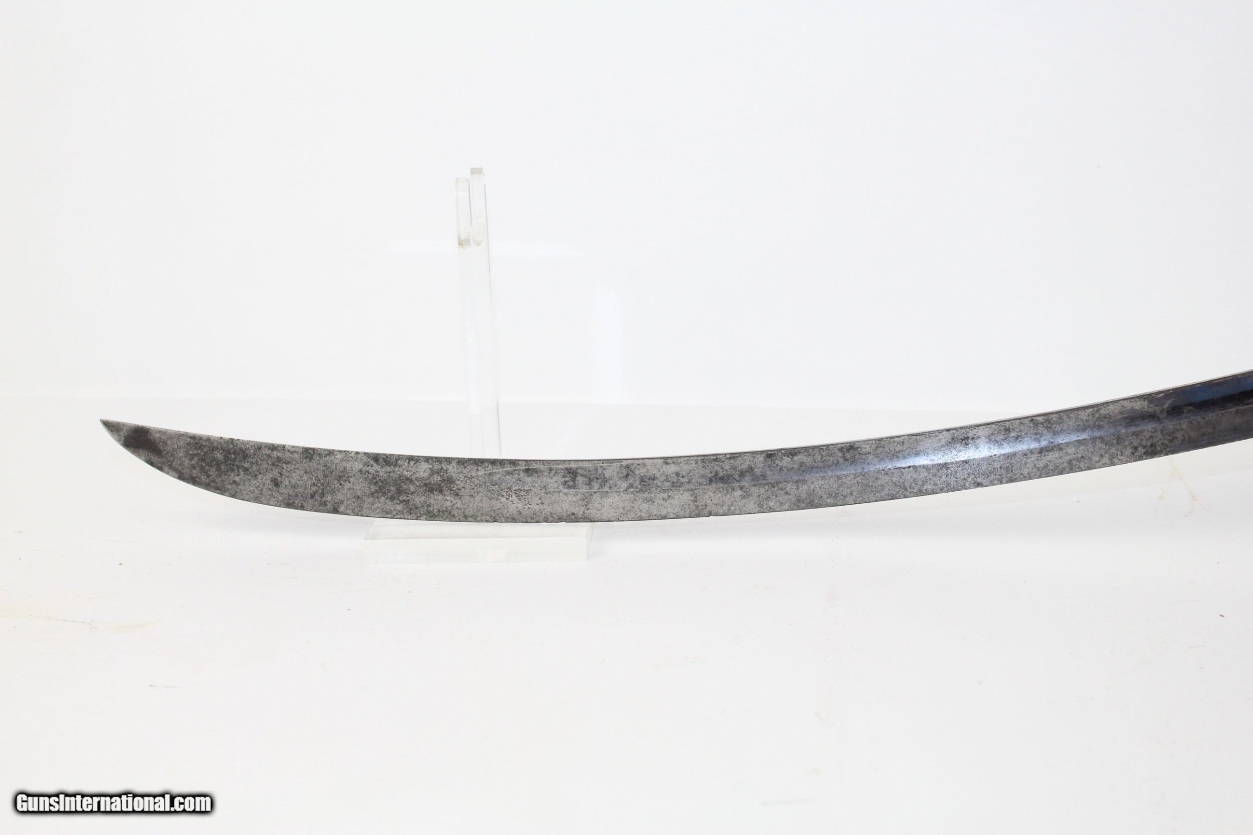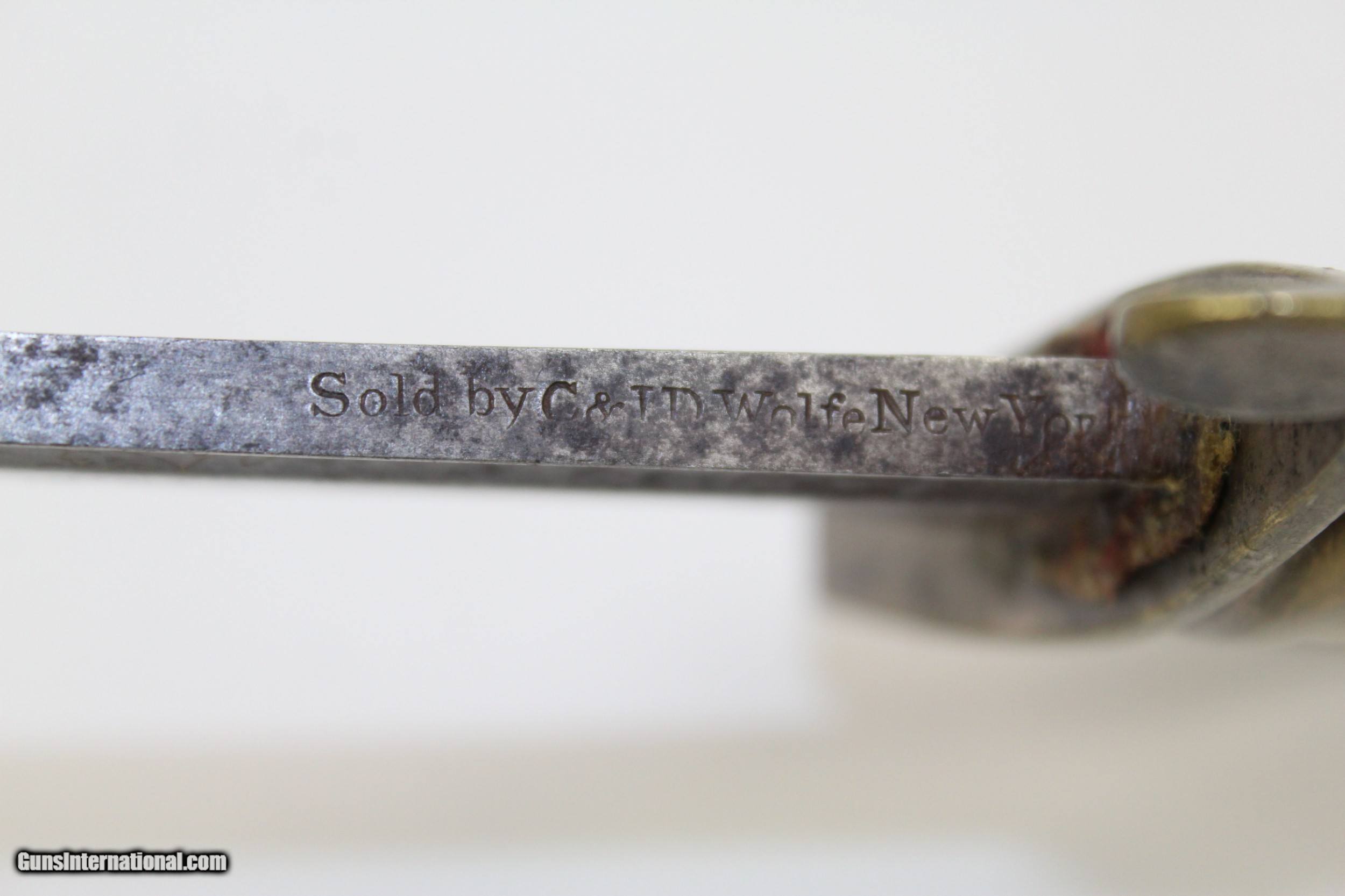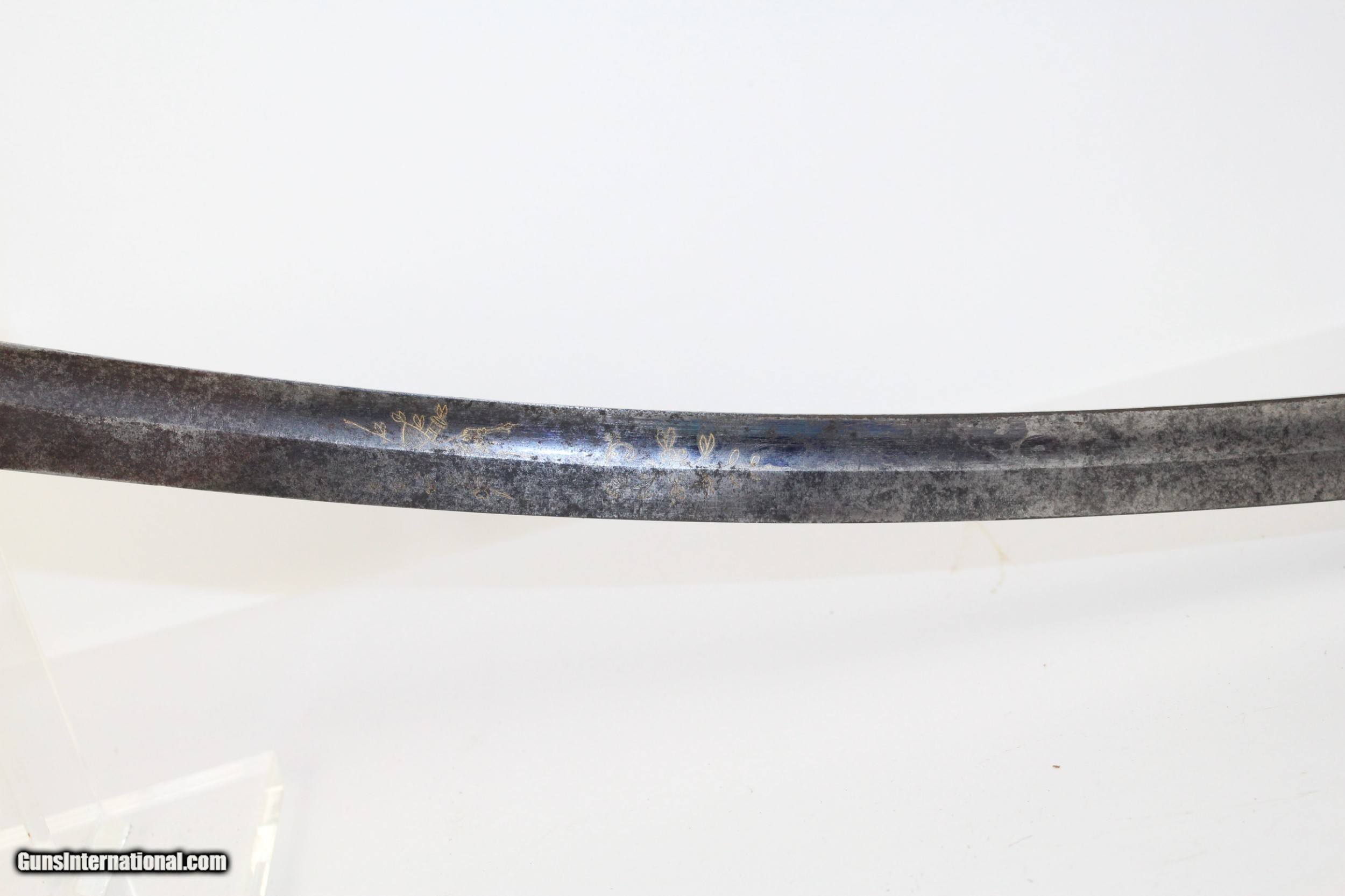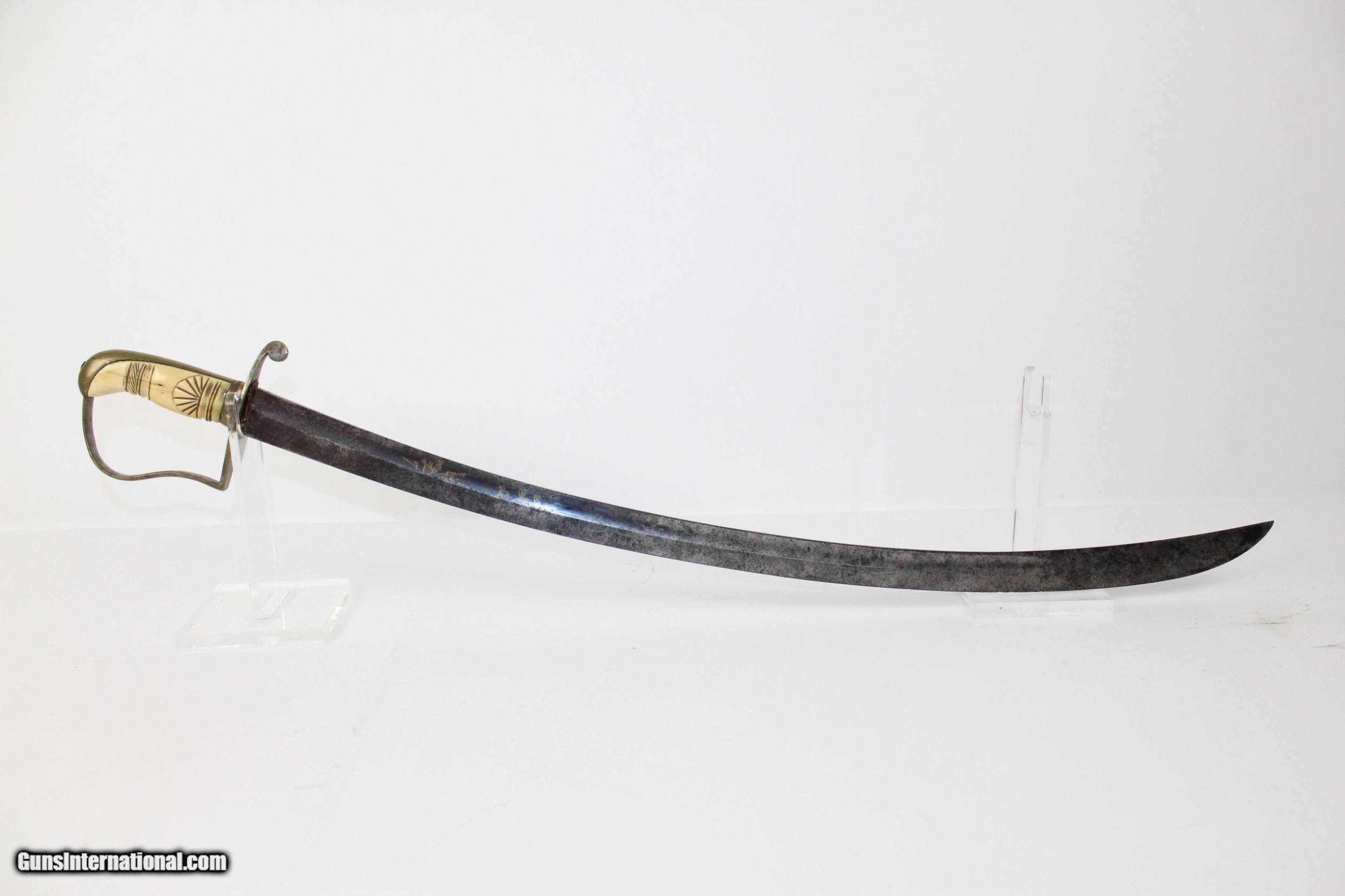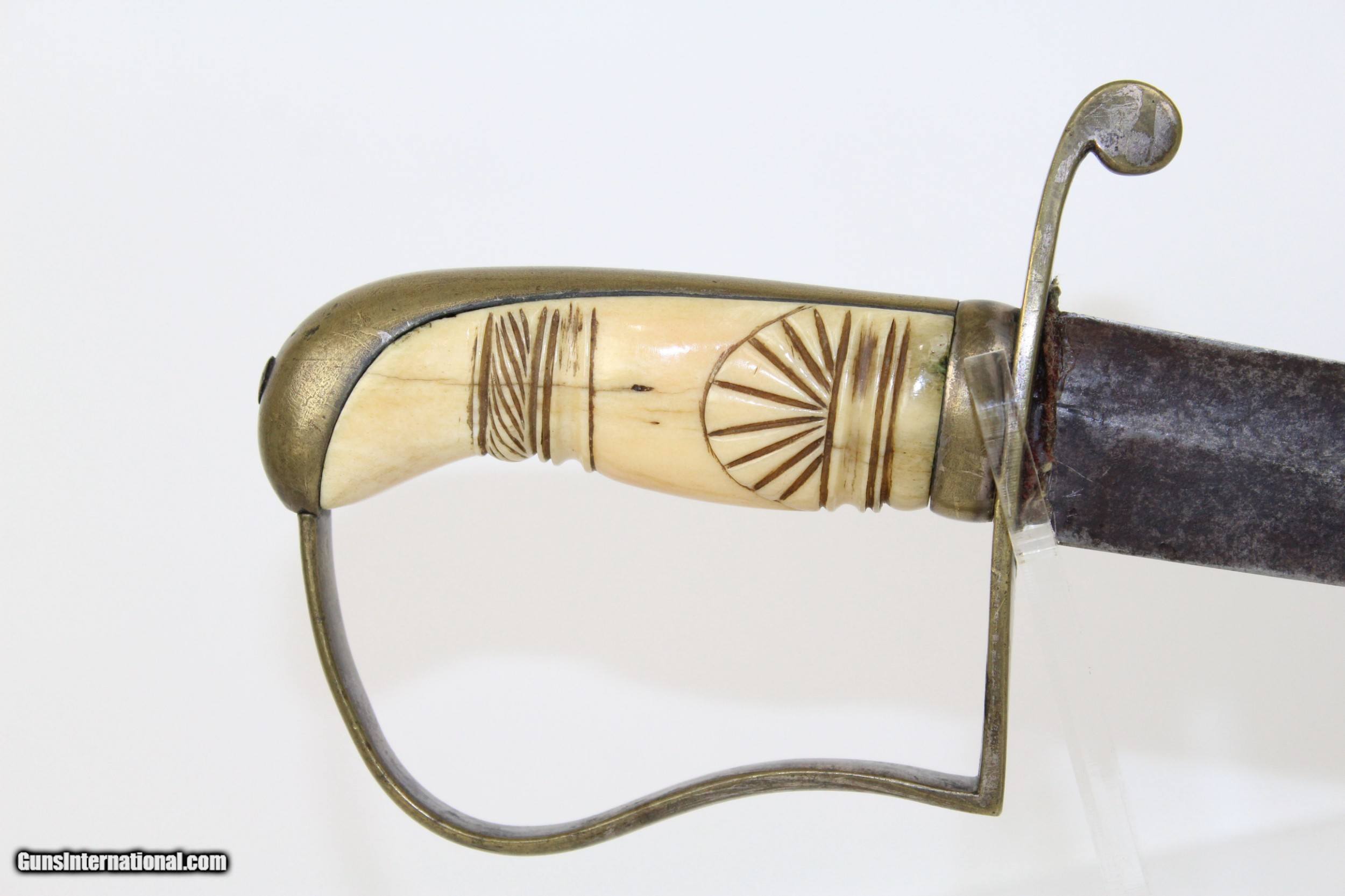 Description: c.1820s Antique American ARTILLERY Saber by WOLFE Featuring an Etched Blade and Bone Grip Here we present an Antique American Artillery Saber, made circa the 1820s. This beautiful saber would have been privately purchased by an officer from C & J.D. Wolfe in New York City. This sword features a sweeping blade engraved and washed in gold and finished in nitre blue. The bone handle is carved in an aesthetically pleasing way that would have provided some measure of traction. The spine is marked “Sold by C&J.D. Wolfe New York”. The overall condition is very good. The etched blade is 30 inches in length. Much of the gold and nitre blue has worn away with time and use. The grip is in very good shape and smooth. Here is a very beautifully-appointed US officer’s sword for your collection! Own the original! This is a legitimate antique and not a reproduction. Overall condition as seen in photos. Very Fast. Very Safe. FREE SHIPPING WORLDWIDE. Delivered directly to your door by express mail! Guaranteed AUTHENTIC & Includes CERTIFICATE OF AUTHENTICITY. ancestryguns $1200 #7137.3 SOLD |