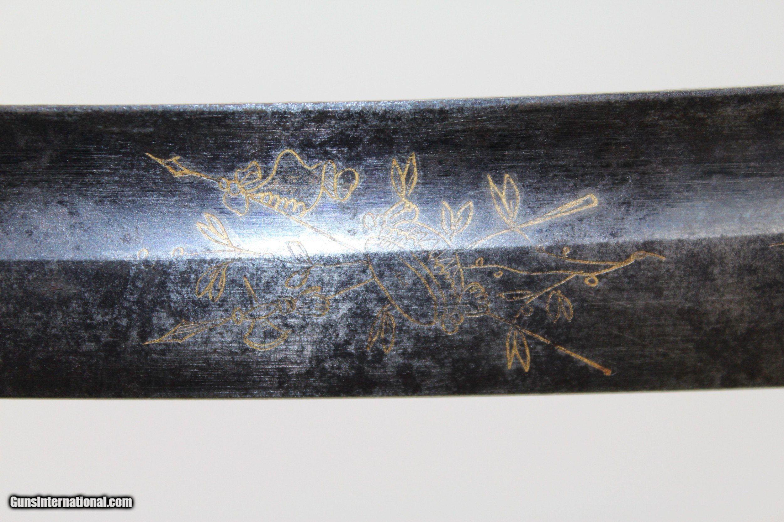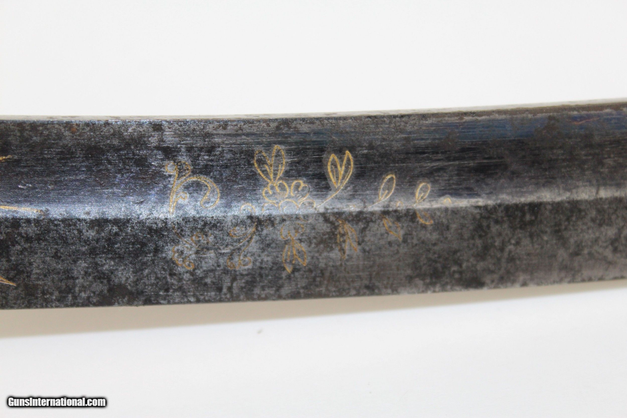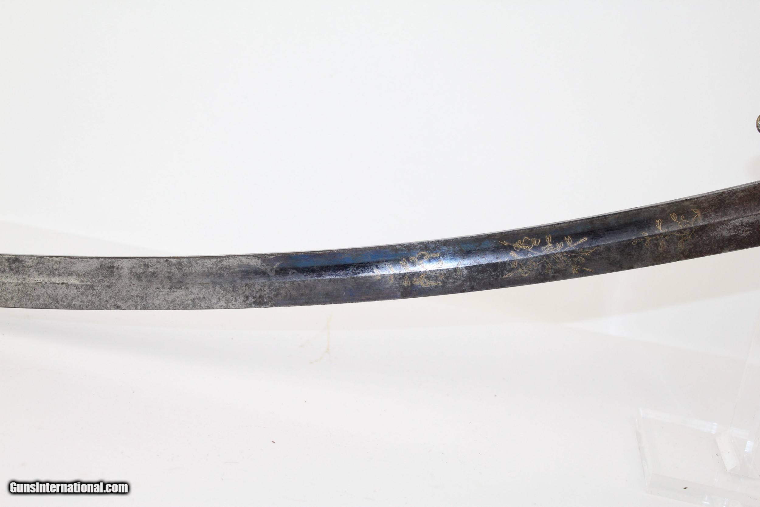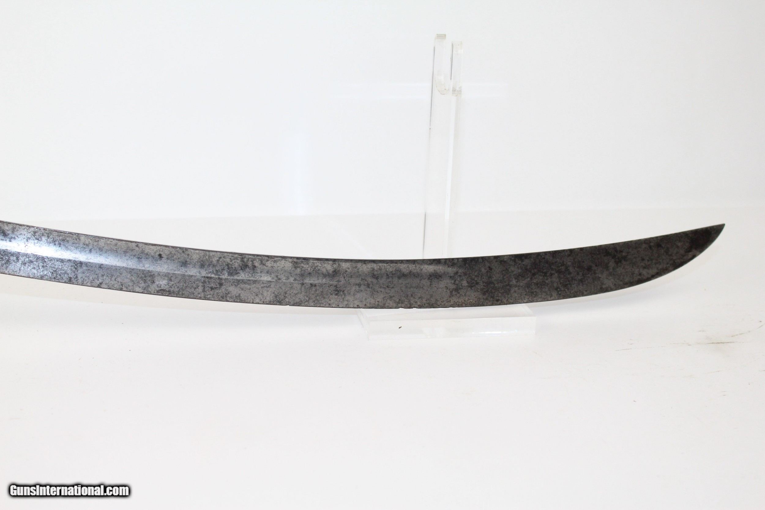 Description: c.1820s Antique American ARTILLERY Saber by WOLFE Featuring an Etched Blade and Bone Grip Here we present an Antique American Artillery Saber, made circa the 1820s. This beautiful saber would have been privately purchased by an officer from C & J.D. Wolfe in New York City. This sword features a sweeping blade engraved and washed in gold and finished in nitre blue. The bone handle is carved in an aesthetically pleasing way that would have provided some measure of traction. The spine is marked “Sold by C&J.D. Wolfe New York”. The overall condition is very good. The etched blade is 30 inches in length. Much of the gold and nitre blue has worn away with time and use. The grip is in very good shape and smooth. Here is a very beautifully-appointed US officer’s sword for your collection! Own the original! This is a legitimate antique and not a reproduction. Overall condition as seen in photos. Very Fast. Very Safe. FREE SHIPPING WORLDWIDE. Delivered directly to your door by express mail! Guaranteed AUTHENTIC & Includes CERTIFICATE OF AUTHENTICITY. ancestryguns $1200 #7137.3 SOLD |