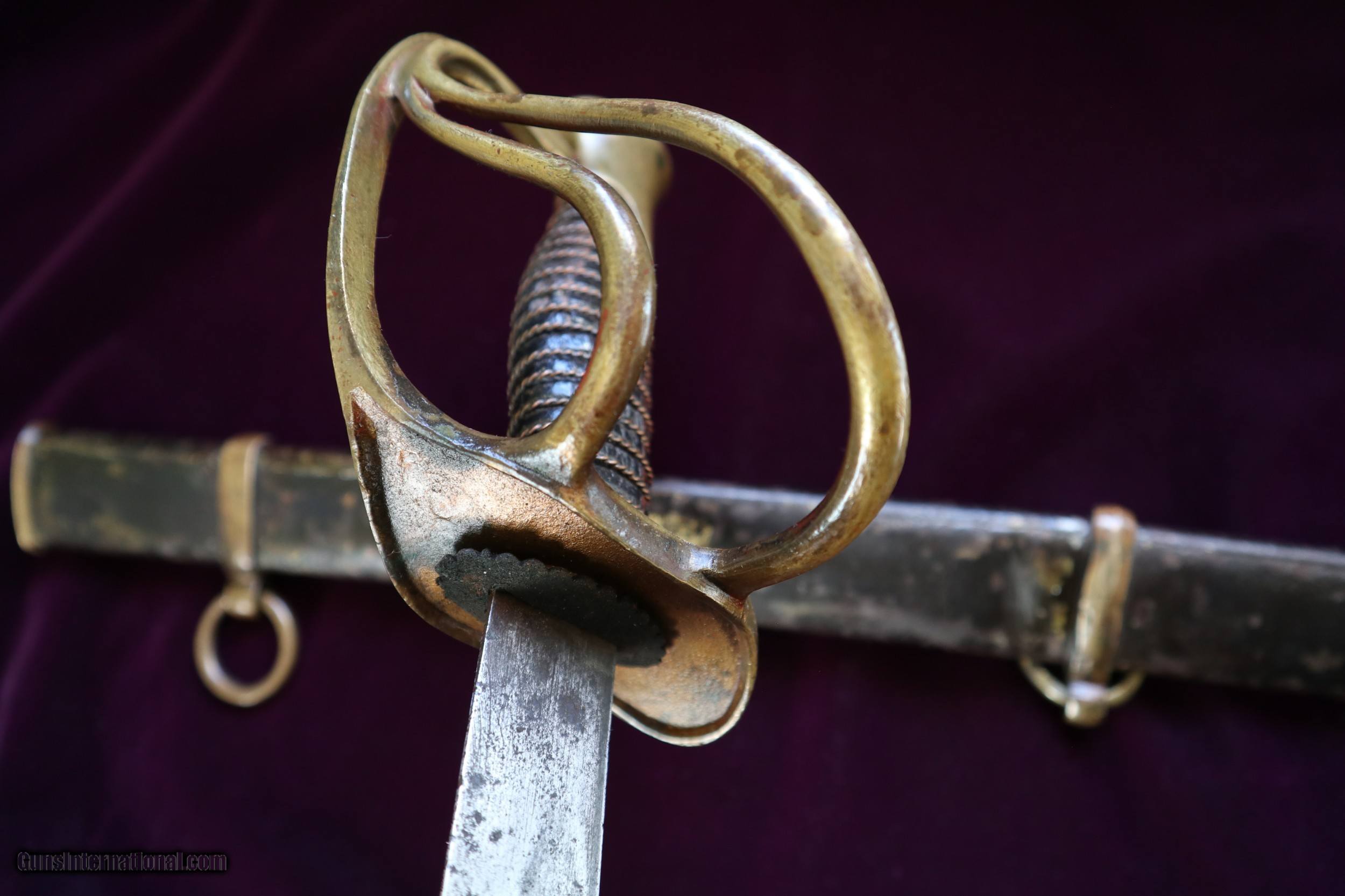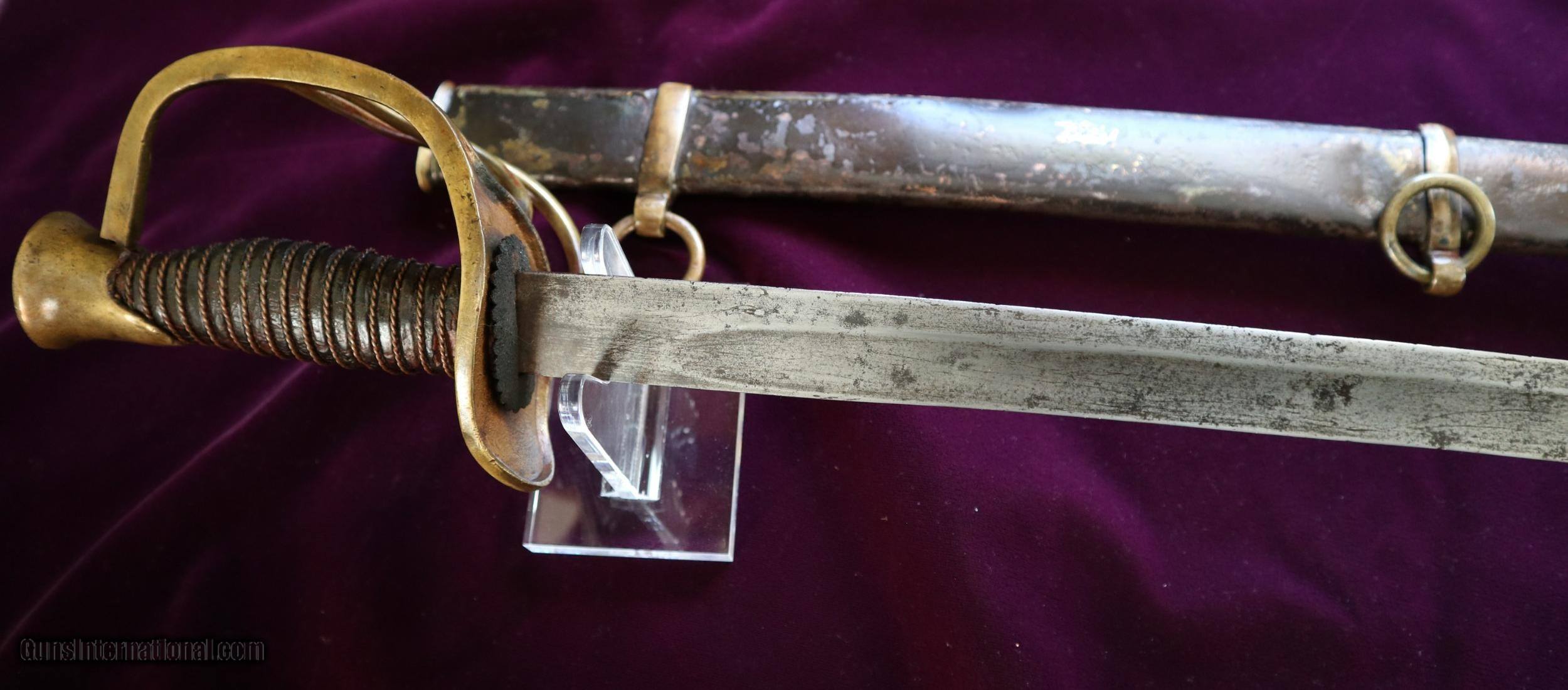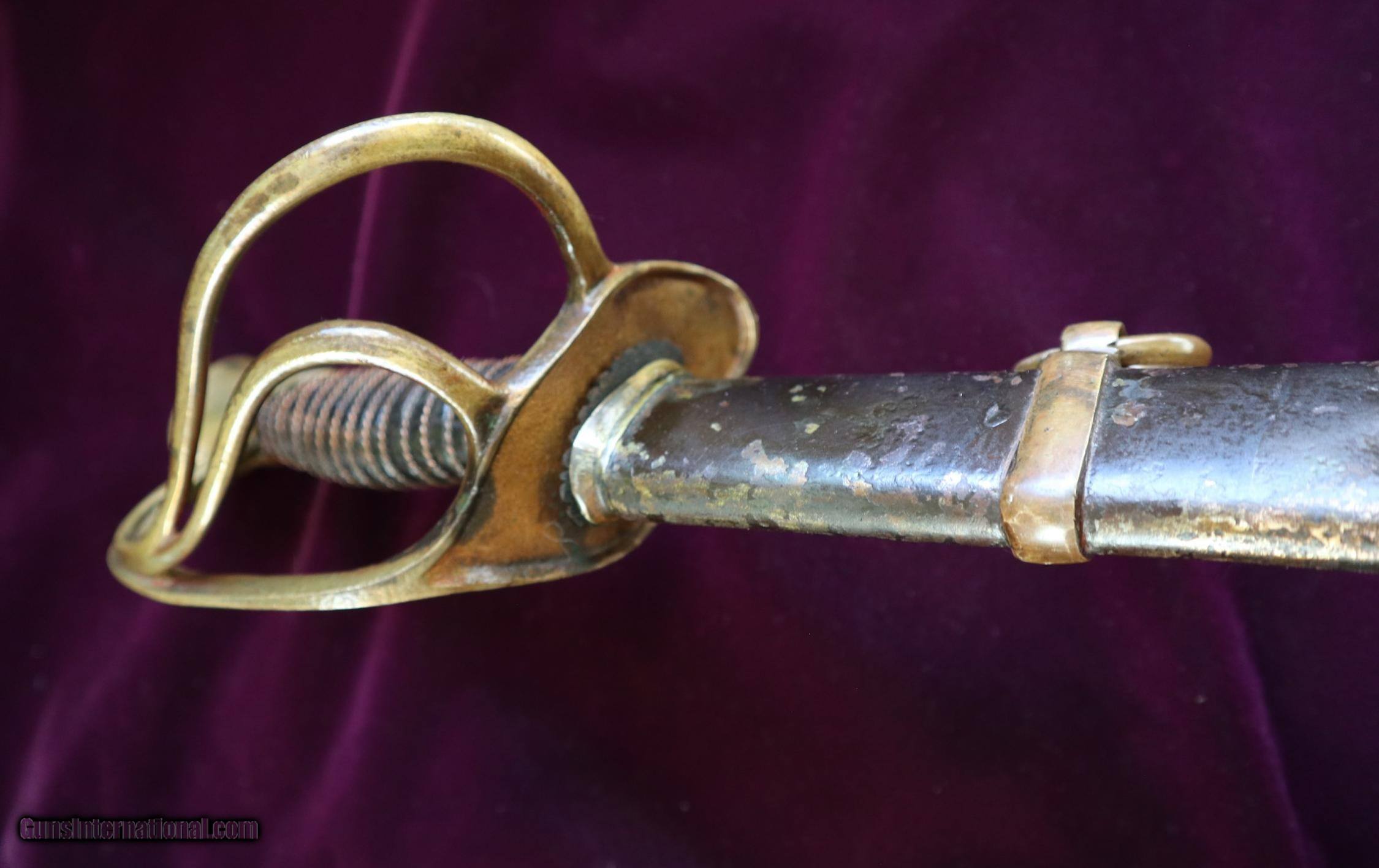 Description: PRESERVING AMERICAN HISTORY, CIVIL WAR CONFEDERATE COLUMBIA B. DOUGLAS SOUTH CAROLINA CAVALRY SWORD SABER Columbia, B Douglas South Carolina Confederate Cavalry Saber WOW! This is the most attractive one of this pattern Confederate cavalry sabers I've encountered. This is the pattern of cavalry saber for an enlisted rebel that was manufactured in Columbia, South Carolina. There is at least one marked example that is know which is how we know where it was made and by whom. This one is completely unmarked. It has the full-length 33-1/4th inch blade with a gorgeous untouched look. It has the single fuller gong down each side. The are three shallow nicks along the edge, just enough to know it saw service. Where the blade meets the brass of the handguard, it has the original thick leather washer intact. The hand guard of the sword itself has the classic 3 branches for an enlisted cavalry trooper. The large brass pommel cap is intact and tight. The handle of the sword has the wooden core intact as well as the russet leather. The double twist brass wire is still intact with a fantastic look. You can tell that these swords were produced by need and not for style. It is fierce and functional Confederate weapon. The sword is accompanied by the original iron and brass scabbard. It has the very distinctive Douglas style drag made of thick brass. The mounts are made of brass and they have both of the rings intact. As you can see, the scabbard body still has some of the original factory paint hanging on. This is an exception piece of War Time Confederate manufacture from the Palmetto State. WHEN YOU BUY THE BEST YOU WILL NEVER HAVE TO MAKE EXCUSES LATER. SOLD |