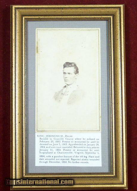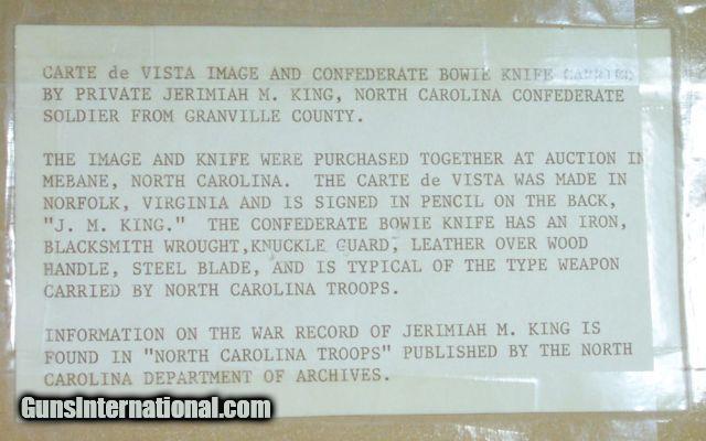 Description: Large NEAR RELIC CONDITION D. Guard Bowie Knife with 13 3/8” clip point blade 18 1/8” L.O.A.; leather covered handle; mounted on 15 ½” X 26” frame with photo of Confederate Jeremiah M. King; no real documents tying knife to him; antique; All items shipped fully insured- Knives, Swords & Sabers $30; (Texas residents please add 6.75% sales tax); return policy: three days inspection from the date the item is received; full refund of shipping both ways ONLY IF THE ITEM IS MISREPRESENTED. Note: International sales only as laws permit. SOLD |