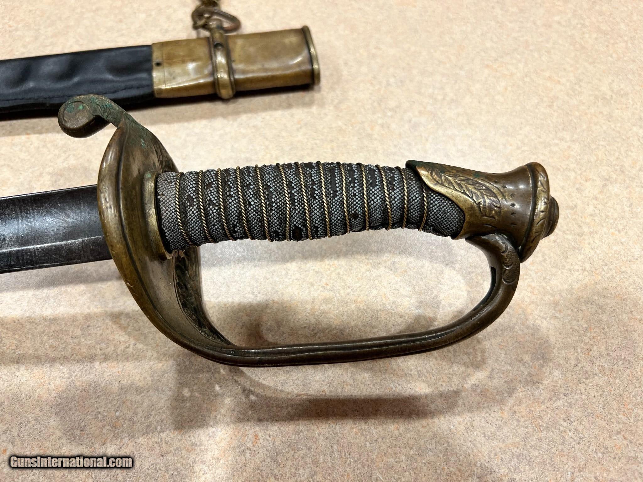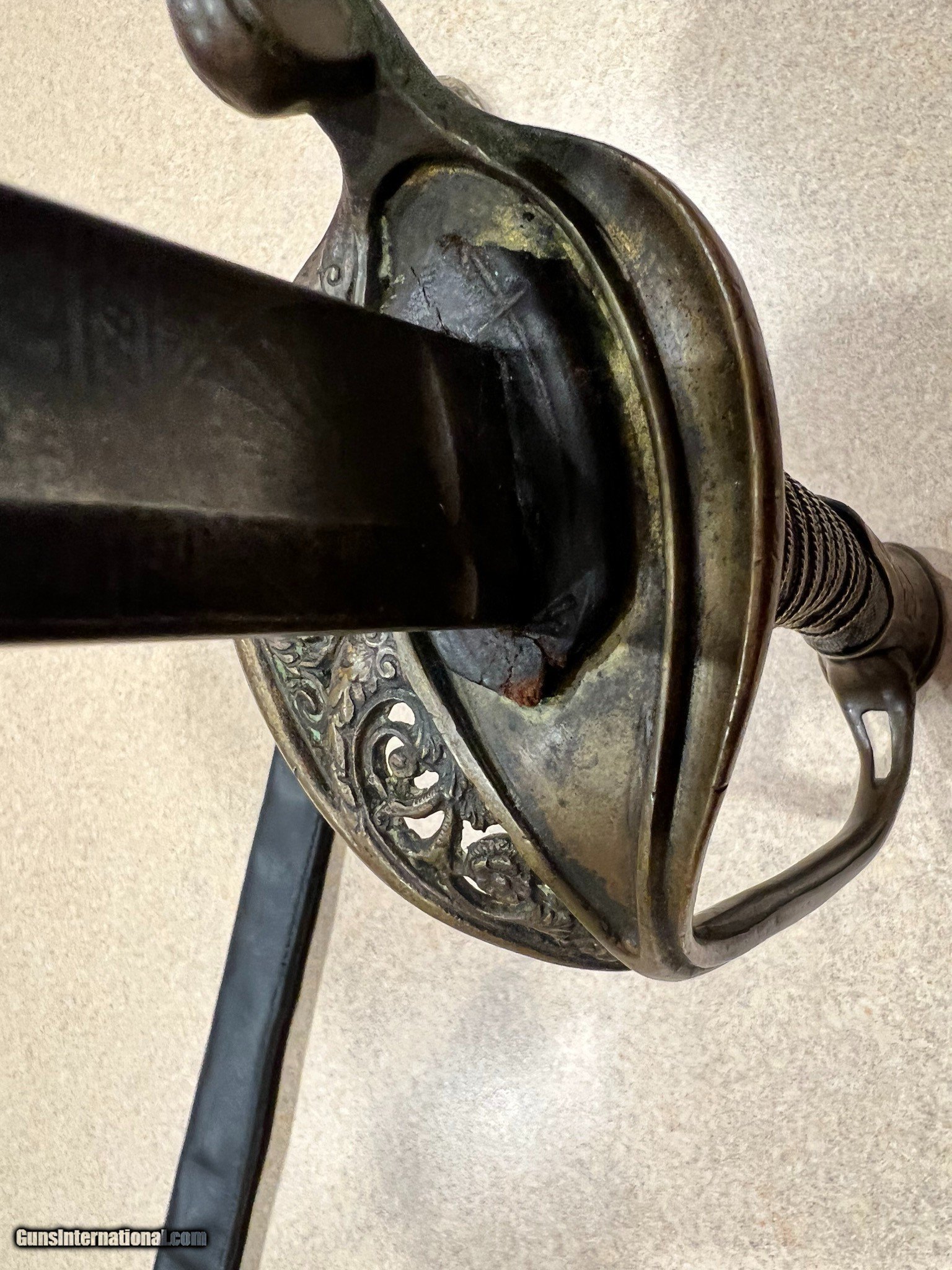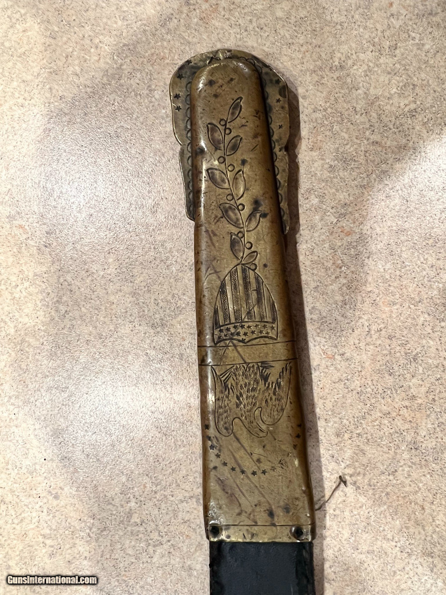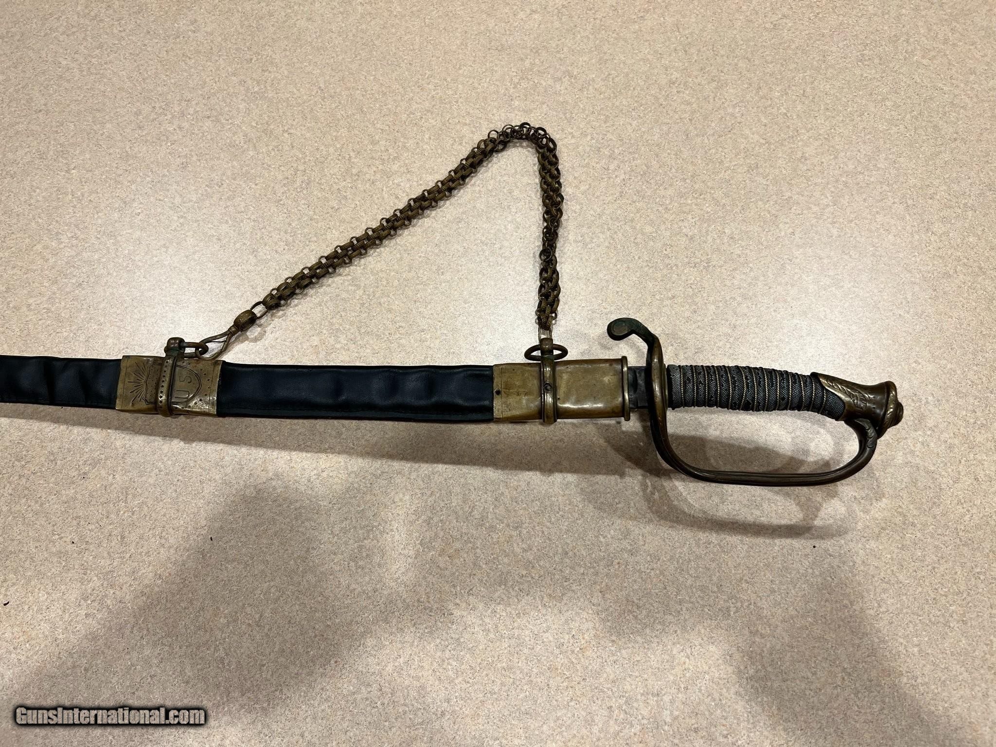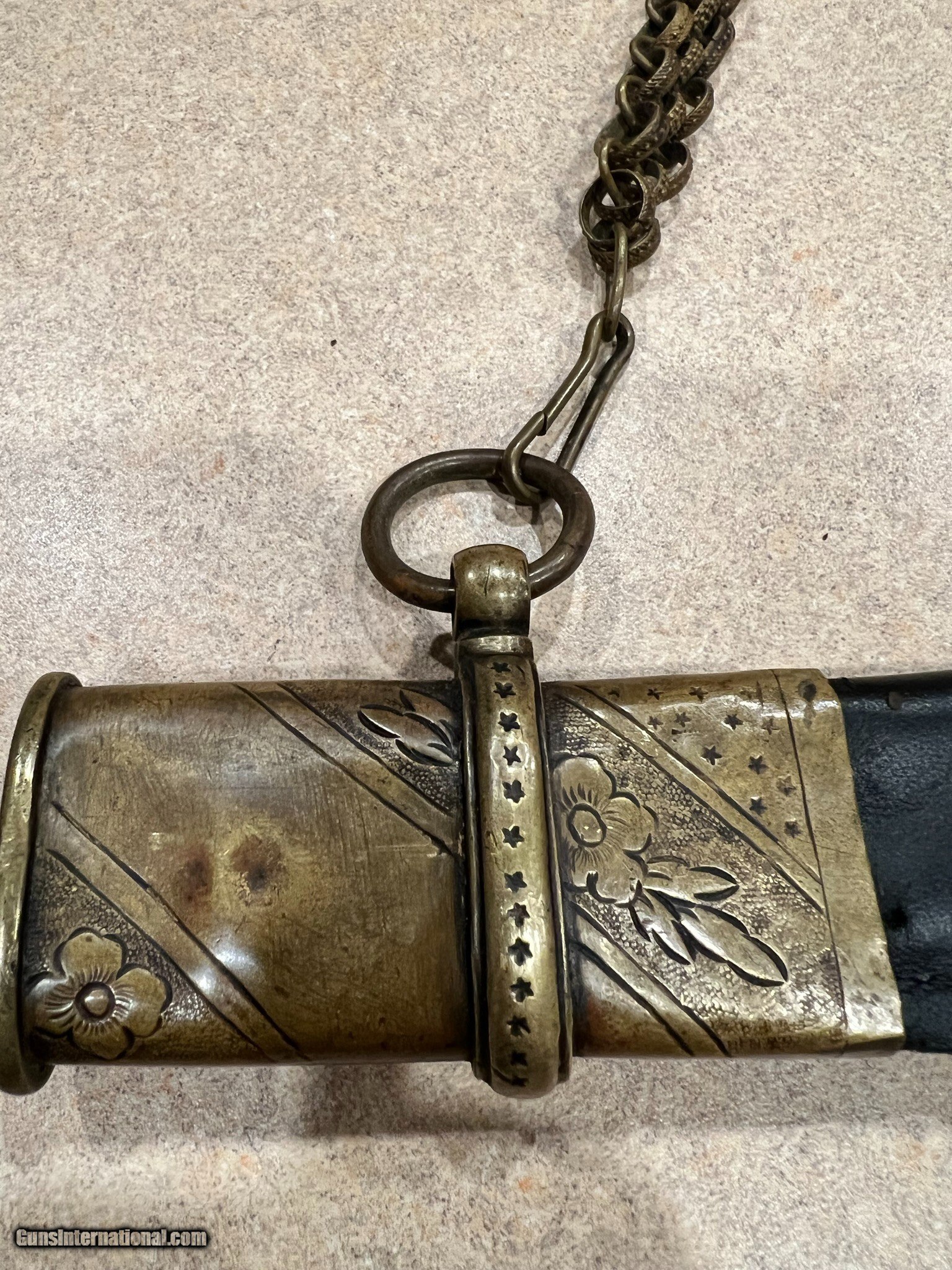 Description: The blade is very crisp and bright with generous original frosting and many patriotic US motifs. The original grip and wire remains intact. A truly fine example of the type of sword carried by line infantry officers up to the rank of Major. The scabbard appears to be redone with modern leather but using the original bands. The chain seems to be original and in great condition. Very beautiful and a must add to a collection. Thanks for looking Larry 248-765-0075 Call or text with any questions Selling this piece cheaper than everyone else for a fast sale 3 day inspection period no FFL required SOLD |