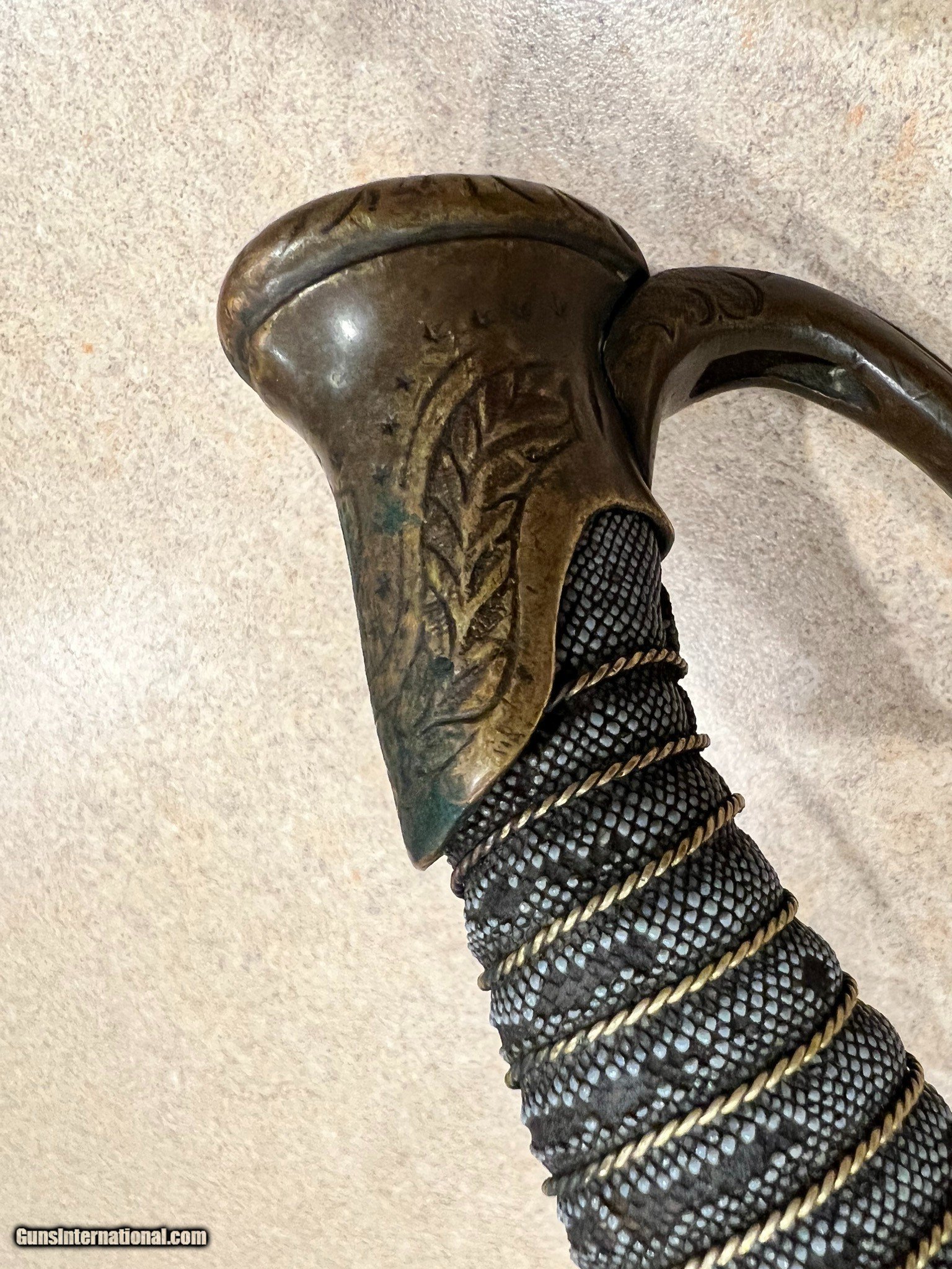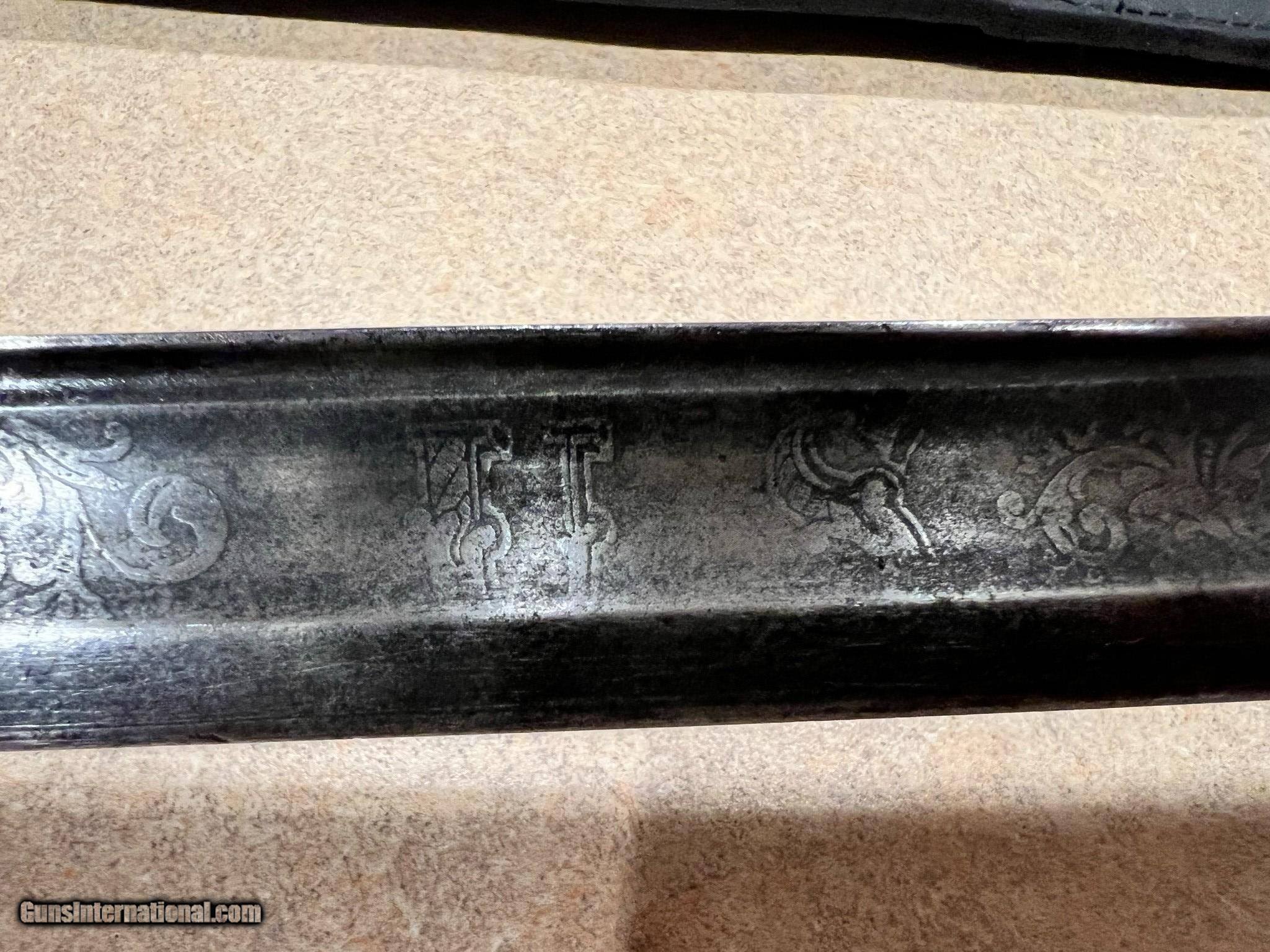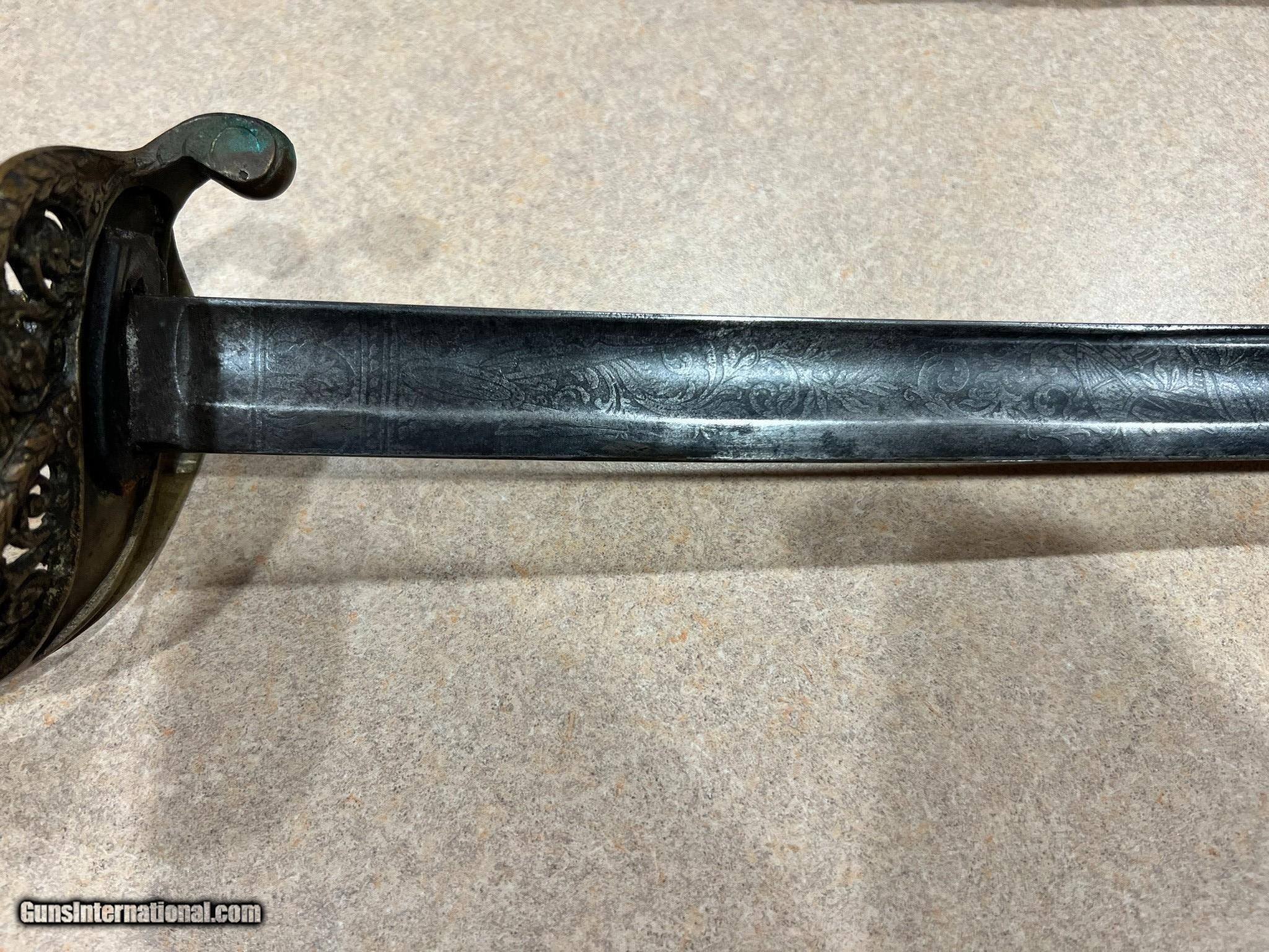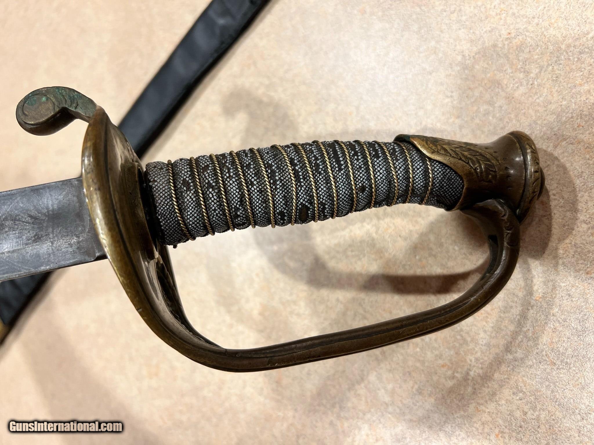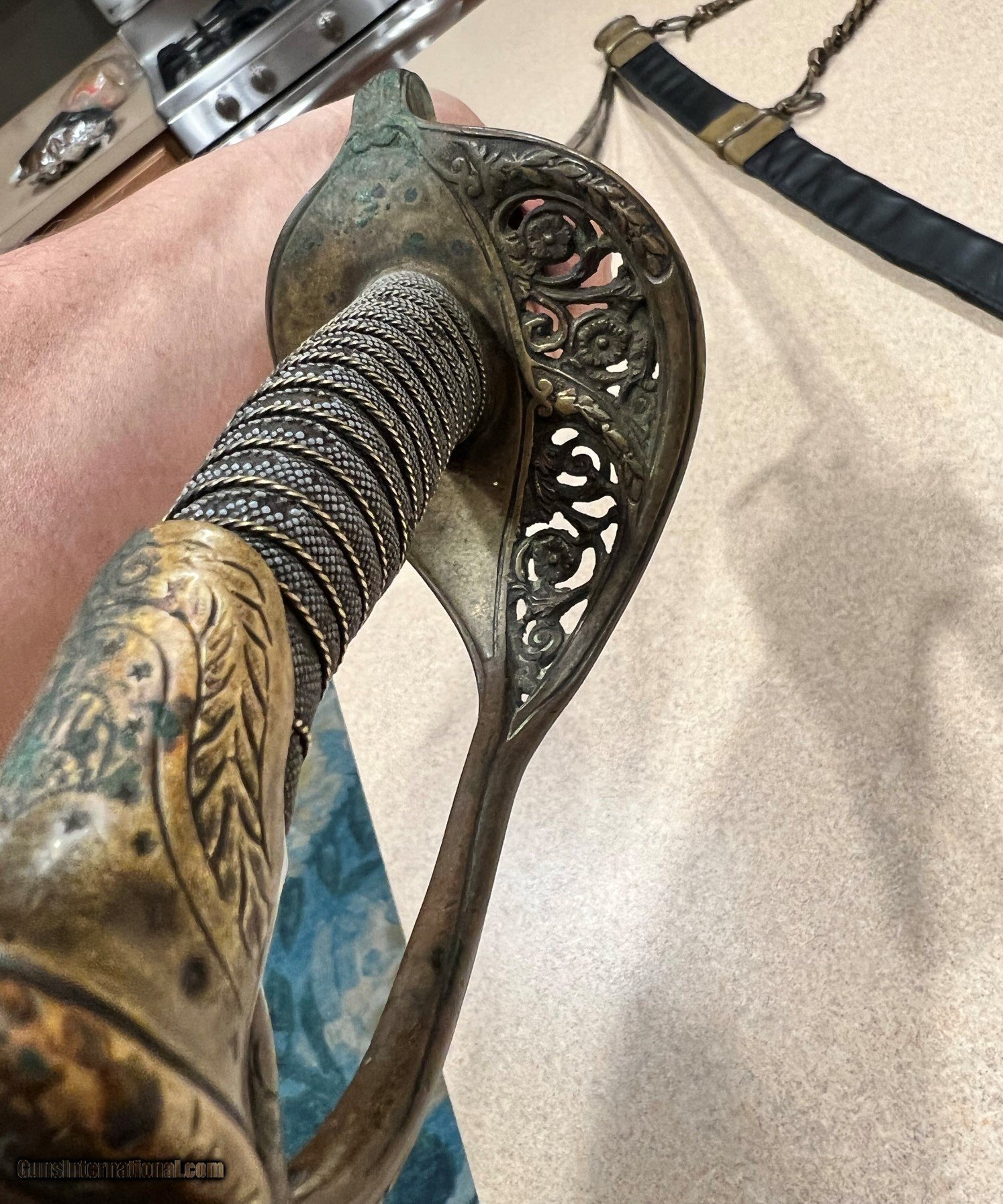 Description: The blade is very crisp and bright with generous original frosting and many patriotic US motifs. The original grip and wire remains intact. A truly fine example of the type of sword carried by line infantry officers up to the rank of Major. The scabbard appears to be redone with modern leather but using the original bands. The chain seems to be original and in great condition. Very beautiful and a must add to a collection. Thanks for looking Larry 248-765-0075 Call or text with any questions Selling this piece cheaper than everyone else for a fast sale 3 day inspection period no FFL required SOLD |