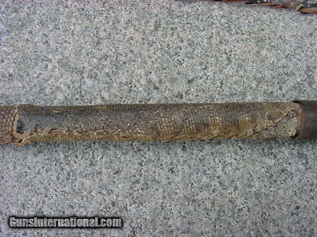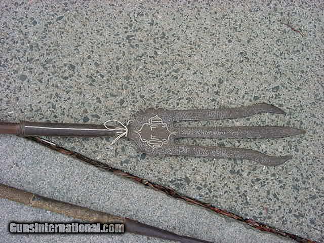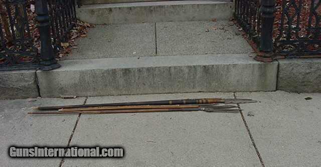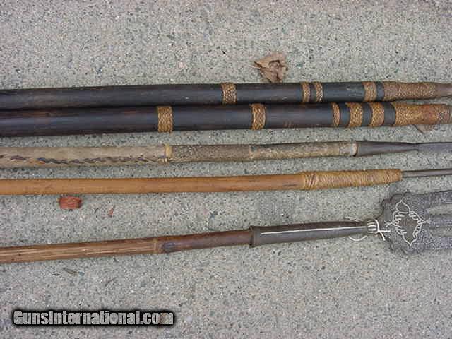 Description: Collection 5 Antique 19th Century African spears and one trident. This is part of a large collection of antique African weapons, masks, etc. that I bought from a guy who was working in South Africa during the 1950s and 1960s. These are authentic antiques. The collection comprises two long spears, one 71 inches long, the other 69 inches long, with spear tips 12-1/2 and 12 inches, respectively. Both of these are alike, having dark wood shafts with tightly wrapped basket weave type at the junction of the head and also in bands at intervals down the shaft (6 bands). There is also a fancy trident 65 inches long with a three barbed fancy engraved head 18-3/4 inches long. This is made of lighter wood and has no bands. There are two shorter spears, one has a very old 4 sided head held with an old nail. It is 49 inches long with a tip 12 inches long (including harft). It is wrapped in snakeskin for the first 9-1/4 inches, then hide wrapped with a sewn seam 15 inches, then snake skin again near the rear for 9-1/4 inches. All four of these had a likely iron tail finial which are all now missing, leaving unfinished and not very worn wood which had been covered with the finials. The 5th spear is 52-1/4 inches long. The head is spear point with very slight raised center on a long iron shaft, the whole being 11-2/3 inches. Where the head meets the light tan wood shaft it is wrapped with basket weave type material for 5-1/2 inches. The butt curves outward so that it is of wider diameter than the main shaft. Very nice set. Don’t want to separate. Obviously this will take an oversize box or boxes to ship. I have shipped qantique rifles and muskets this long through the post office, so assume can ship these too. Will pack very carefully. Likely will take two boxes. $65 Shipping & Insurance. (If my estimate is over by more than a buck of so, I will refund the excess.) I take paypal, bank check or money orders. SOLD |