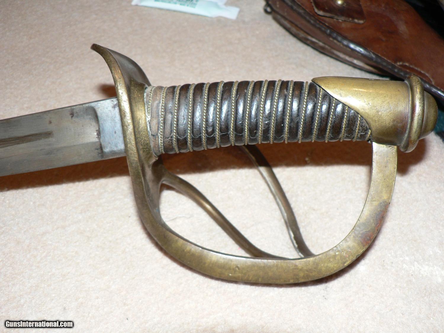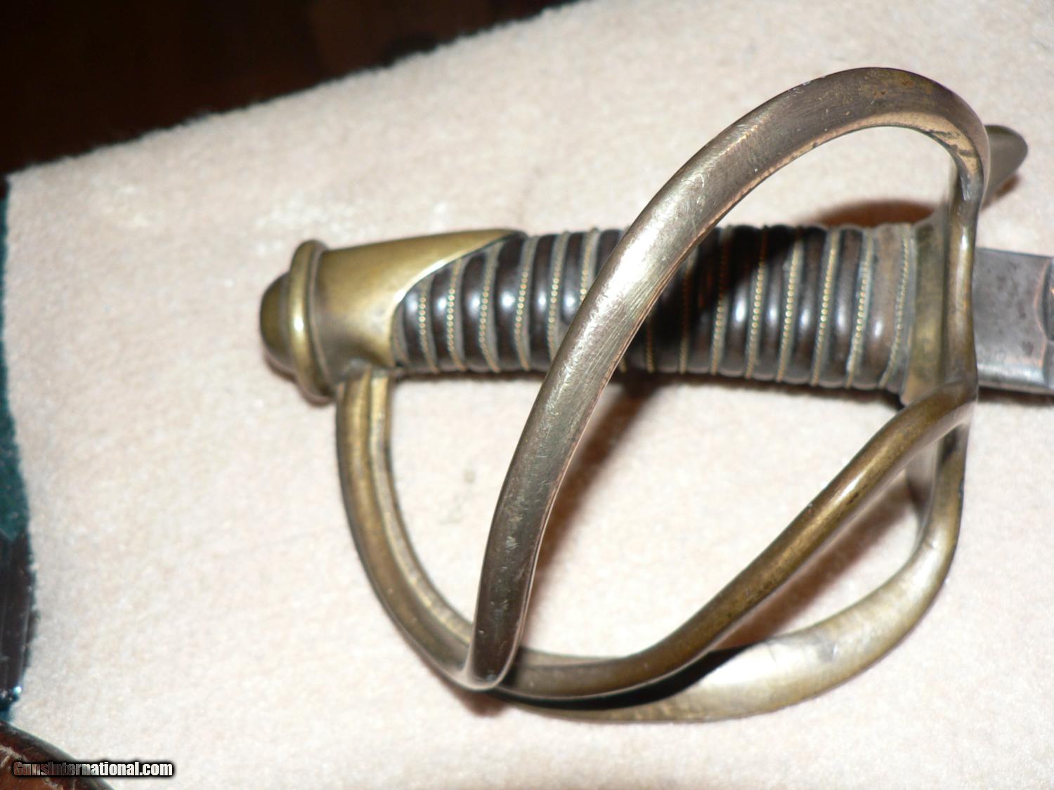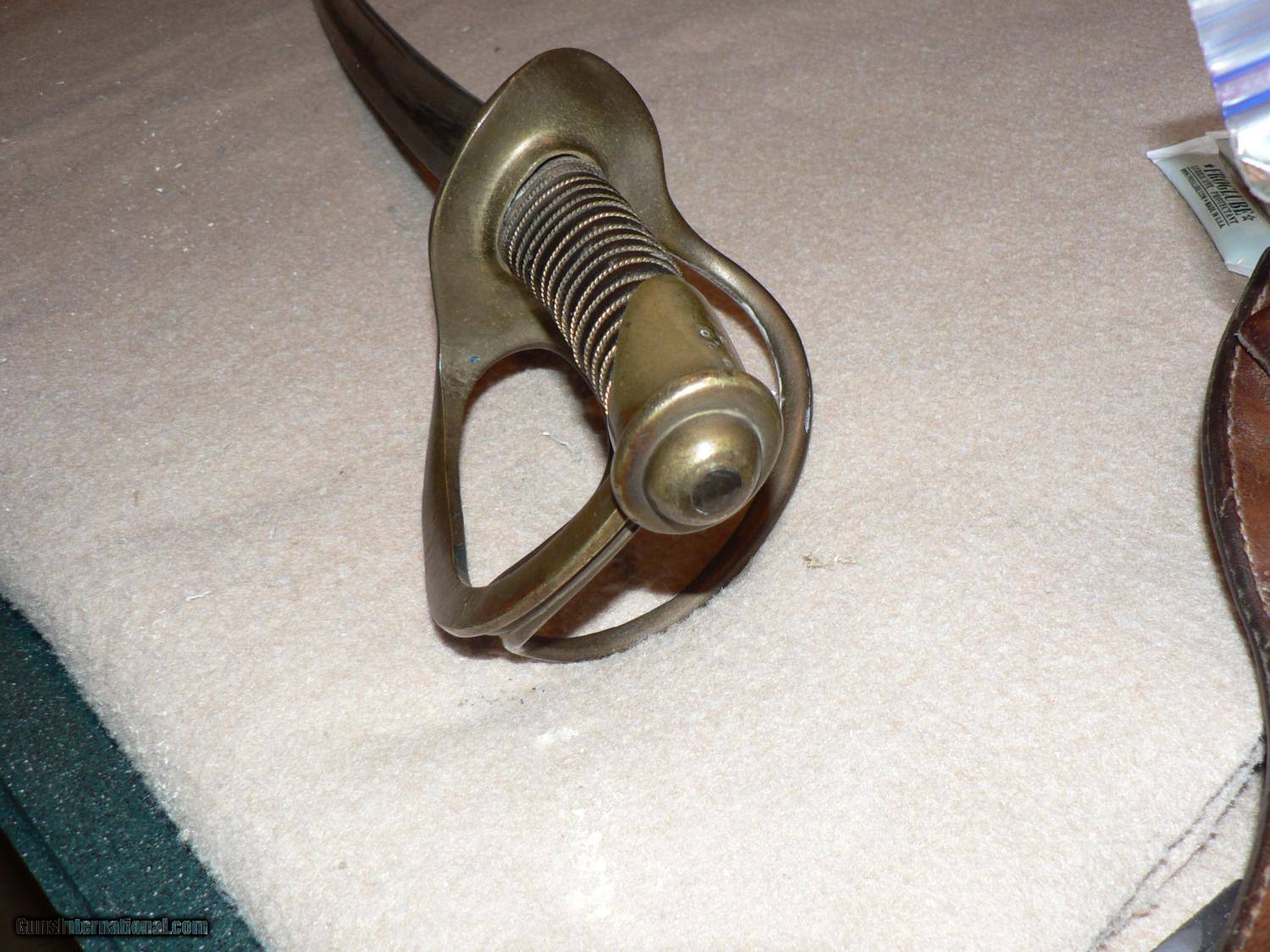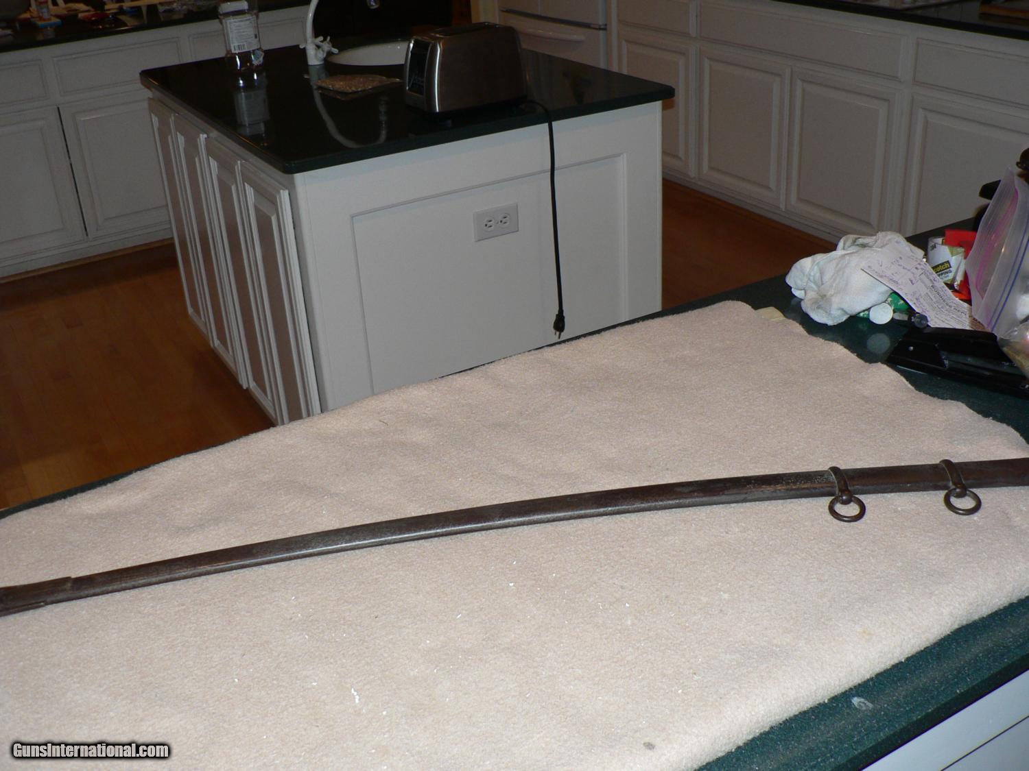 Description: Civil War Calvary Saber-lack of markings-demensions-design and engraved numbers all point to Confederate made sword-1860-64-probably by Haiman Bros. Very good condition for its age, complete with scabbard. Wire and leather intact and in good condition. Price is based on overall condition-rarity and comparable listings. $2,500. Have other swords and many other weapons for sale. Click on other ads by same seller Collector W Will ship for shipping/handling. Some trades acepted. Selling my entire collection of firearms and weapons. Over 50+ years of collecting. SOLD |