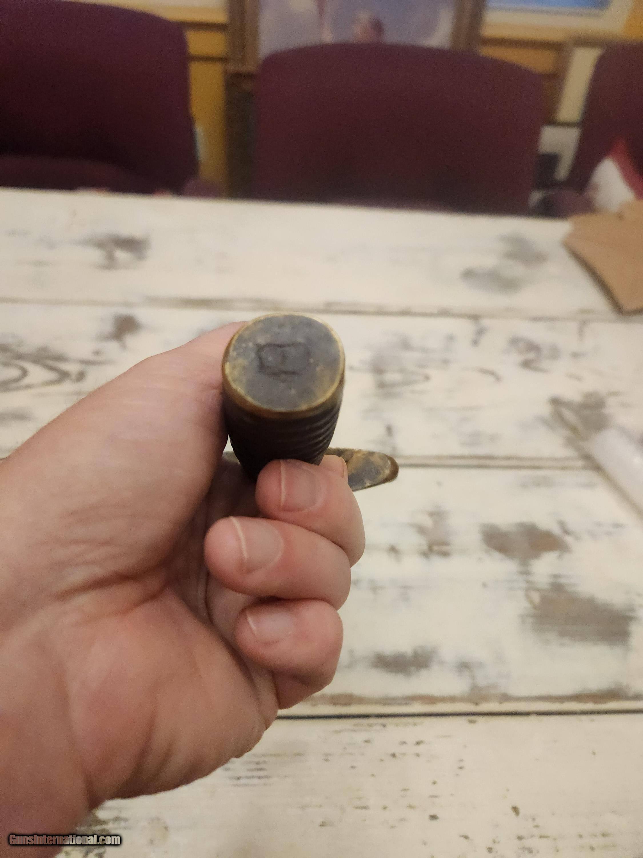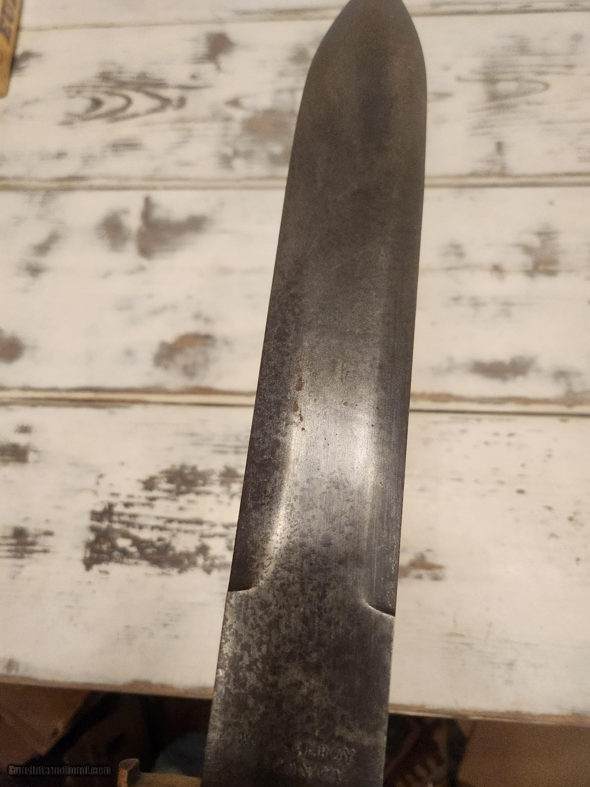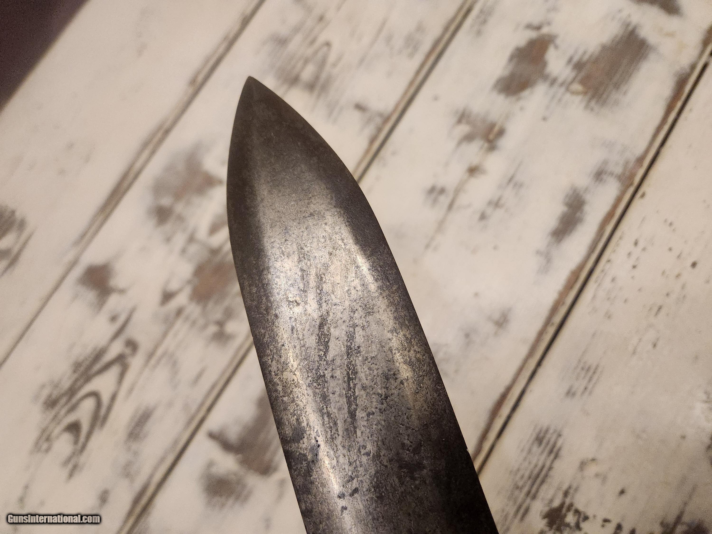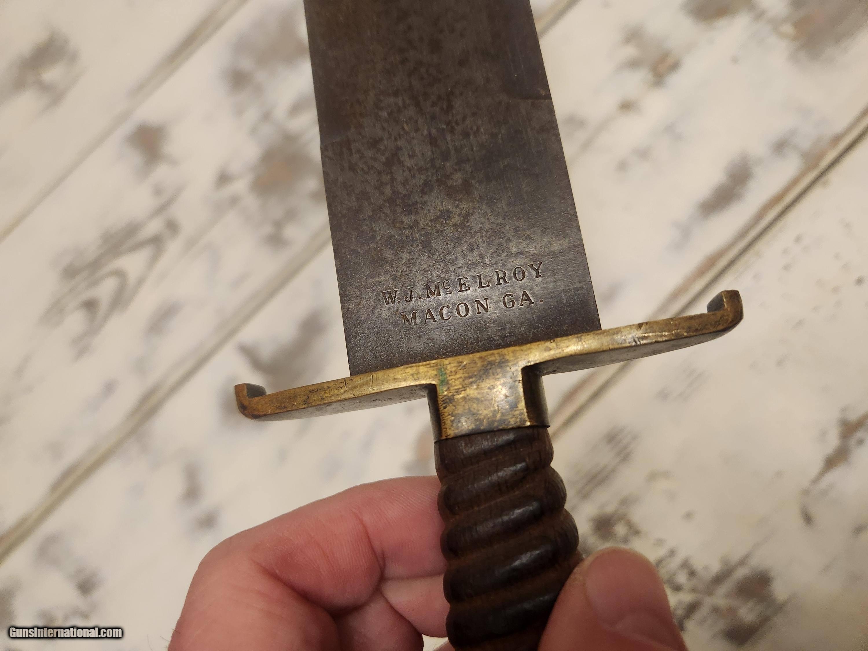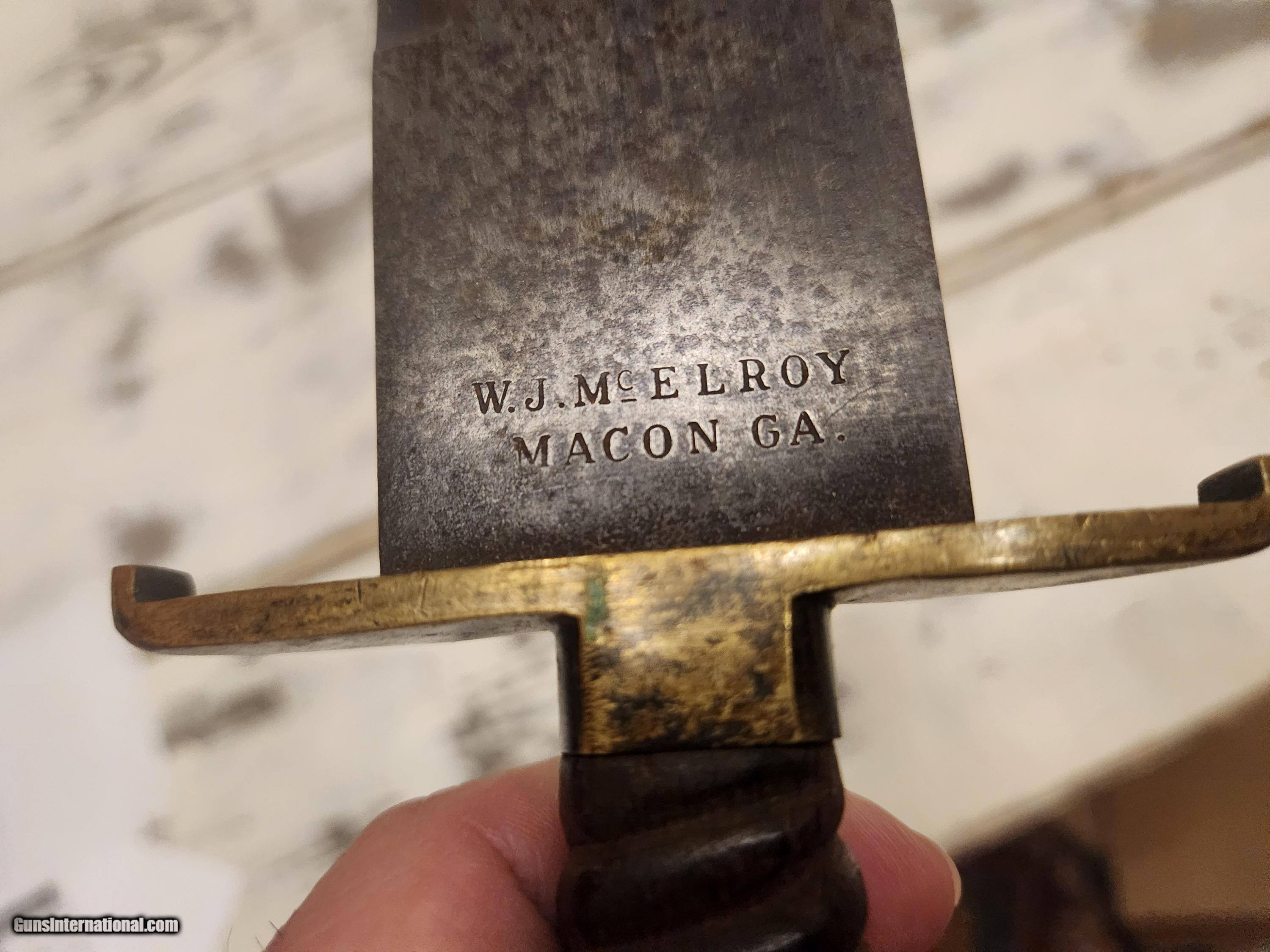Description: CONFEDERATE DOUBLE EDGED BOWIE KNIFE MARKED W.J. McELROY MACON, GA. 12 3/8 inch spear point blade marked W.J. McELROY MACON, GA. in two lines on the ricasso. Bronze crossguard, the quillions terminating in flat discs. Walnut grip spirely serrated with a bronze cap on top. DeBow's review of March-April, 1862, reflects that McElroy's firm made all types of swords, and according to this source his output was 20 Infantry swords, bowie knives, naval cutlasses, sergeant's swords, sword belts, straps for same, belt clasps and mountings for same per week. Also about 50 brass cavalry spurs per week. Also made tin canteens and bayonets. McElroy also made Frame belt buckles. SOLD |