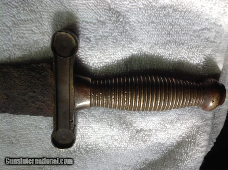Description: Reduced to below cost!!!!! McElroy Confederate Relic Short Sword. Classic pattern of a Confederate short artillery sword. Confederate arsenal produced short sword patterned after the U.S. Government made model 1832 U.S. artillery short sword. There are several differences between the Confederate swords and the Union made swords. The blade on the Confederate sword has no fuller groove and the Federal swords had three on each side. The grip on the Federal made sword had rivets holding the blade in place and the Confederate made sword was peened at the top of the pommel just like this sword. This is a beautiful and classic example of Confederate workmanship. The sword length is 24 inches total. The blade is 18.5 inches. Blade has pitting from ground action. Could be a dug sword or an early battlefield pick up. Do not know for sure. Metal is stable and not rusting. The brass that composes the handle is in wonderful shape and has a fantastic copper color to the metal. The handle on this one reveals where it was made. The handle has tightly spaced grip ridges in the brass. These are the traits of manufacture that are attributed to being manufactured at the famous Macon, Georgia firm of William J. McElroy. This pattern of sword is illustrated on page 9 of the book "Collecting the Confederacy" by Shannon Pritchard. This sword is unmarked but is a McElroy product and is 100% Confederate in manufacture. Excellent relic Confederate Sword at an affordable price. Comes with a letter of authenticity from the famous Shiloh Relics where I purchased the sword from. Source material and letter of authenticity credit to Shiloh Relics. SOLD |