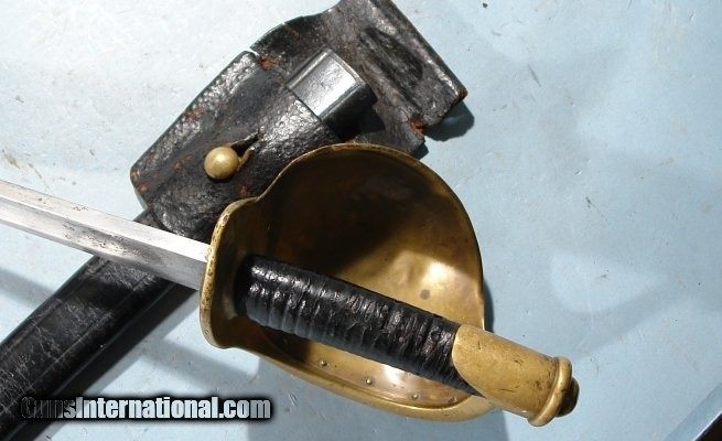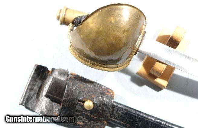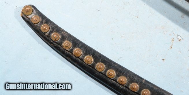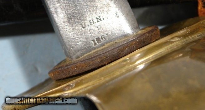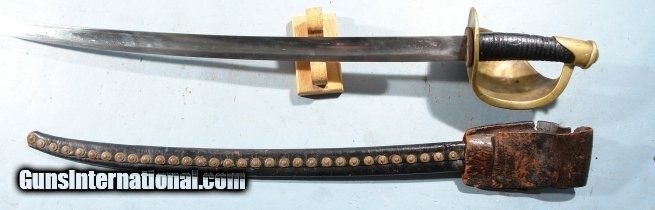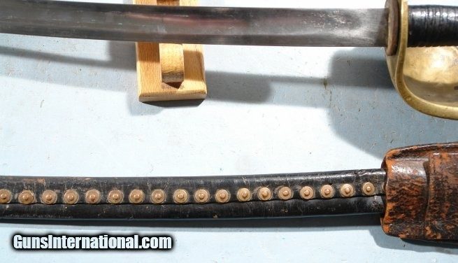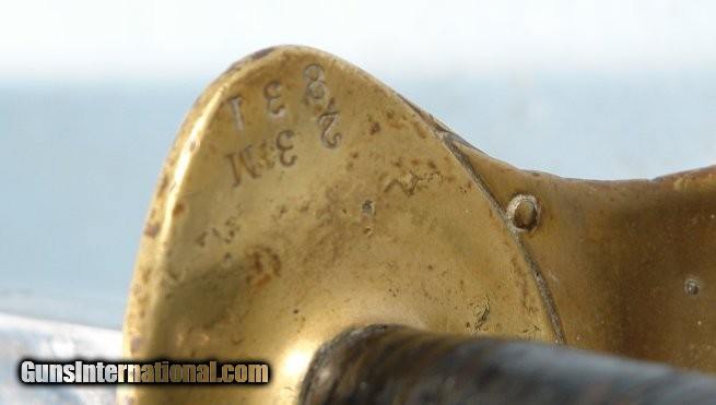 Description: EXCELLENT CIVIL WAR AMES MODEL 1860 U.S. NAVY CUTLASS AND SCABBARD. 32” o/a with 26” blade inspected and dated on the ricasso “U.S.N./D.R./1862”. Ames address on the obverse. Inside forward lip of guard rack number stamped “23M/831”. Excellent overall with fine blade, original grip wrap and good markings. Particularly fine scabbard with the tip still intact and not cracked. Has all the copper rivets. Original leather frog. Best scabbard on one of these we have had. Superior example. SOLD |