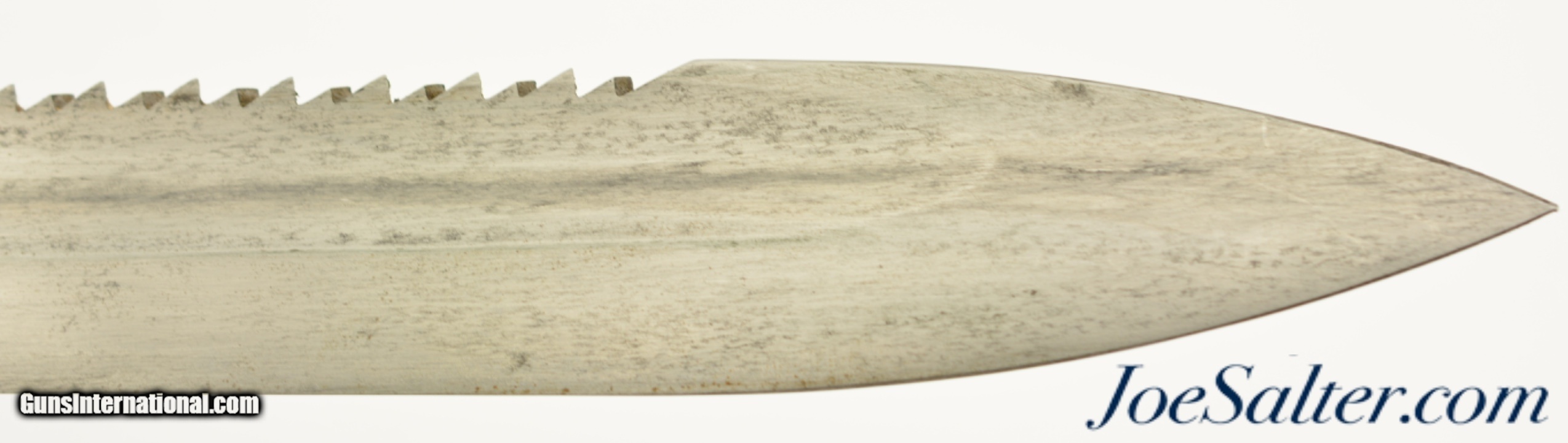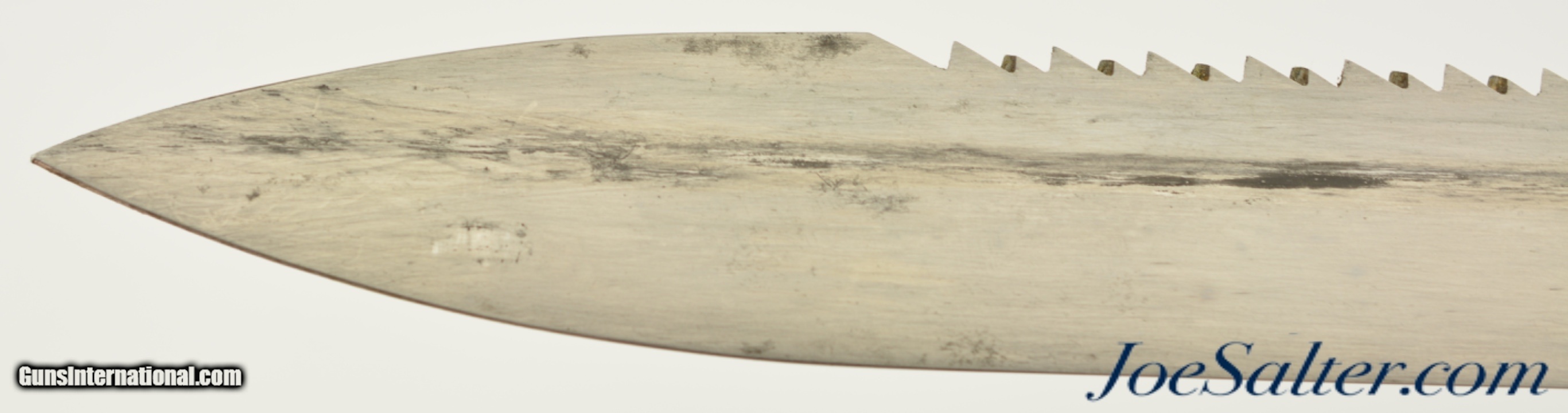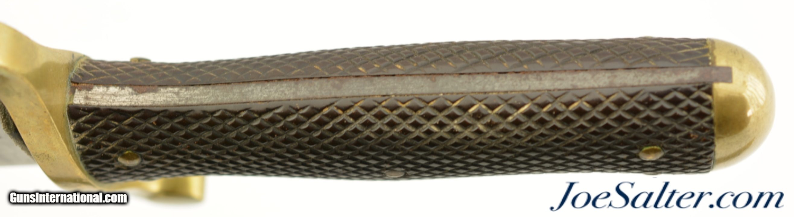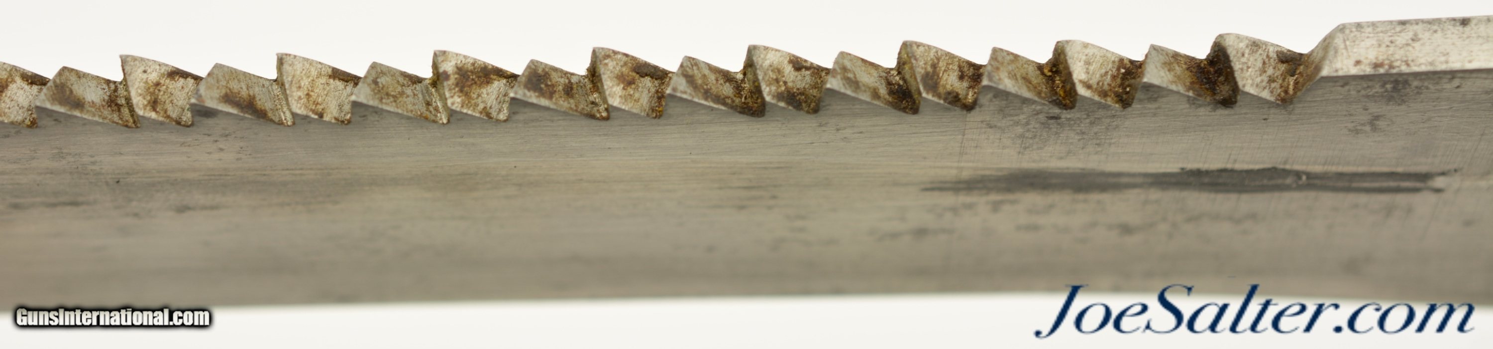 Description: This is a Swiss Model 1878 Pioneer Style Sawtooth short sword with leather scabbard marked "GEBR. WEYERSBERG SOLINGEN" on the Ricasso above a Swiss Cross with "1" over "78" on the reverse. It measures 25 ??" overall with a 19 ??" blade with a sharp sawtooth edge that is in near excellent condition with only very mild carbon staining spots. The leather washer is intact with a brass handle and pommel having a 4" guard marked "S" and the grip scales are held with 5 rivets showing some flattening of the points. It comes in a brass throated and tipped leather scabbard in near excellent condition. A scarce Swiss sword in Excellent condition. SOLD |