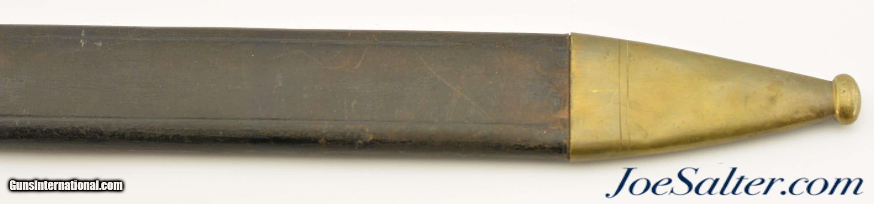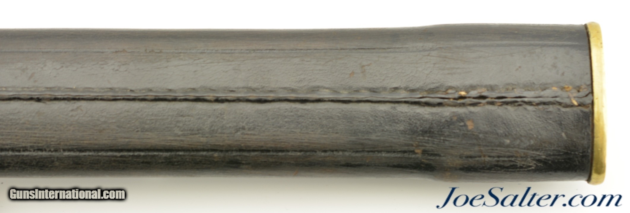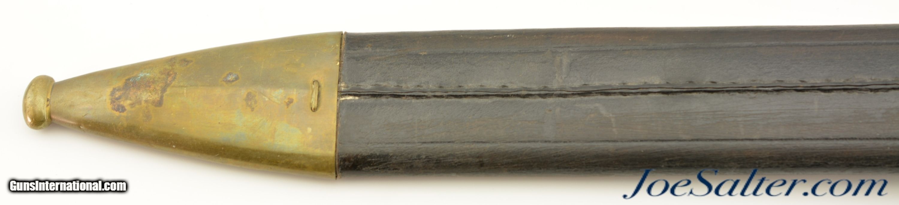 Description: This is a Swiss Model 1878 Pioneer Style Sawtooth short sword with leather scabbard marked "GEBR. WEYERSBERG SOLINGEN" on the Ricasso above a Swiss Cross with "1" over "78" on the reverse. It measures 25 ??" overall with a 19 ??" blade with a sharp sawtooth edge that is in near excellent condition with only very mild carbon staining spots. The leather washer is intact with a brass handle and pommel having a 4" guard marked "S" and the grip scales are held with 5 rivets showing some flattening of the points. It comes in a brass throated and tipped leather scabbard in near excellent condition. A scarce Swiss sword in Excellent condition. SOLD |