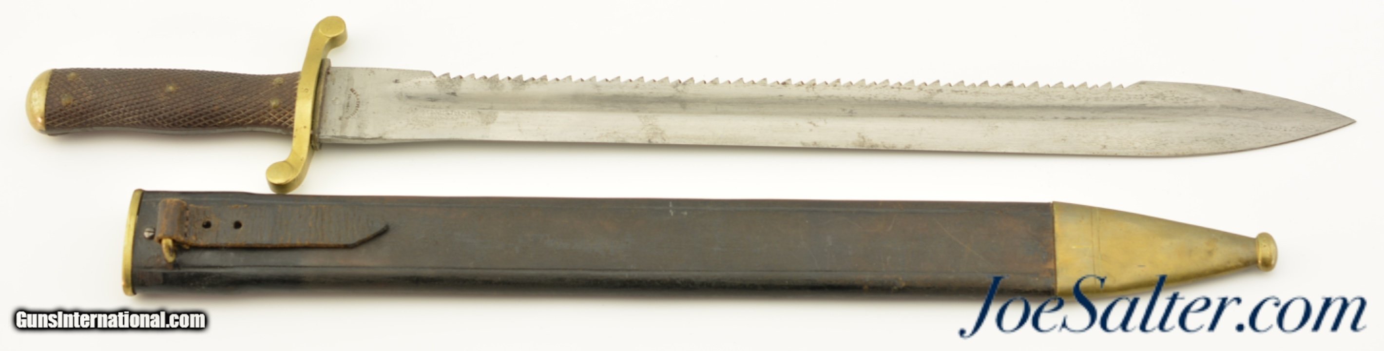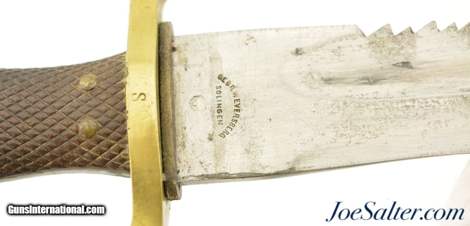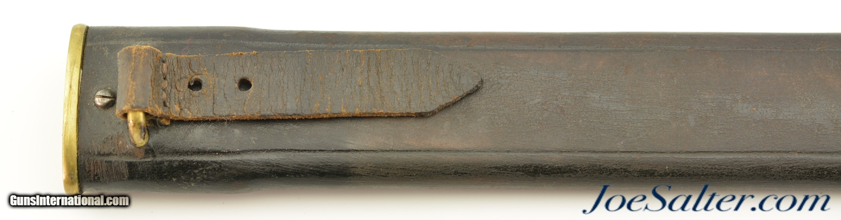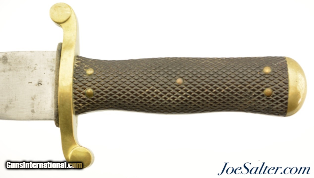 Description: This is a Swiss Model 1878 Pioneer Style Sawtooth short sword with leather scabbard marked "GEBR. WEYERSBERG SOLINGEN" on the Ricasso above a Swiss Cross with "1" over "78" on the reverse. It measures 25 ??" overall with a 19 ??" blade with a sharp sawtooth edge that is in near excellent condition with only very mild carbon staining spots. The leather washer is intact with a brass handle and pommel having a 4" guard marked "S" and the grip scales are held with 5 rivets showing some flattening of the points. It comes in a brass throated and tipped leather scabbard in near excellent condition. A scarce Swiss sword in Excellent condition. SOLD |
