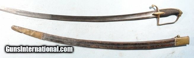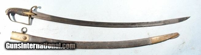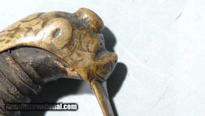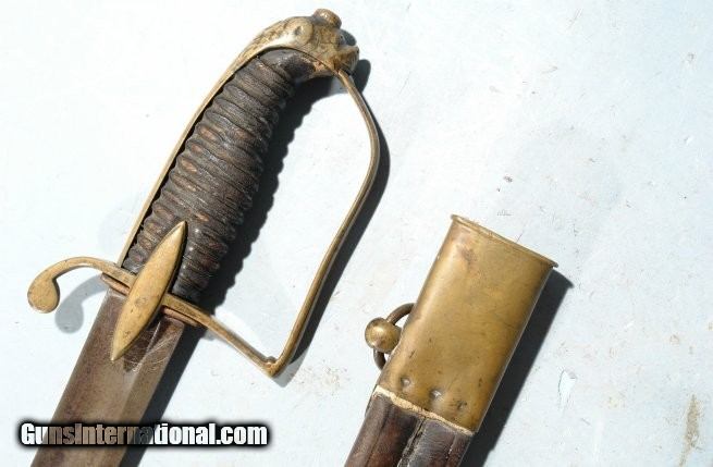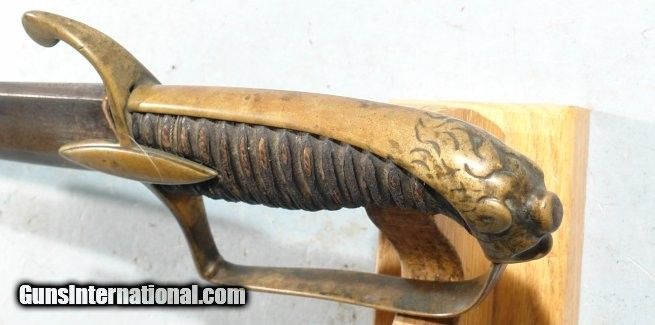 Description: GERMAN LION HEAD CAVALRY OFFICER’S SABER AND SCABBARD CIRCA LATE 1700’S. 37” overall with 31” blade maker signed on the ricasso “G. C. KELLER” and on the obverse “A SOLINGEN”. Single fuller blade with light engraving. Lion Head pommel of the form in use in England and America during the mid to late 1700’s and on into the early 1800’s. Very good overall with original leather grip wrap and wire. Old U.S. Naval button used to replace the frog stud. Even has the original leather blade washer. Nice original condition. SOLD |