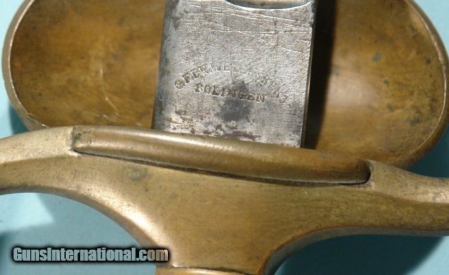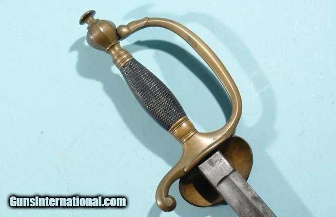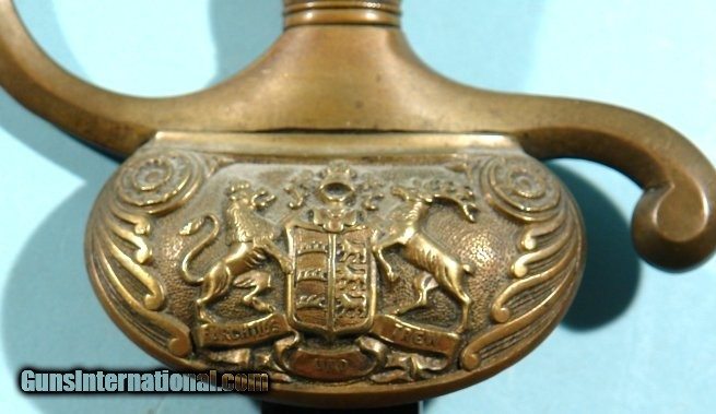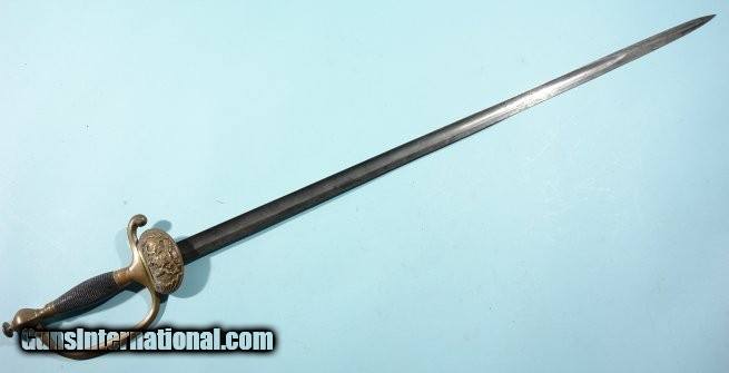 Description: GERMAN WURTTEMBERG CIVIL SERVICE SWORD BY WEYERSBERG / SOLINGEN CA. 1860’S. 37” o/a with 30” blade with maker’s stamp on riccasso. Brass hilt with ebony checkered grip. Brass guard with Wurttemberg crest. Fine quality and condition and very handsome. Franco-Prussian War era. SOLD |
