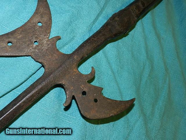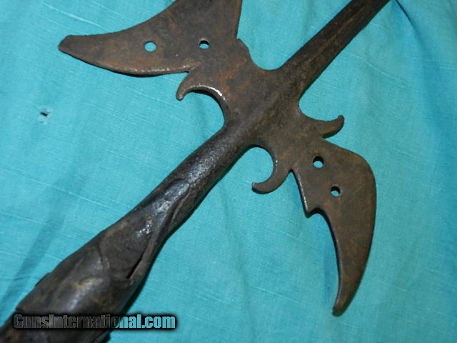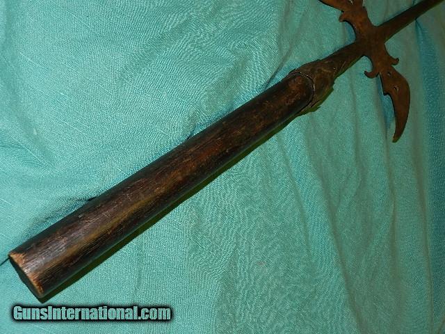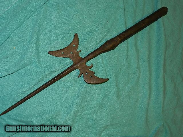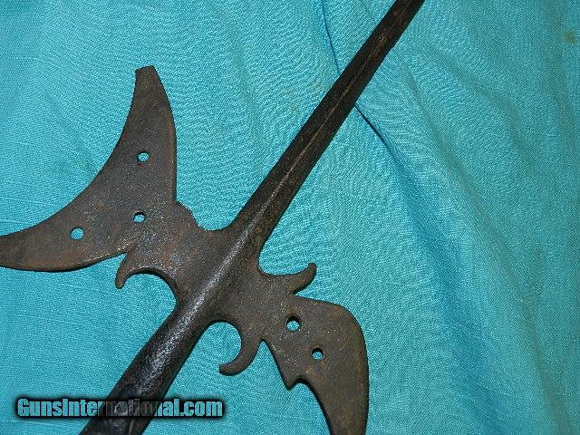 Description: An original hand forged New England Halberd. This came from an old Yankee estate, and is 100% original. the overall length is about 29", and the neck is held to a section of an aged pole with hand hammered studs. The remaining pole section is aged oak. This weapon had multiple use on the battle field. They were used up to the war of 1812. These are usually found way over priced and this original is reasonably priced. The age is three to four hundred years old. We don’t have asite .I prefer money orders or a check. Item ships when funds come in. If you can only pay with a card let me know. I hope you like my wide selection of unusual guns, knives and gun parts. Shipping price determined by zip code. I try to keep the prices affordable, which means I make less money than most dealers. You won’t get altitude sickness with my prices! I consistently have the best selection of older guns If you BUY IT NOW you must still contact us for details buy it now doesn't end the sale, it just sends an email telling us you want to buy this gun. A phone call won’t secure a sale! Not home many times, the first buyer by email buys the gun !Thissite doesnot close down a sale when you do a BUY IT NOW like Ebay!I can get six buy it nows in an hour, first buyer to email gets the guns, others are in second place! Best to send another email . Sometimes not home to get calls. Some guns are required shipment to a gun dealer near you for a transfer to you when it arrives. With the widest selection of older guns at great prices, We don’t have a store, and sell on the internet only. SOLD |