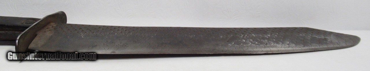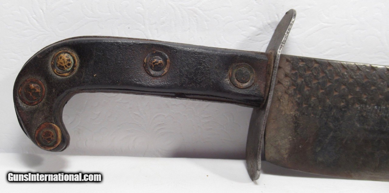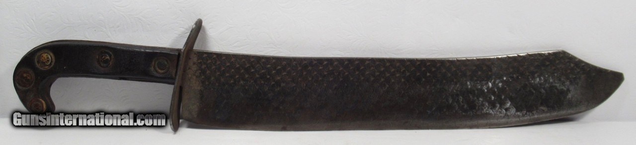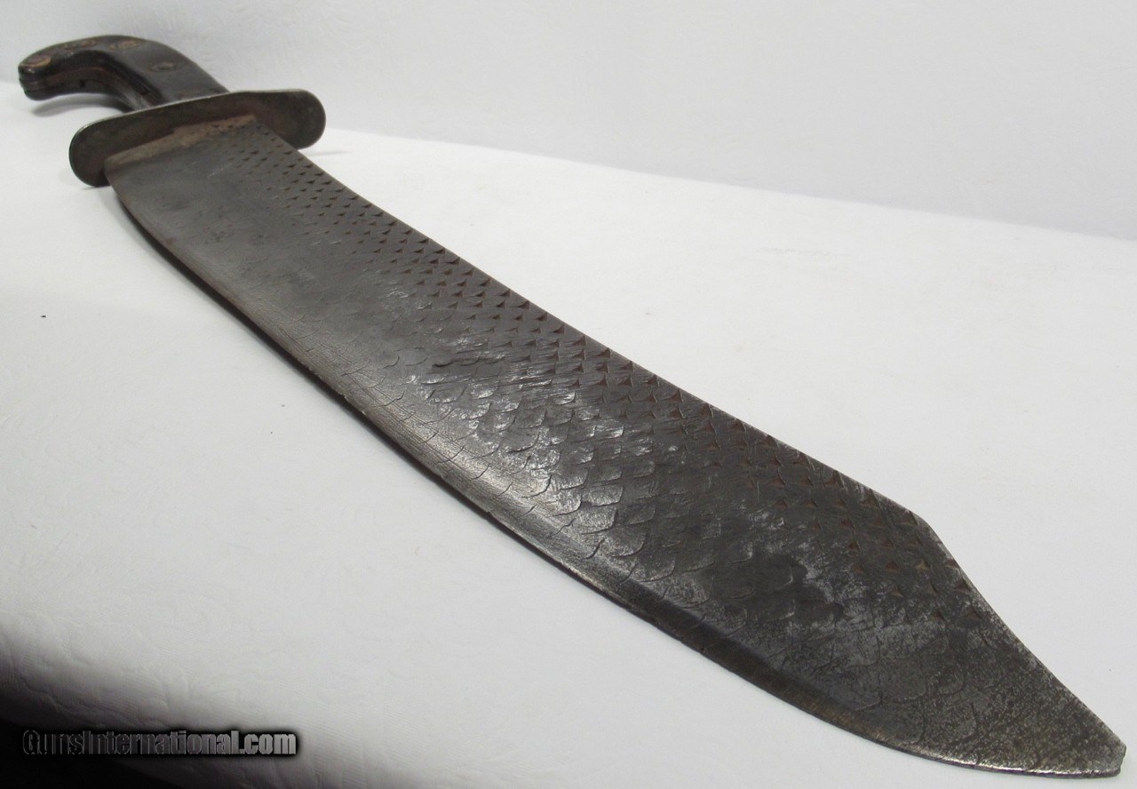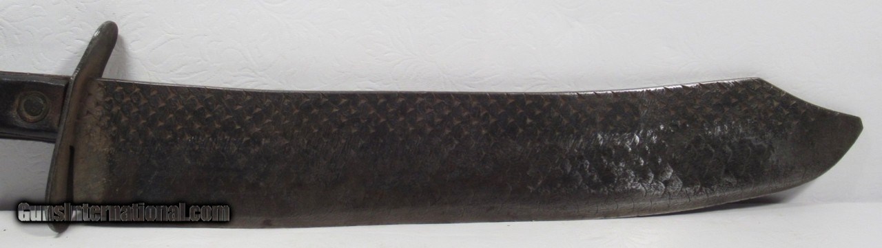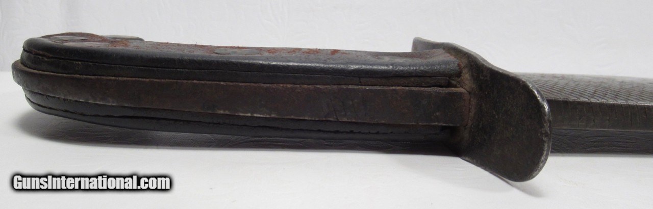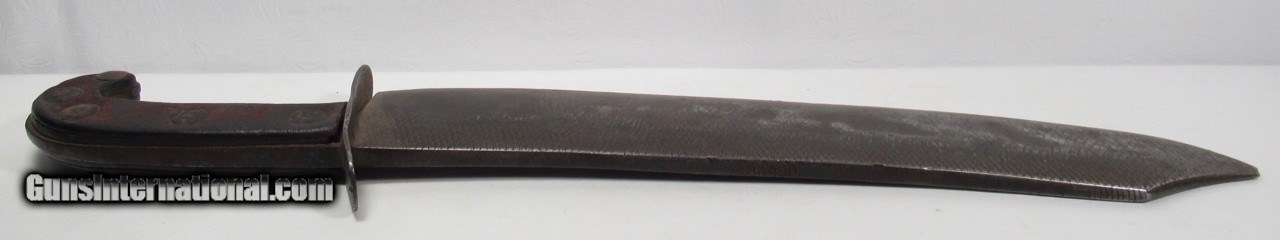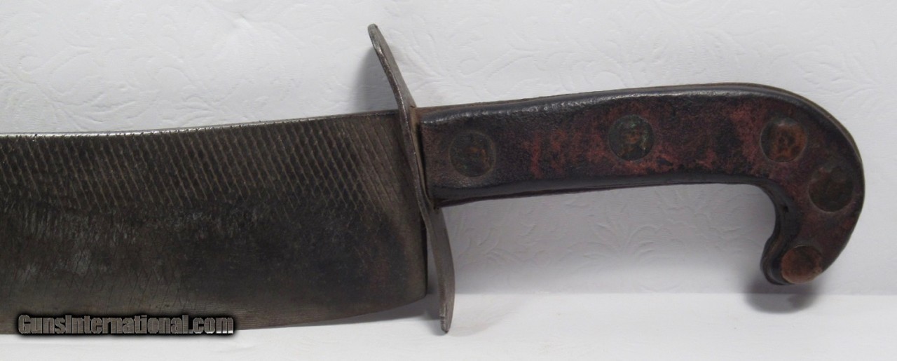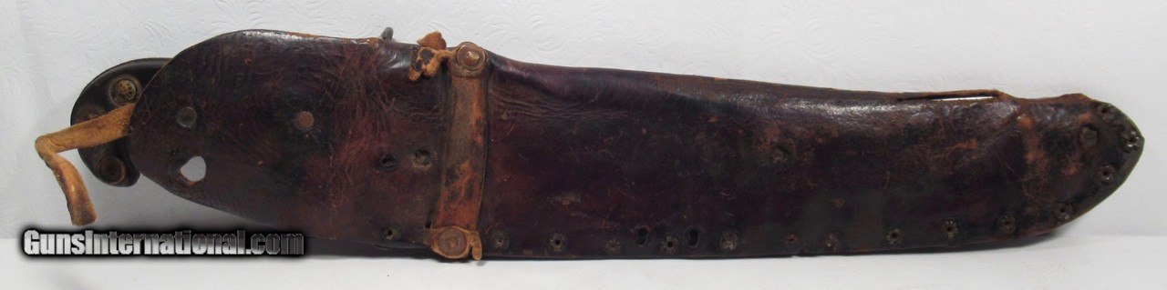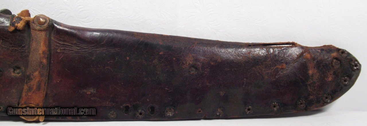Description: Huge Antique Confederate Side Knife out of Tennessee; 14” Clip Point Blade Made Out of a Very Thick File; 18 7/8” L.O.A.; Weighs Over 2 lbs. without the Original Sheath; Blade Full ¼” Thick; Leather Scales Attached by Copper Brads; Original Sheath with Metal Liner on edge side; Scratched on sheath, “1862 Tennessee”, also a Confederate Battle Flag, and “Scank”; Noted Blade Authority says Knife and Sheath are 100% Correct; Killer Confederate Knife; No Text, Call or Email Only; PERSONAL PROPERTY of Harold Wieser; Price: $4,500 + $30 S&H; Price includes insured shipping; return policy: three days inspection from the date the item is received; full refund of shipping both ways ONLY IF THE ITEM IS MISREPRESENTED. SOLD |