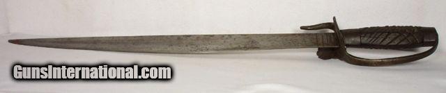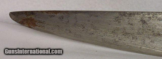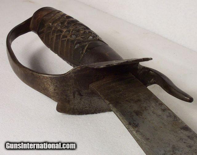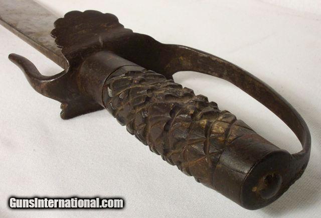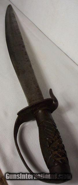 Description: Huge D Guard knife with approximately 18” heavy blade with original sheath; could be Confederate Bowie, Mexican, or Spanish Colonial; flecks of gold paint on handle leads me to believe it is Mexican or Southwest origins, as I have seen traces of gold paint on Mexican gun stocks; antique;All items shipped fully insured- Knives, Swords & Sabers $30; (Texas residents please add 6.75% sales tax); return policy: three days inspection from the date the item is received; full refund of shipping both ways ONLY IF THE ITEM IS MISREPRESENTED. Note: No International sales under any circumstances. SOLD |