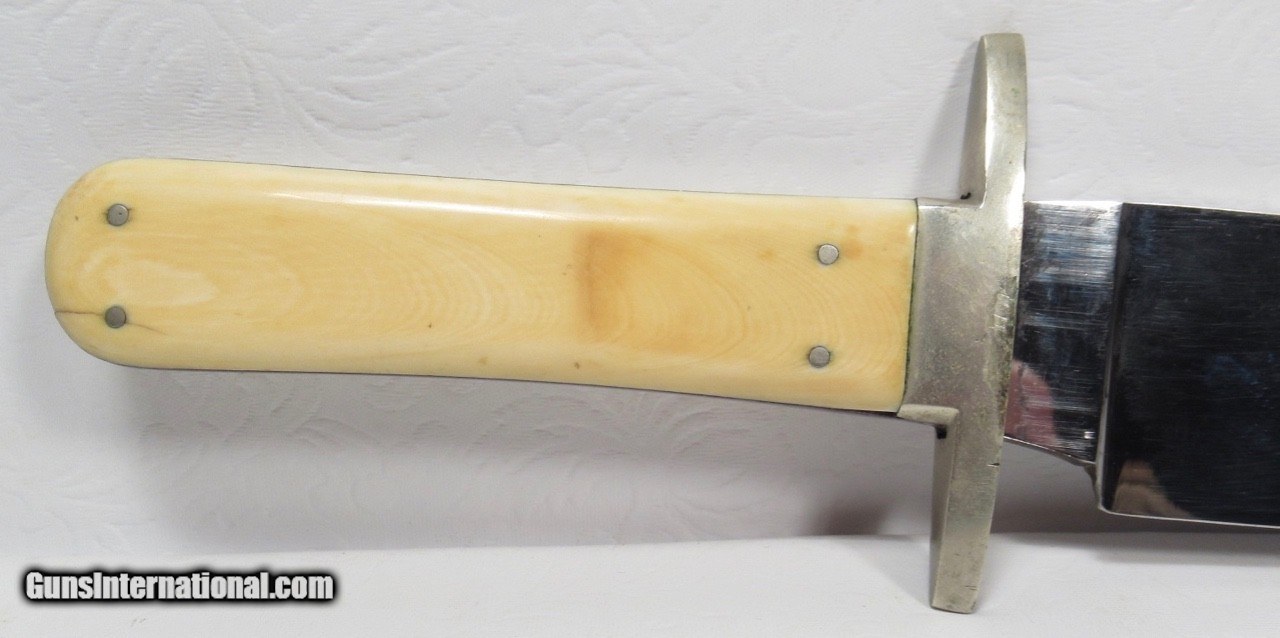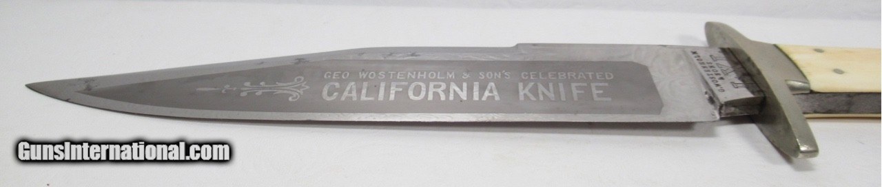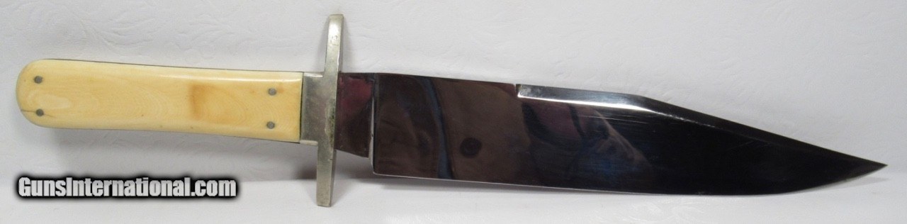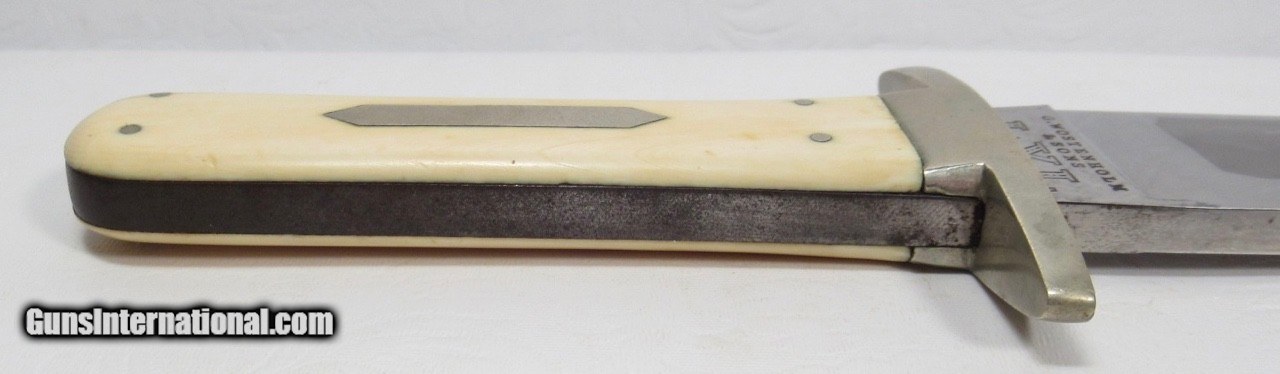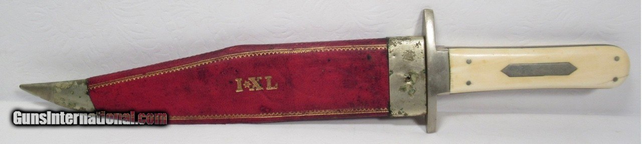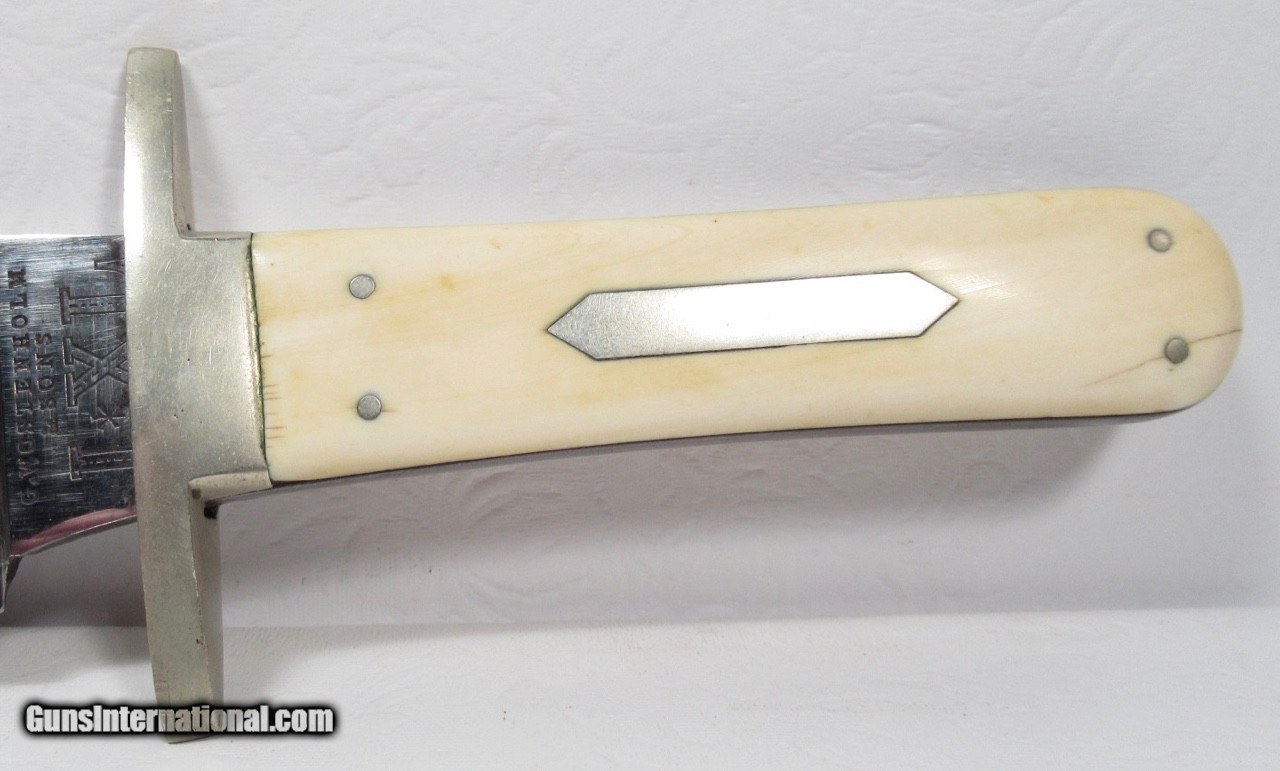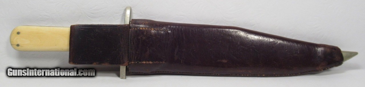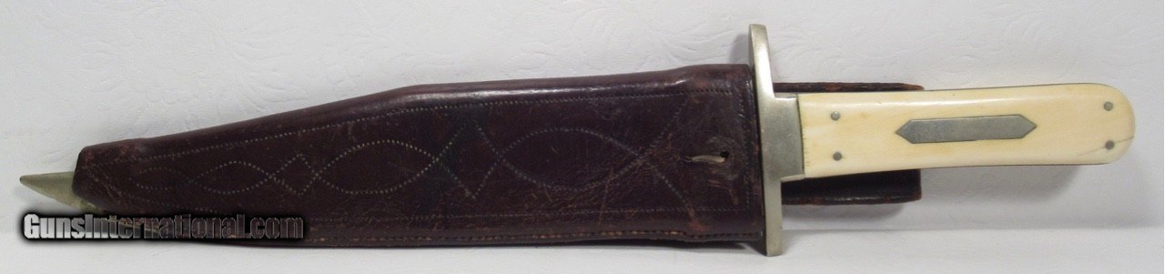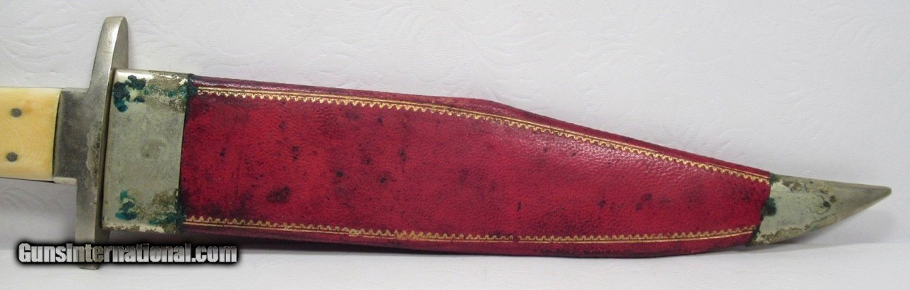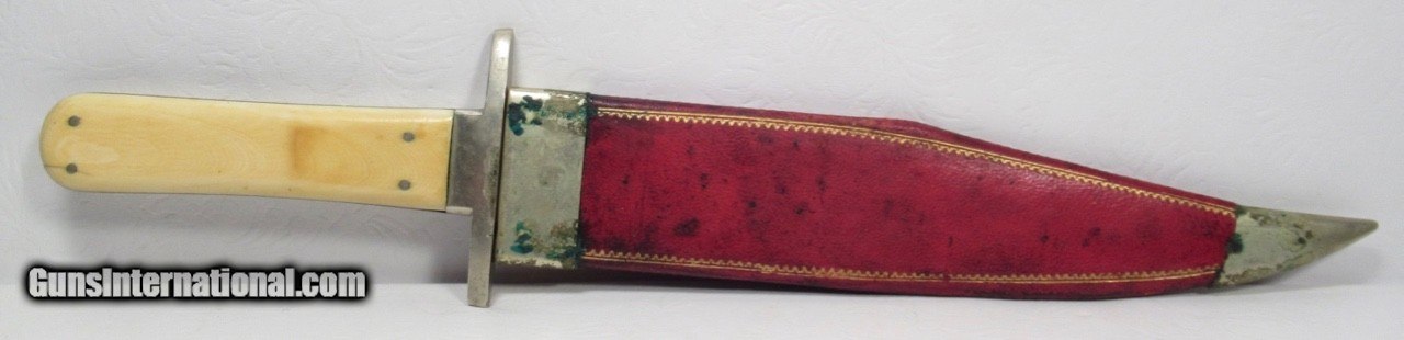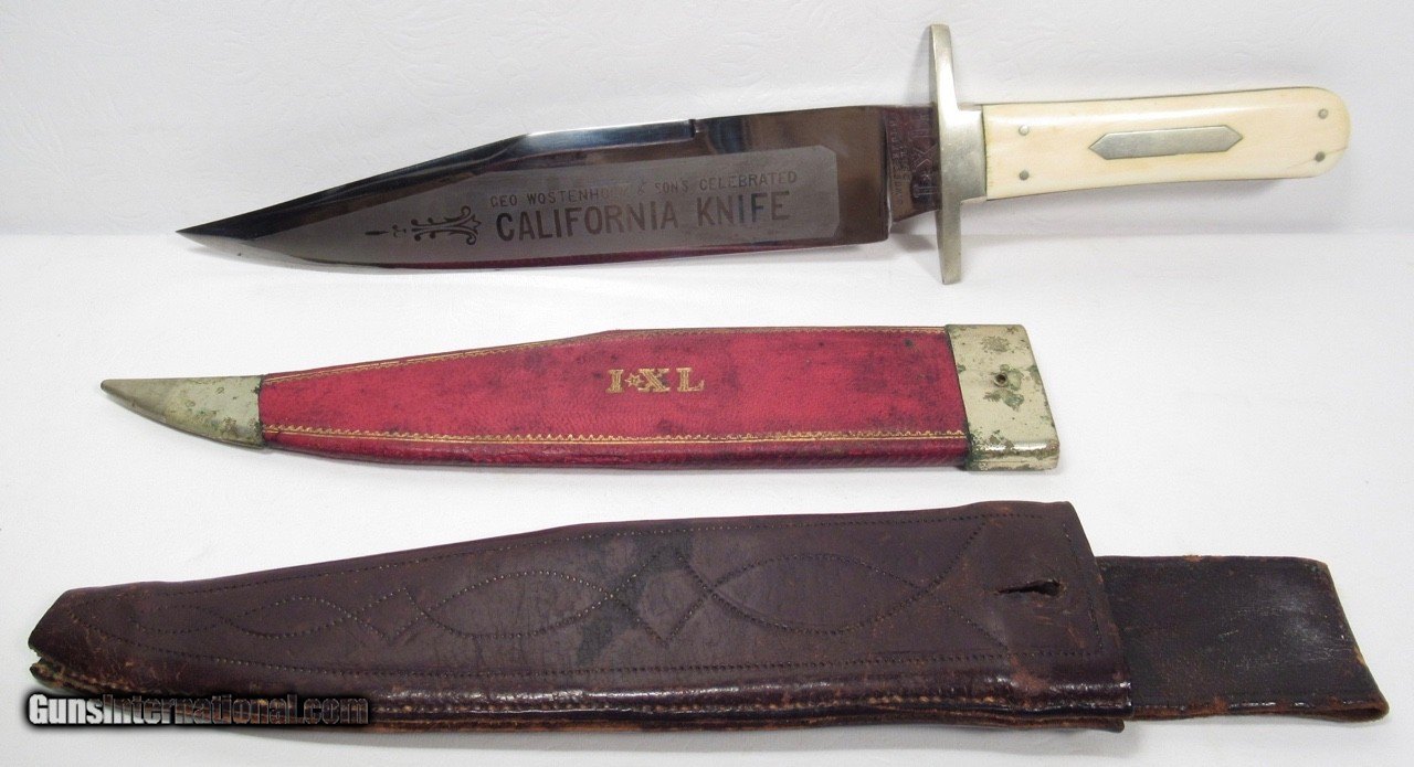 Description: One of the Very Best California Gold Rush Era Bowie Knives made by G. Wostenholm & Sons I*XL Etched; 8” Clip Point Blade; LOA 12 ¼”; 1/4” Thick; Ivory Slab Grips; Blade has small areas of staining from sheath but is otherwise in Fine Bright Condition; Appears Unused; Original Sheath & Outer Sheath; Sold in 2012 Brian Lebel Old West ; Provenance Floyd Ritter & Mike Heskett Collections; No License Required for Shipping; Price includes insured shipping; Attention Texas Buyers: We Must Collect 6.75% Sales Tax; SOLD |