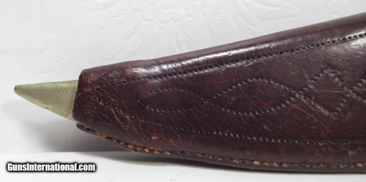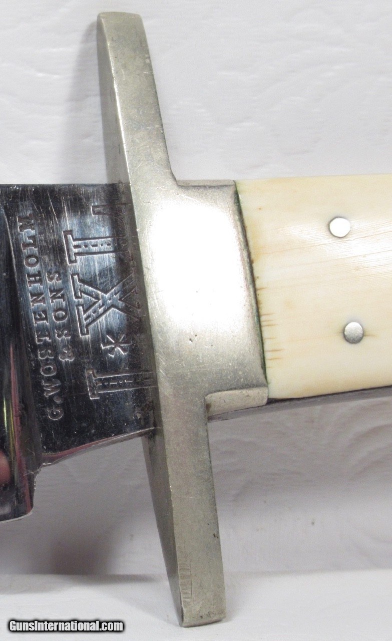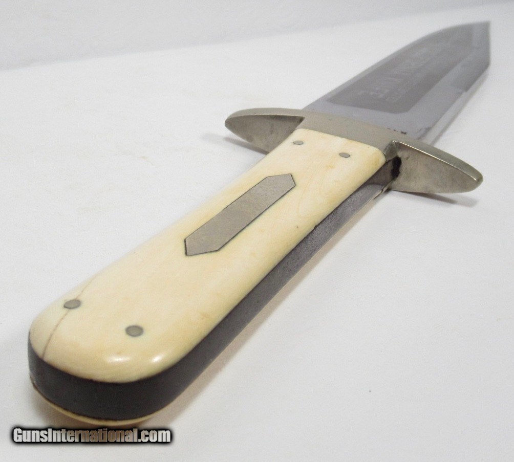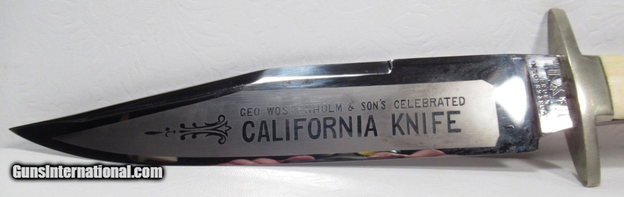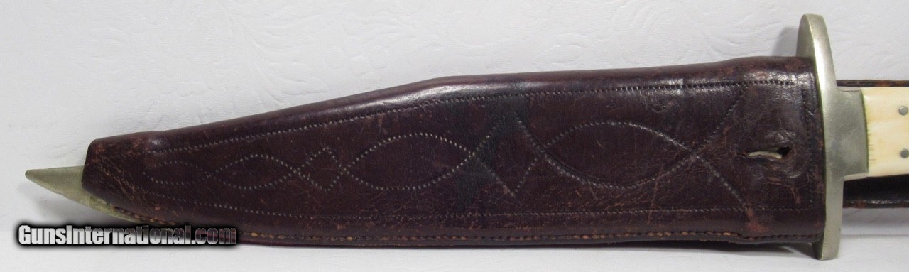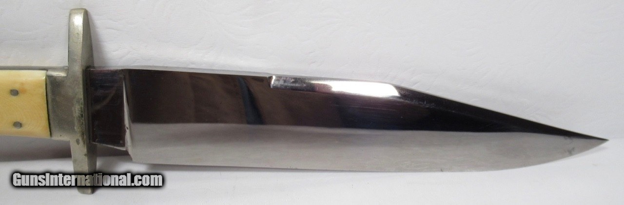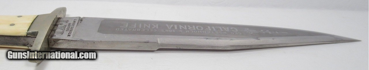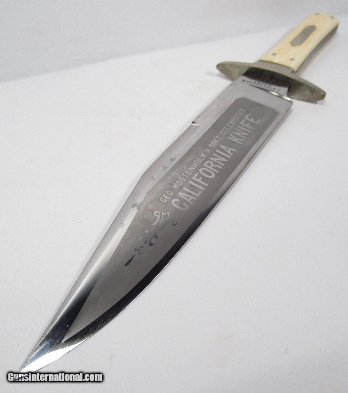 Description: One of the Very Best California Gold Rush Era Bowie Knives made by G. Wostenholm & Sons I*XL Etched; 8” Clip Point Blade; LOA 12 ¼”; 1/4” Thick; Ivory Slab Grips; Blade has small areas of staining from sheath but is otherwise in Fine Bright Condition; Appears Unused; Original Sheath & Outer Sheath; Sold in 2012 Brian Lebel Old West ; Provenance Floyd Ritter & Mike Heskett Collections; No License Required for Shipping; Price includes insured shipping; Attention Texas Buyers: We Must Collect 6.75% Sales Tax; SOLD |