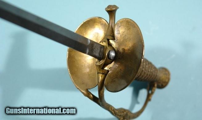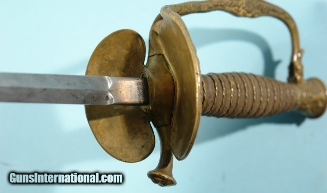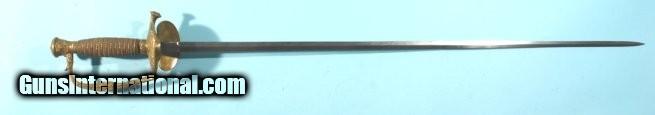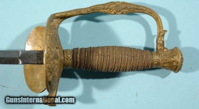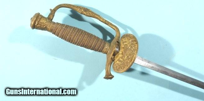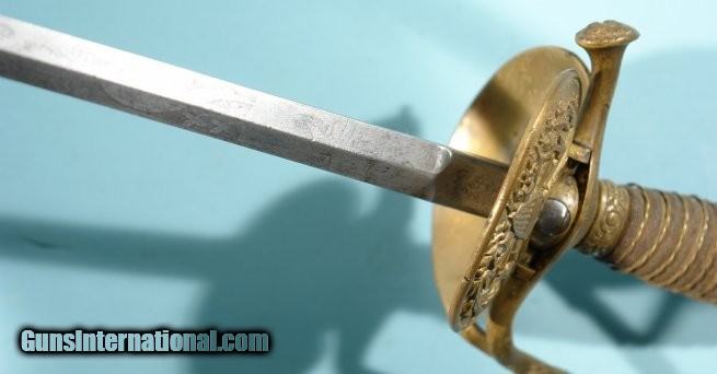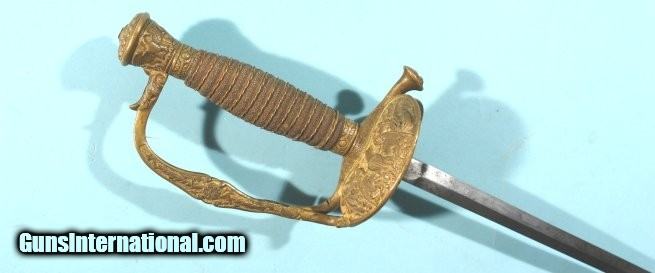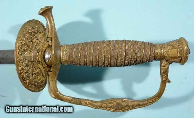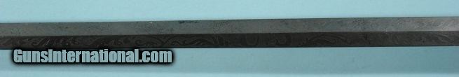 Description: INDIAN WARS U.S. MODEL 1860 STAFF & FIELD OFFICER’S SWORD BY BENT & BUSH, BOSTON, MASS. 35” o/a with 29” blade etched and engraved with patriotic motifs including a Federal Shield and a large “US”. Gilded brass hilt with folding counter guard. Sharkskin grip wrap and brass gilded retaining wire. Excellent overall with minor amounts of original gilding remaining. SOLD |